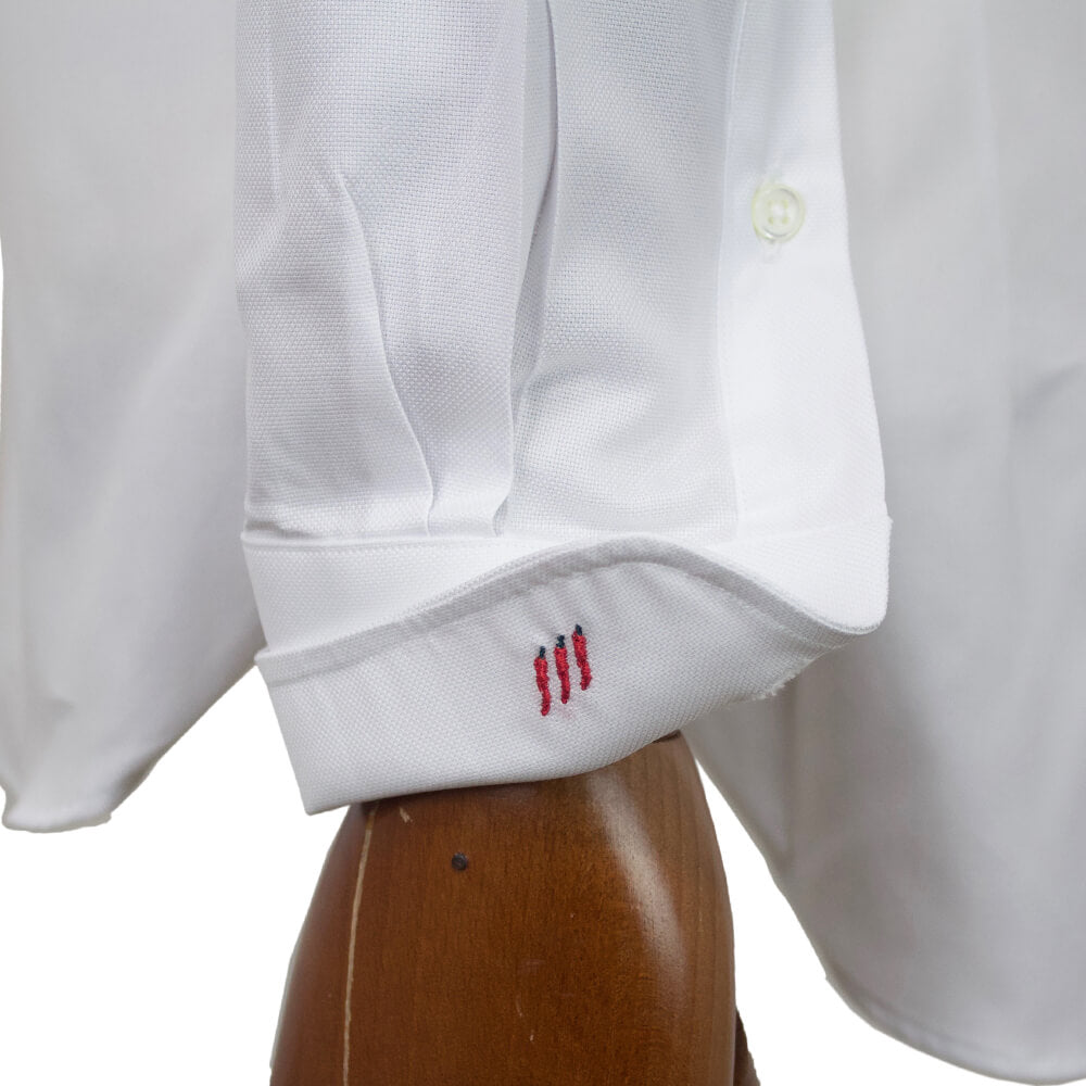 左袖裏には唐辛子の刺繍が施されています。イタリアで唐辛子は、愛する人の不貞を防いだりギャンブラーの験担ぎに使ったりビジネスマンが交渉時のお助けグッズにしたり、と幅広く愛されるラッキーアイテムとされているのだとか。幸運を呼ぶシャツにという想いも込められたアイテムです。