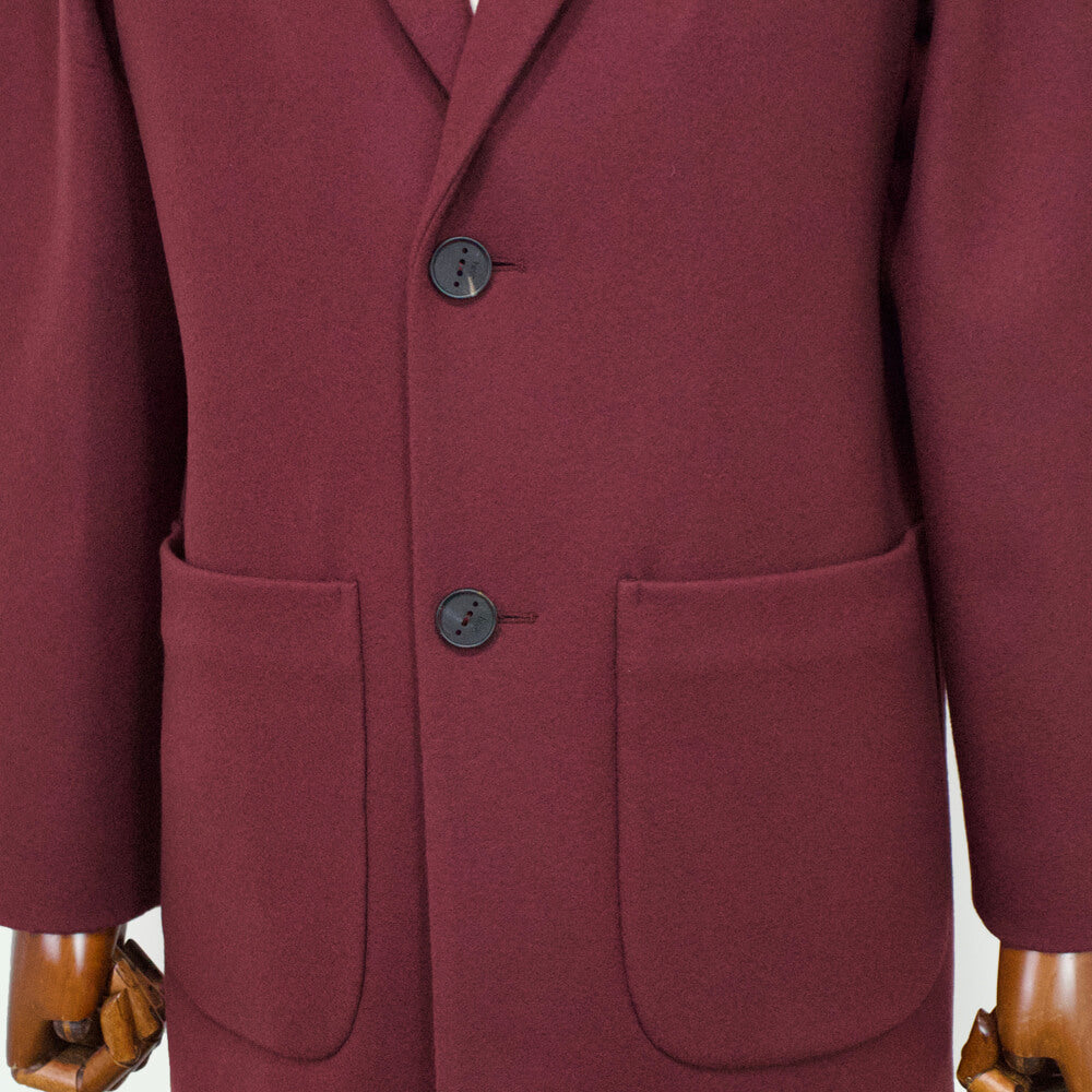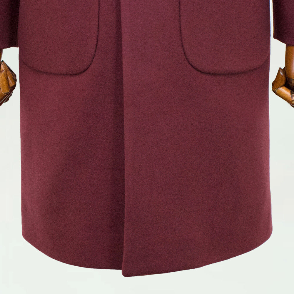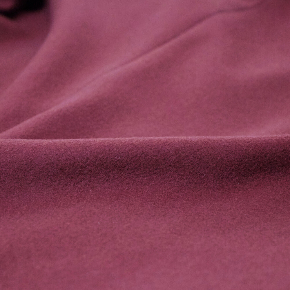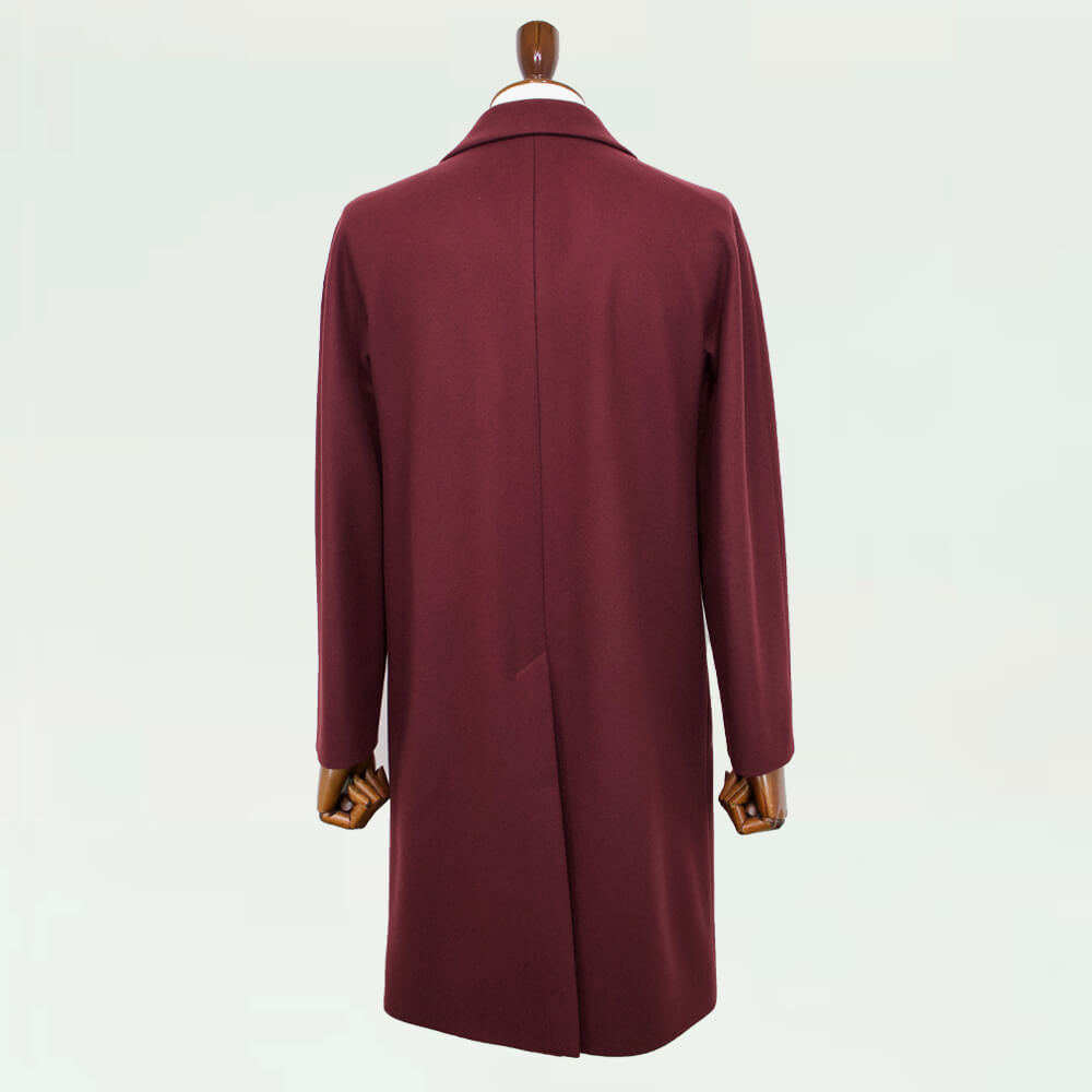 子羊から初めて刈られる毛で作られる、柔らかく保温力の高い「ヴァージンウール」のメルトン生地で作られたダブルフロントのベルテッドコートです。ウール素材にナイロンを混紡した生地は上品なツヤと肌当たりの良い質感を残しつつ、生地に耐久性と程良いコシを作り上げています。裏地には全面ナイロン×ポリエステル生地が使われており、肌当たりがよく保温性も期待できます。