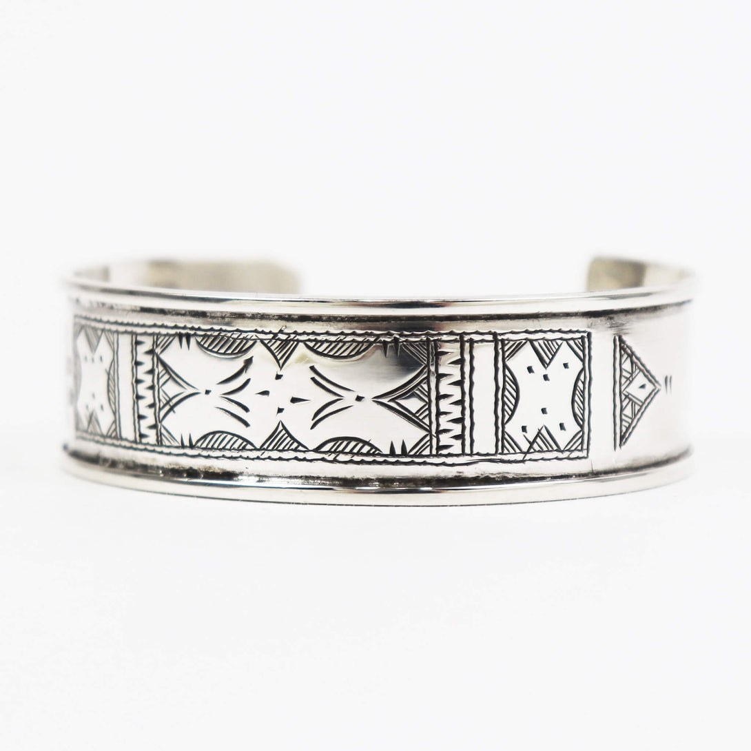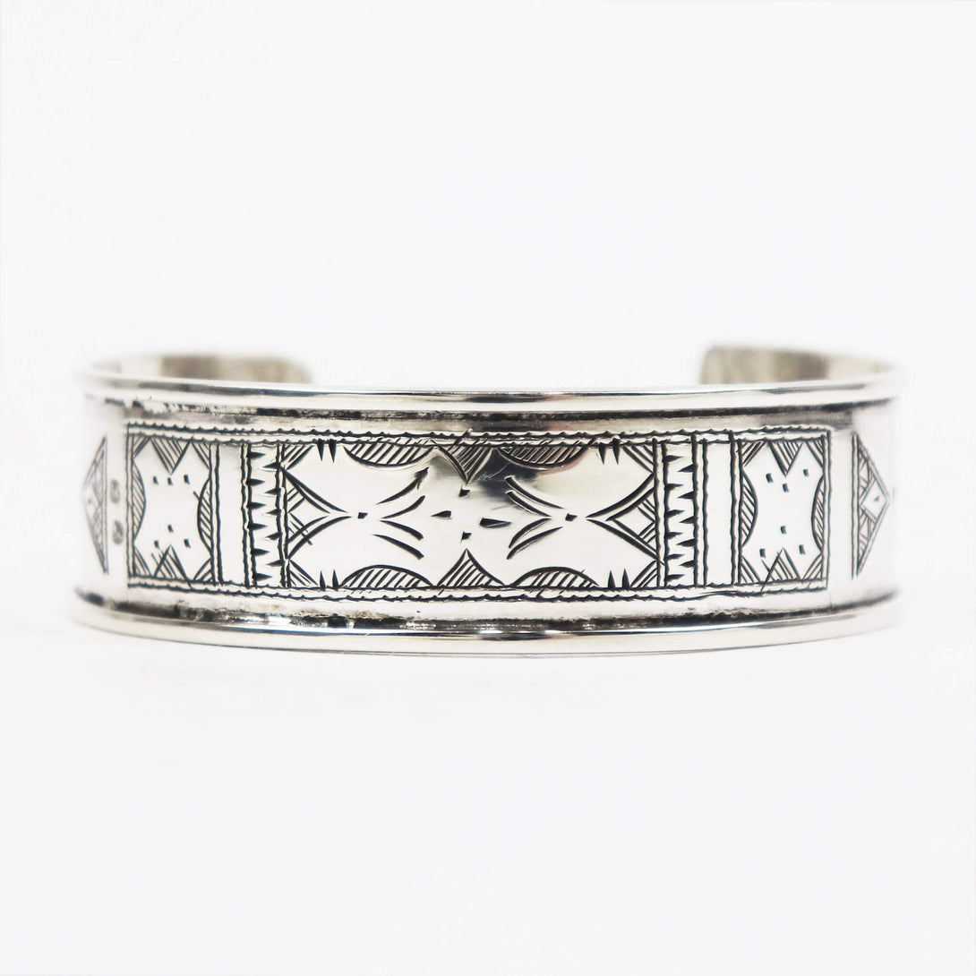 北アフリカの先住民族の言語で"道"を意味するモチーフ「Agharass / アガラス」のブレスレットです。表面の文様は1刀1刀が手彫りで彫られ、その文様にはそれぞれ意味があり、事物、物語、寓意などを象徴しています。中央の鋸刃のようなデザインが特徴になり、華奢なフォルムですが目を引くデザインなので他のブレスレットと重ね付けしたり、コーディネートのアクセントとしてご使用頂けます。