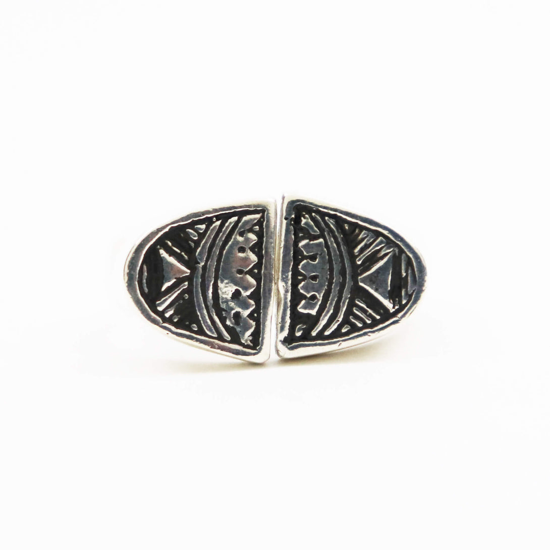 ヨーロッパではインディアンジュエリーと双璧をなすネイティブジュエリーとしても認知されている、ベルベル人系遊牧民トゥアレグ族伝統の銀細工が施されています。表面の文様は1刀1刀手彫りで丁寧に彫られ、その文様にはそれぞれ意味があり、事物、物語、寓意などを象徴しています。エ◯メスが惚れ込む彫金技術をもつアダワットゥントゥアレグのジュエリーはシンプルになりがちなコーディネートを少し華やかにしてくれる、そんな存在となります。