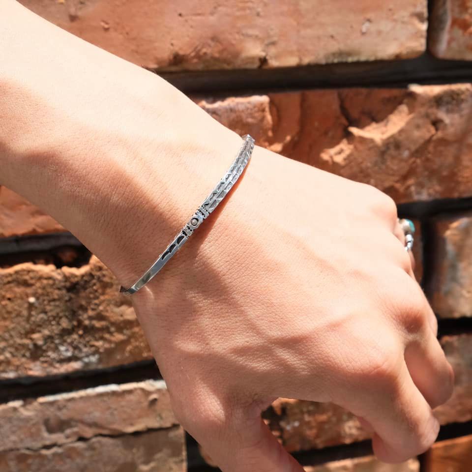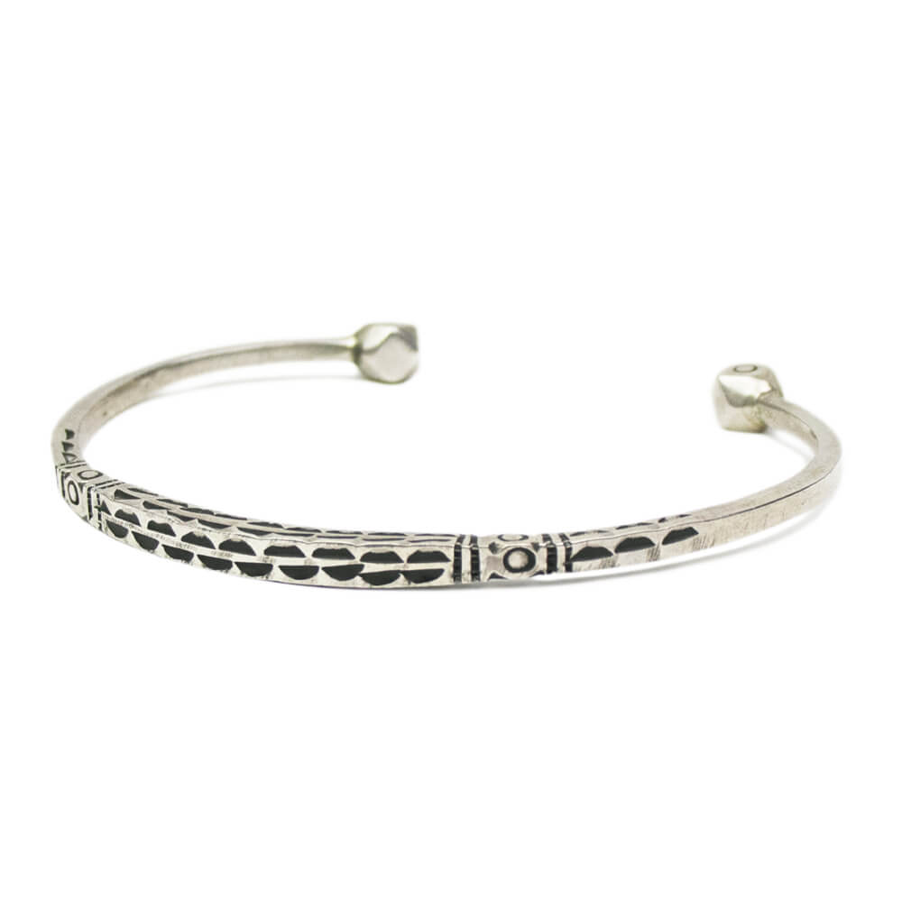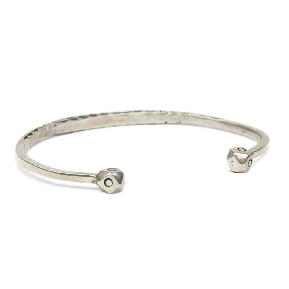 北アフリカの先住民族の言語で"雲"を意味するモチーフ「Ismawn / イスマウン」のブレスレットです。表面の文様は1刀1刀が手彫りで丁寧に彫られ、その文様にはそれぞれ意味があり、事物、物語、寓意などを象徴しています。とても細かな細工の中にシンプルな上品さを感じることのできるデザインや、エンドの12面体の装飾が特徴になります。目を引くデザインですが華奢なので他のブレスレットと重ね付けしたり、コーディネートのアクセントとしてご使用頂けます。