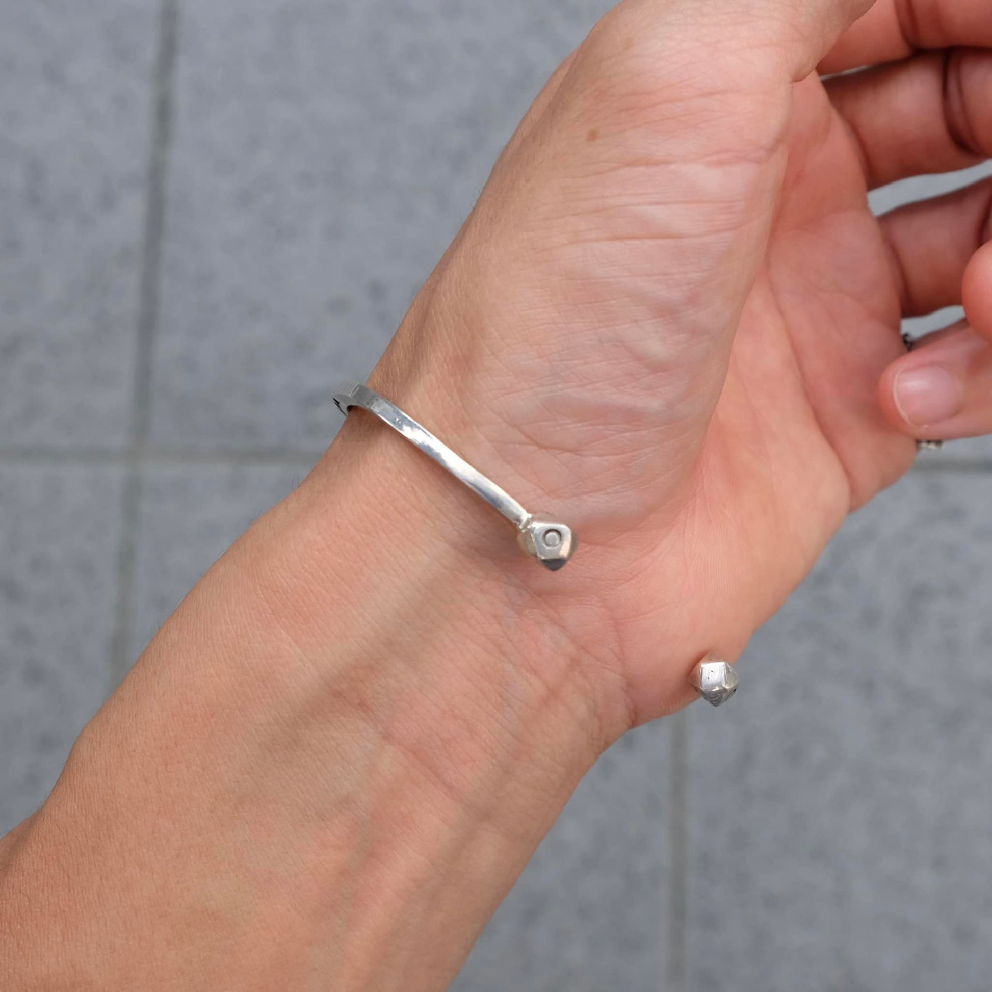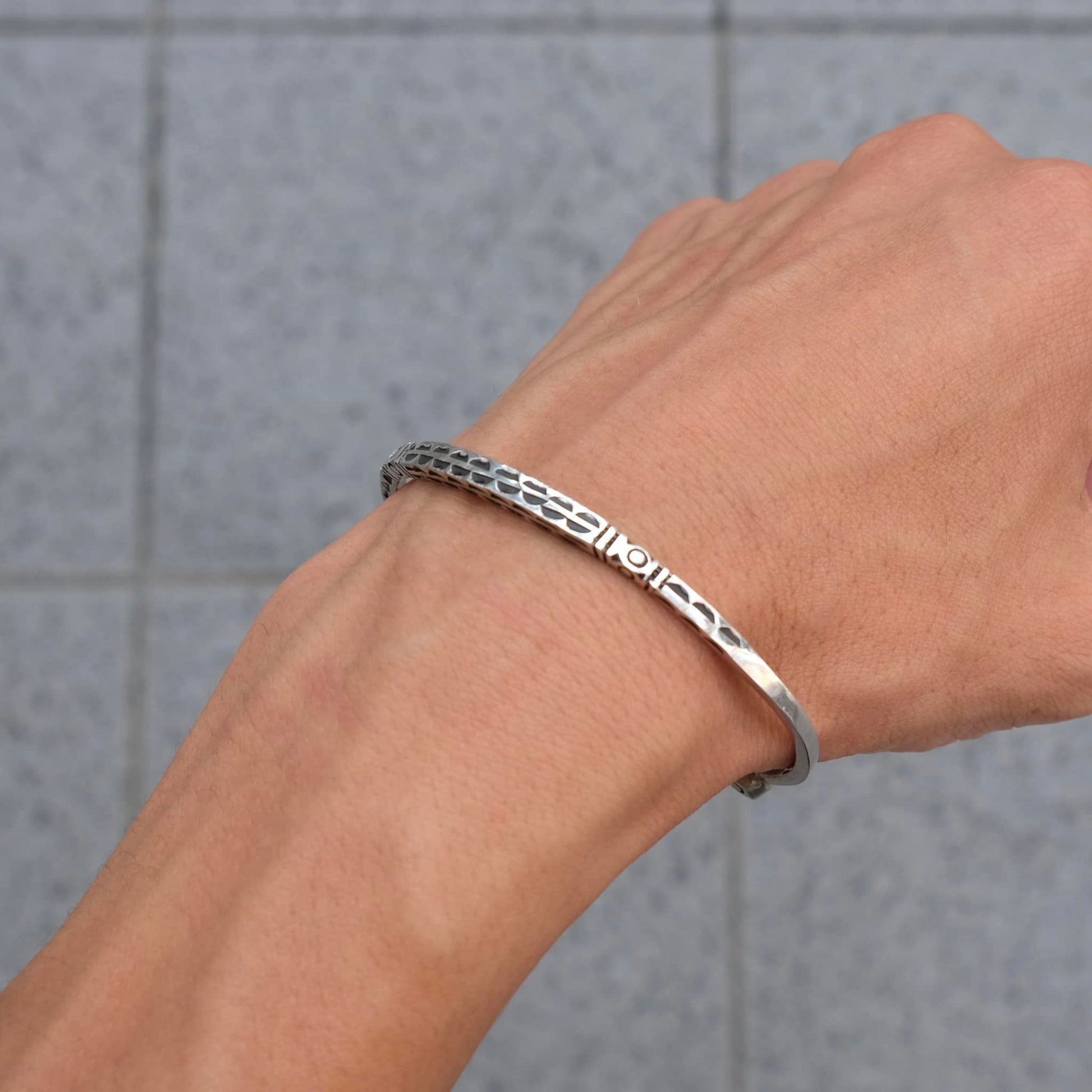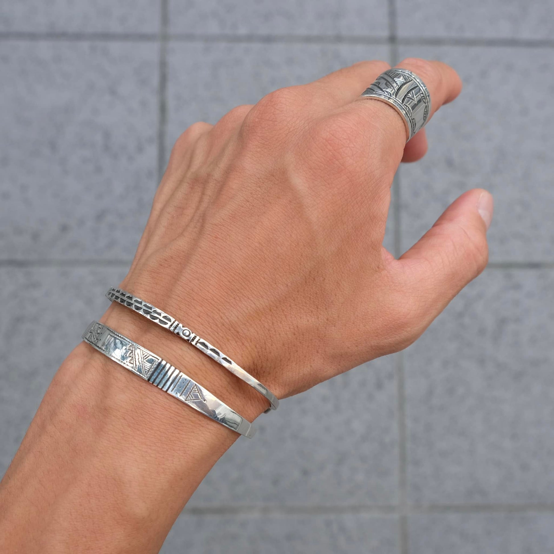 北アフリカの先住民族の言語で"雲"を意味するモチーフ「Ismawn / イスマウン」のブレスレットです。表面の文様は1刀1刀が手彫りで丁寧に彫られ、その文様にはそれぞれ意味があり、事物、物語、寓意などを象徴しています。とても細かな細工の中にシンプルな上品さを感じることのできるデザインや、エンドの12面体の装飾が特徴になります。目を引くデザインですが華奢なので他のブレスレットと重ね付けしたり、コーディネートのアクセントとしてご使用頂けます。