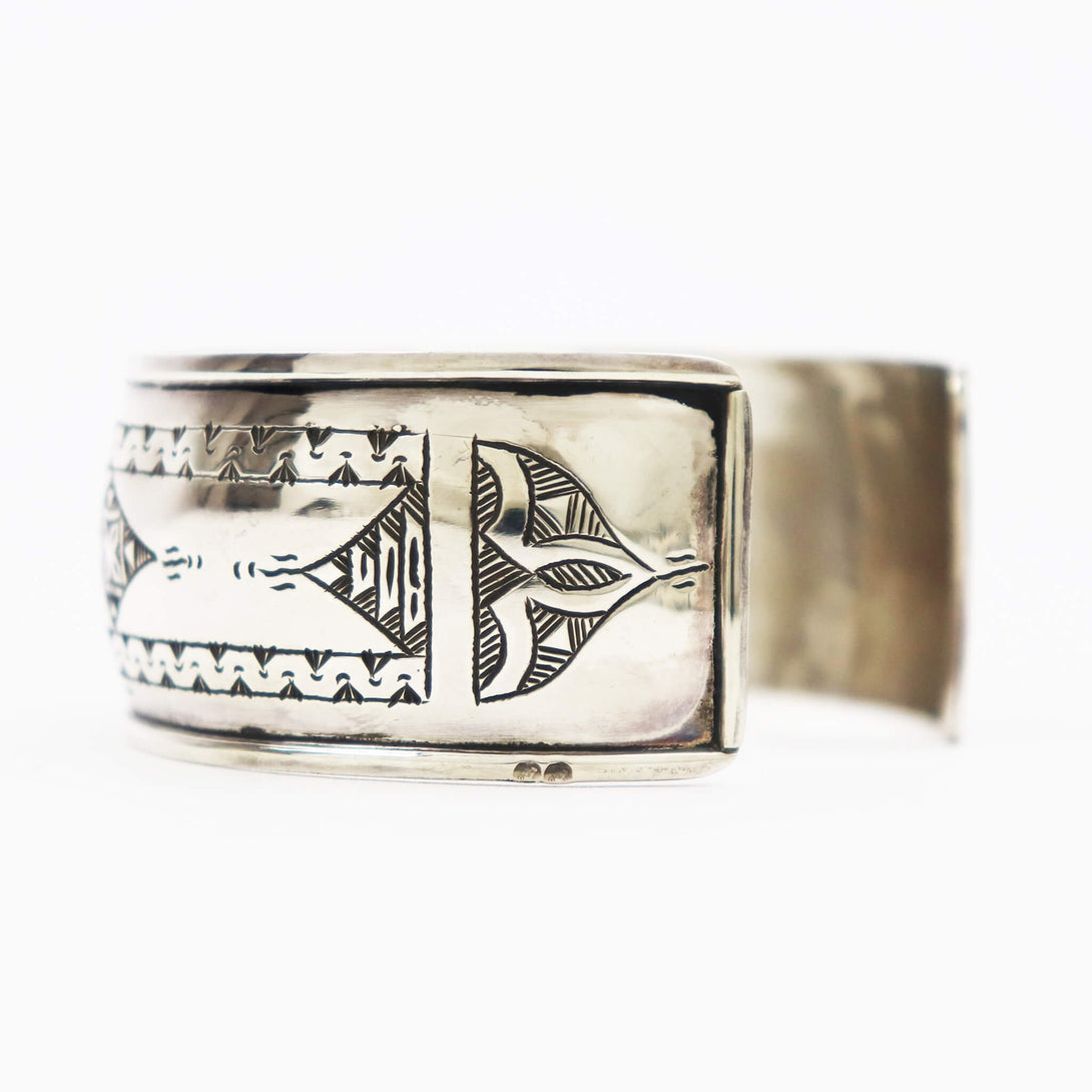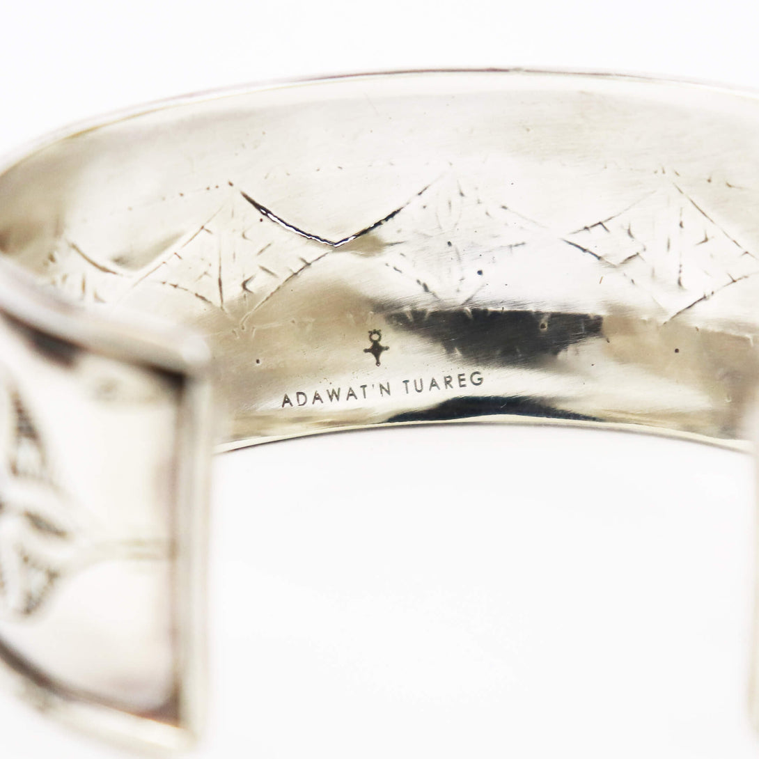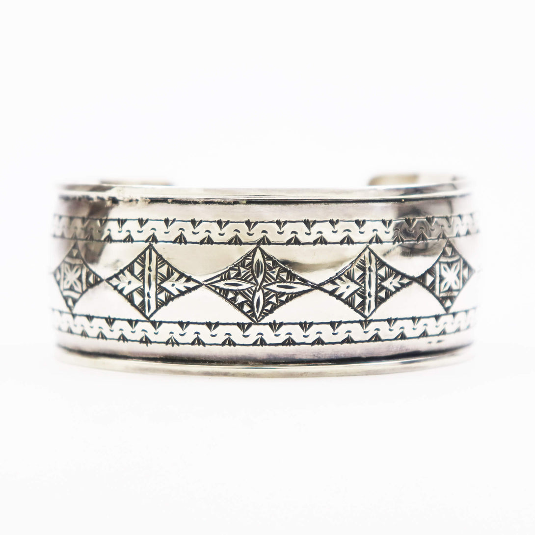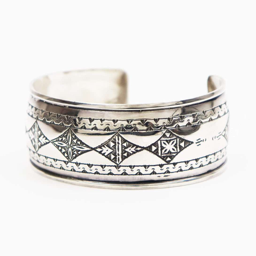 北アフリカの先住民族の言語で"木"を意味するモチーフ「Isskla/イスクラ」のブレスレットです。 表面の文様は1刀1刀が手彫りで丁寧に彫られ、その文様にはそれぞれ意味があり、事物、物語、寓意などを象徴しています。 ボリュームのあるブレスレットのため存在感があり、緩やかな曲線と中央に彫られた菱形の文様が美しくエレガントな一品です。 目を引くデザインのため、シンプルなスタイルをはじめ様々なコーディネートのアクセントとしてご使用頂けます。