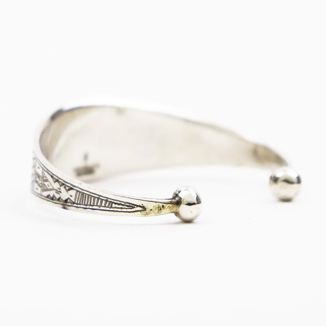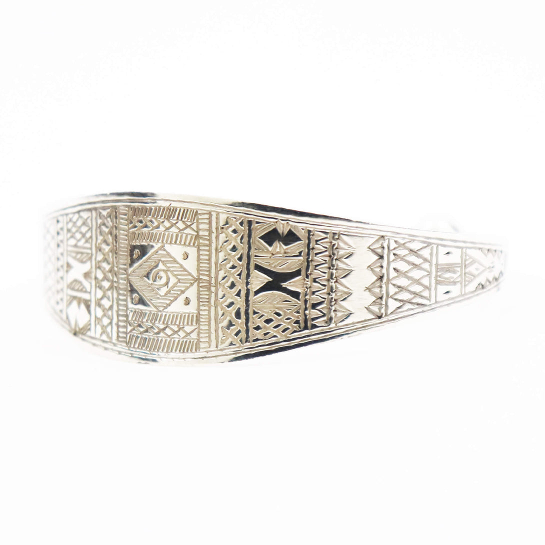 一つ一つ手彫りで丁寧に彫られた表面の美しい文様には、それぞれ意味があり、事物、物語、寓意などを象徴しています。決してボリュームのあるブレスレットではありませんが、面一杯に彫られた文様が贅沢な存在感を演出してくれるAdawat'n Tuareg/アダワット・トゥアレグらしい作品です。細かく彫られた文様は存在感があり、コーディネートのアクセントとしてご使用頂けます。