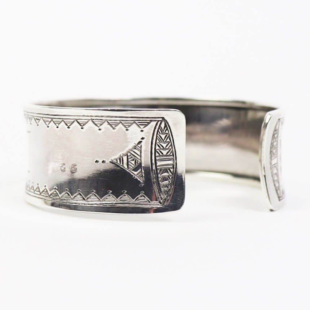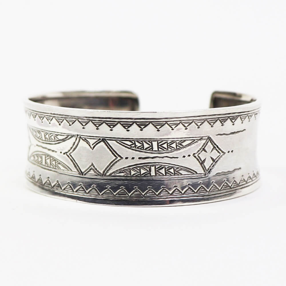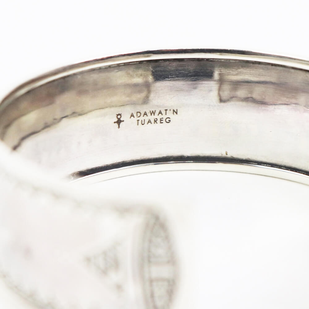 一つ一つ手彫りで丁寧に彫られた表面の美しい文様には、それぞれ意味があり、事物、物語、寓意などを象徴しています。決してボリュームのあるブレスレットではありませんが、面一杯に彫られた文様が贅沢な存在感を演出してくれるAdawat'n Tuareg/アダワット・トゥアレグらしい作品です。細かく彫られた文様は存在感があり、コーディネートのアクセントとしてご使用頂けます。