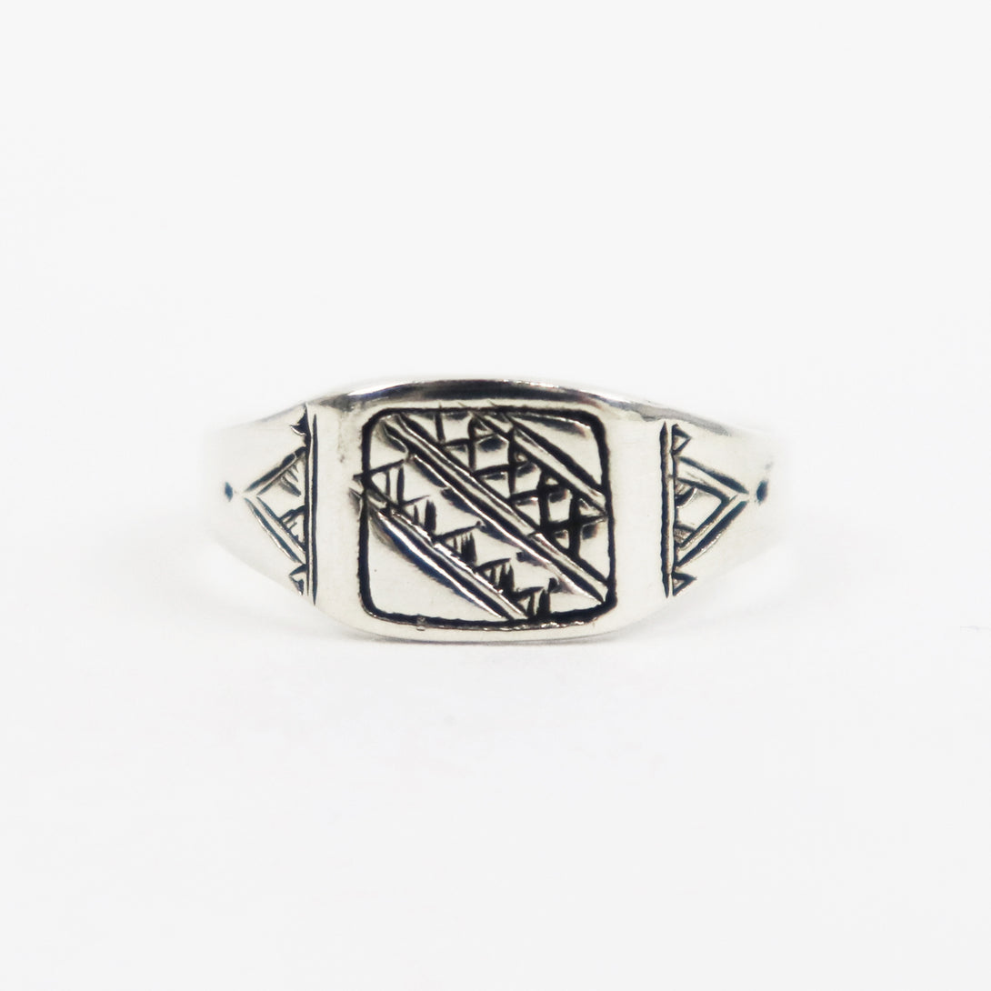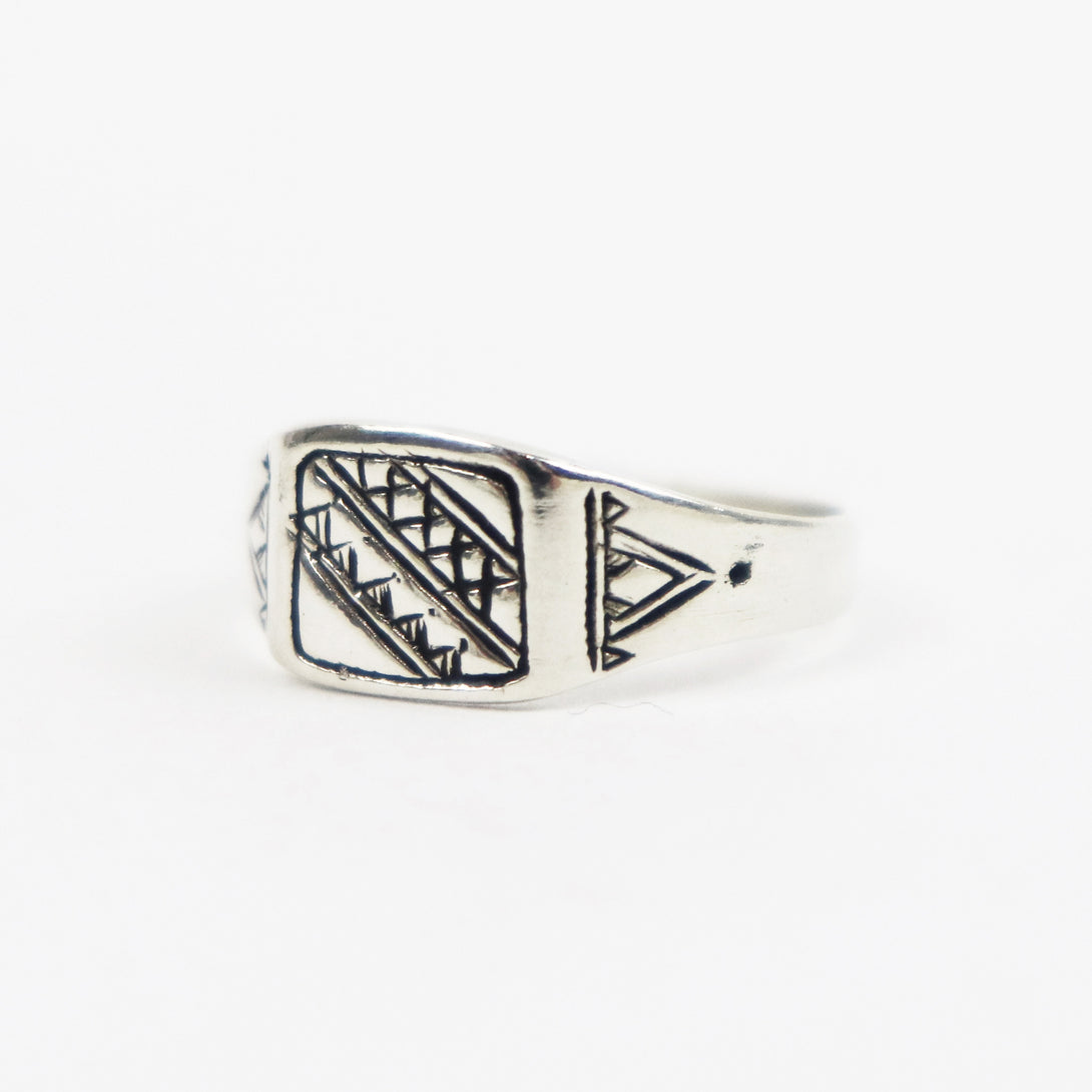 ヨーロッパではインディアンジュエリーと双璧をなすネイティブジュエリーとしても認知されている、ベルベル人系遊牧民トゥアレグ族伝統の銀細工が施されています。表面の文様は1刀1刀手彫りで丁寧に彫られ、その文様にはそれぞれ意味があり、事物、物語、寓意などを象徴しています。エ◯メスが惚れ込む彫金技術をもつアダワットゥントゥアレグのジュエリーはシンプルになりがちなコーディネートを少し華やかにしてくれる、そんな存在となります。