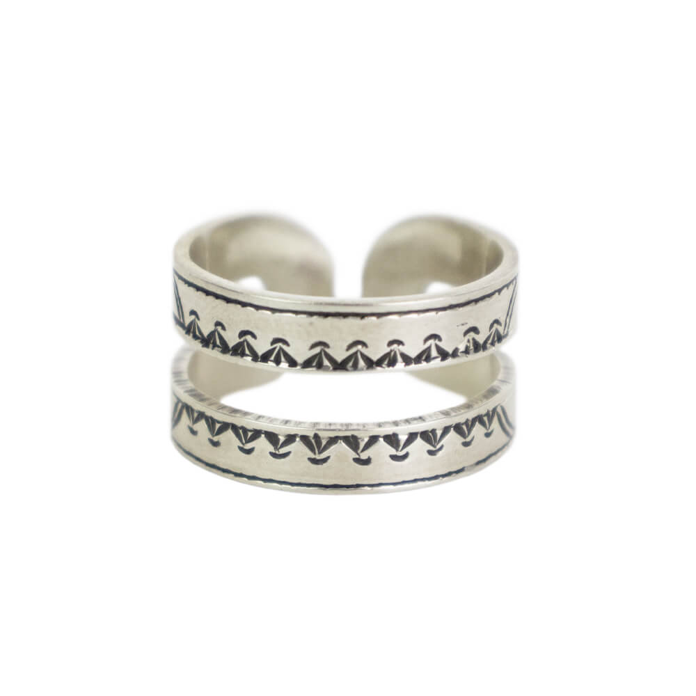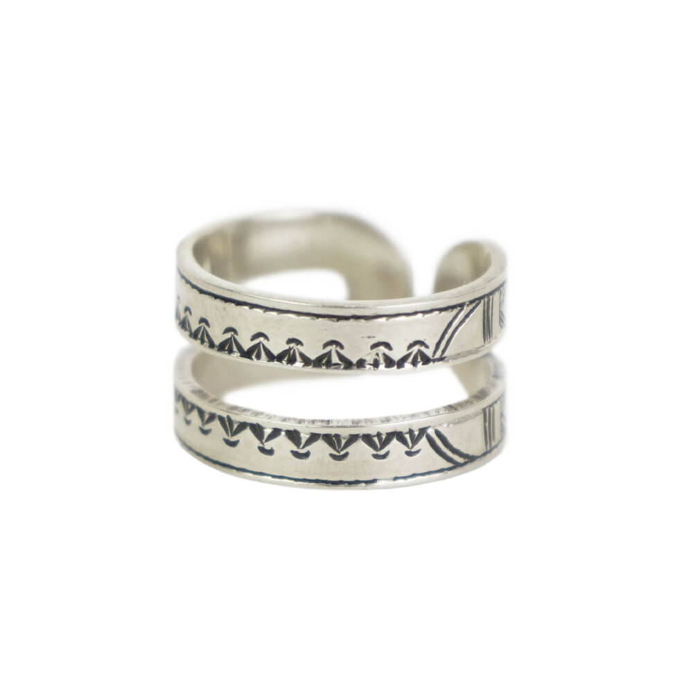 北アフリカの先住民族の言語で楕円形を意味するZezi tissght / ゼジィ ティサットのリングを2つ重ね付けしているように見えるデザインは、実にアダワットゥントゥアレグらしいデザインとなっています。 リングのサイズをエンド部分の開閉で多少変えることができるので、気分で付ける指を選べるのも魅力的ですね。