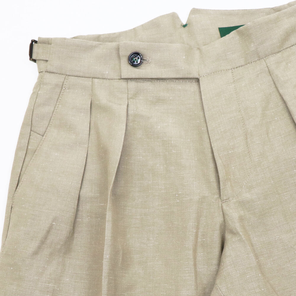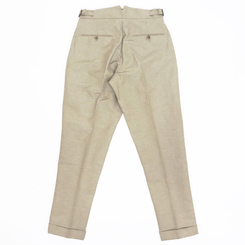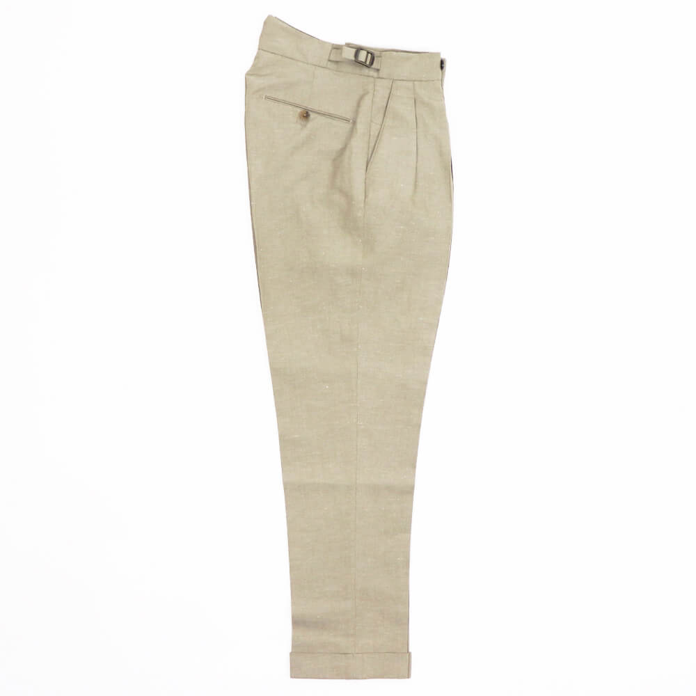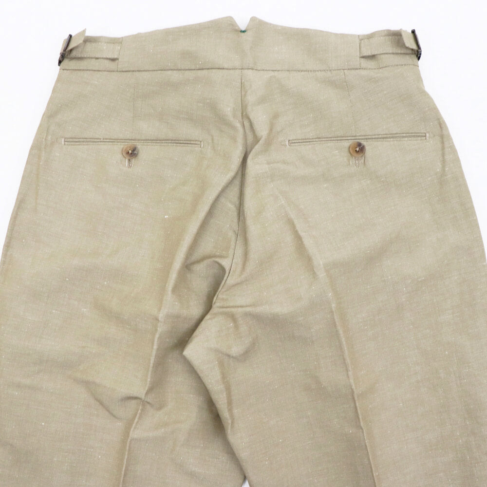 BERWICHを代表するモデル"SCOTCH(スコッチ)”2プリーツが入りサイドアジャスターが付くクラシカルな仕様で、ゆったりとした腰回りと裾口にかけての美しいテーパードが目を惹くモダンクラシックな表情が特徴です。生地は、春夏にピッタリなコットンリネン。清涼感ある大人のカジュアルスタイルにピッタリな雰囲気となっています。