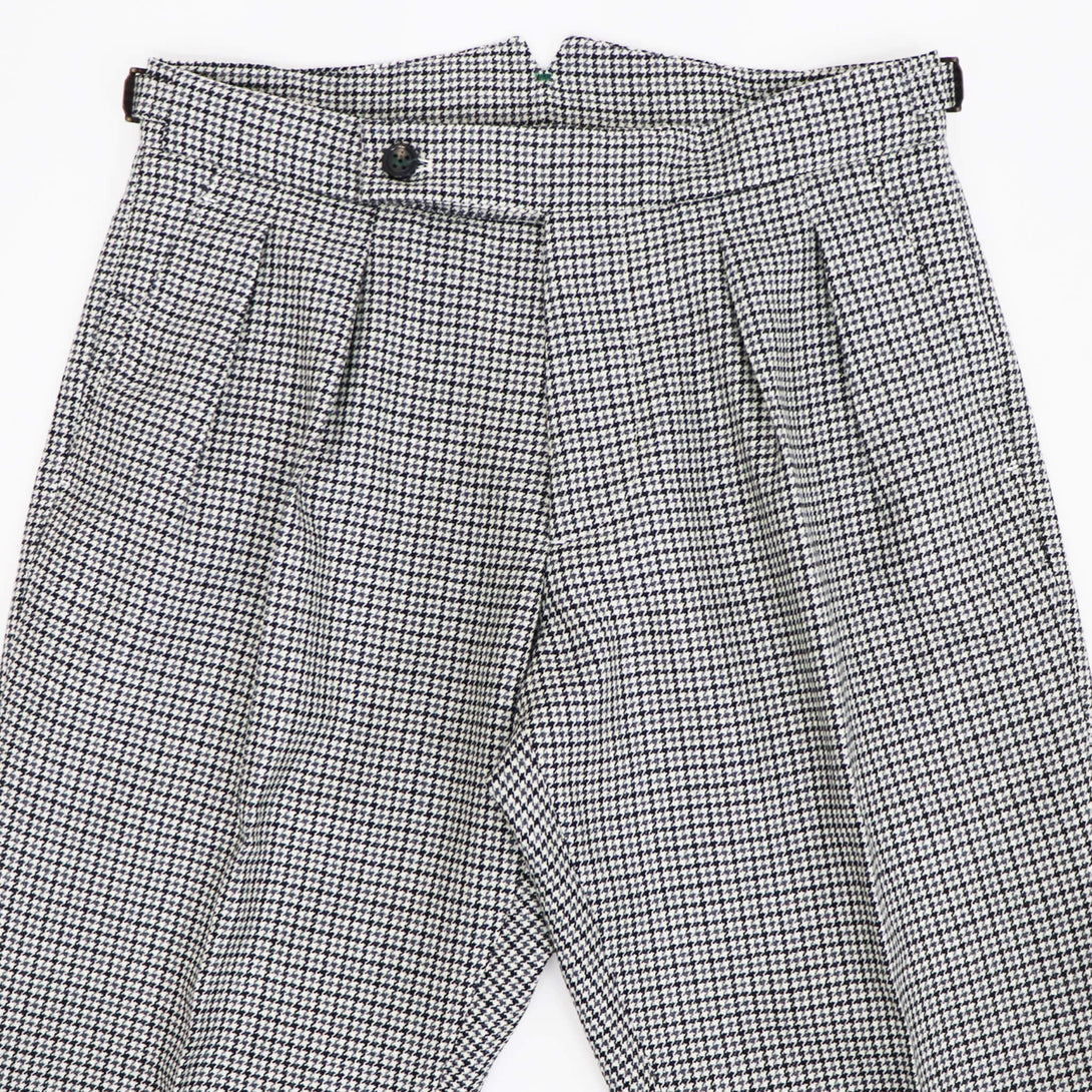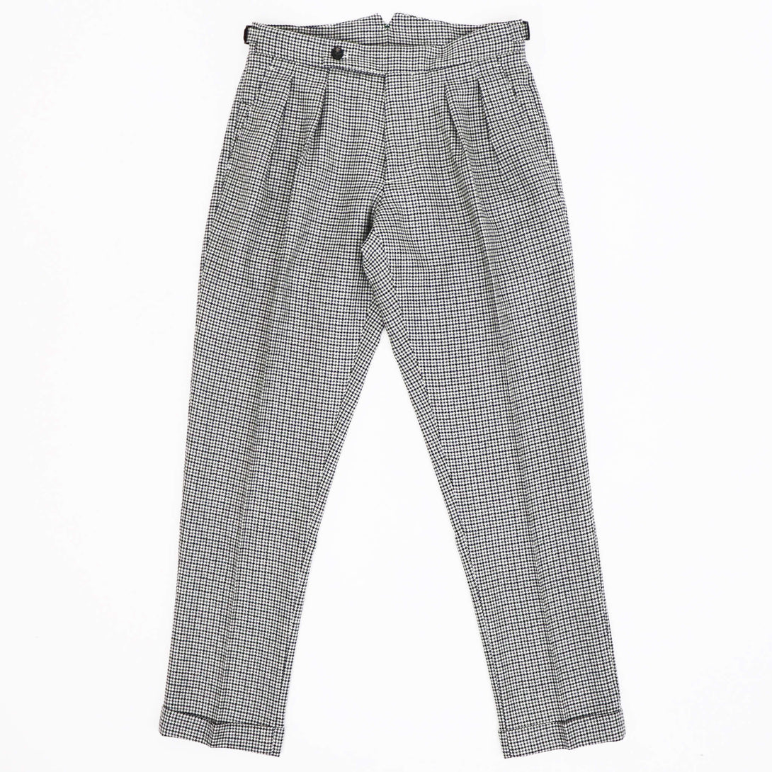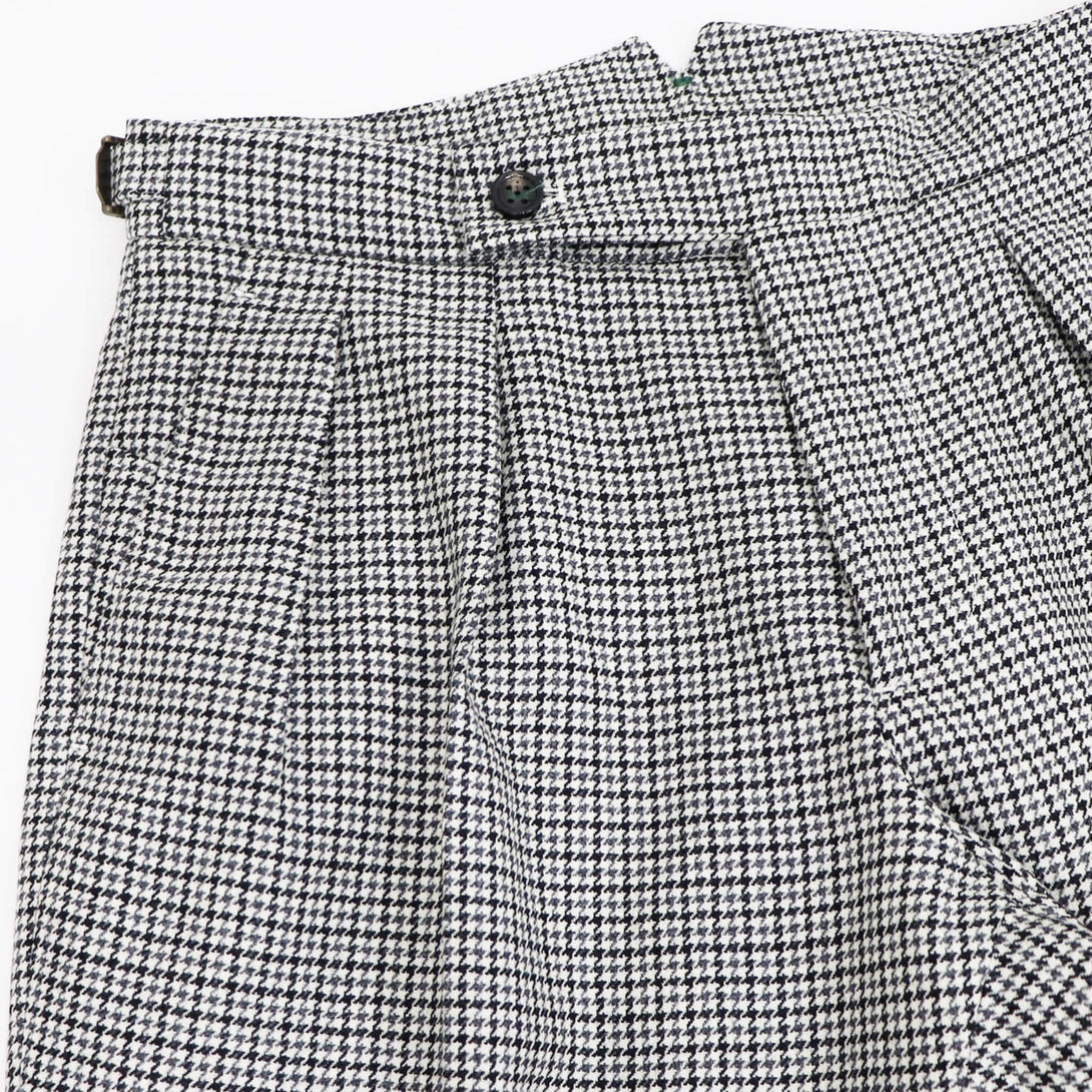 BERWICHを代表するモデルSCOTCH(スコッチ)は、2プリーツが入りサイドアジャスターが付くクラシカルな仕様で、ゆったりとした腰回りと裾口にかけての美しいテーパードが目を惹くモダンクラシックな表情が特徴のモデルとなっています。生地は、1830年に創設された老舗伊テキスタイルメーカー"Lanificio Campore(ラニフィシオ カンポーレ)"社製、ブラックとグレーの千鳥格子のウール100%です。クラシカルな柄とモダンなシルエットで大人なスタイリングに仕上がります。