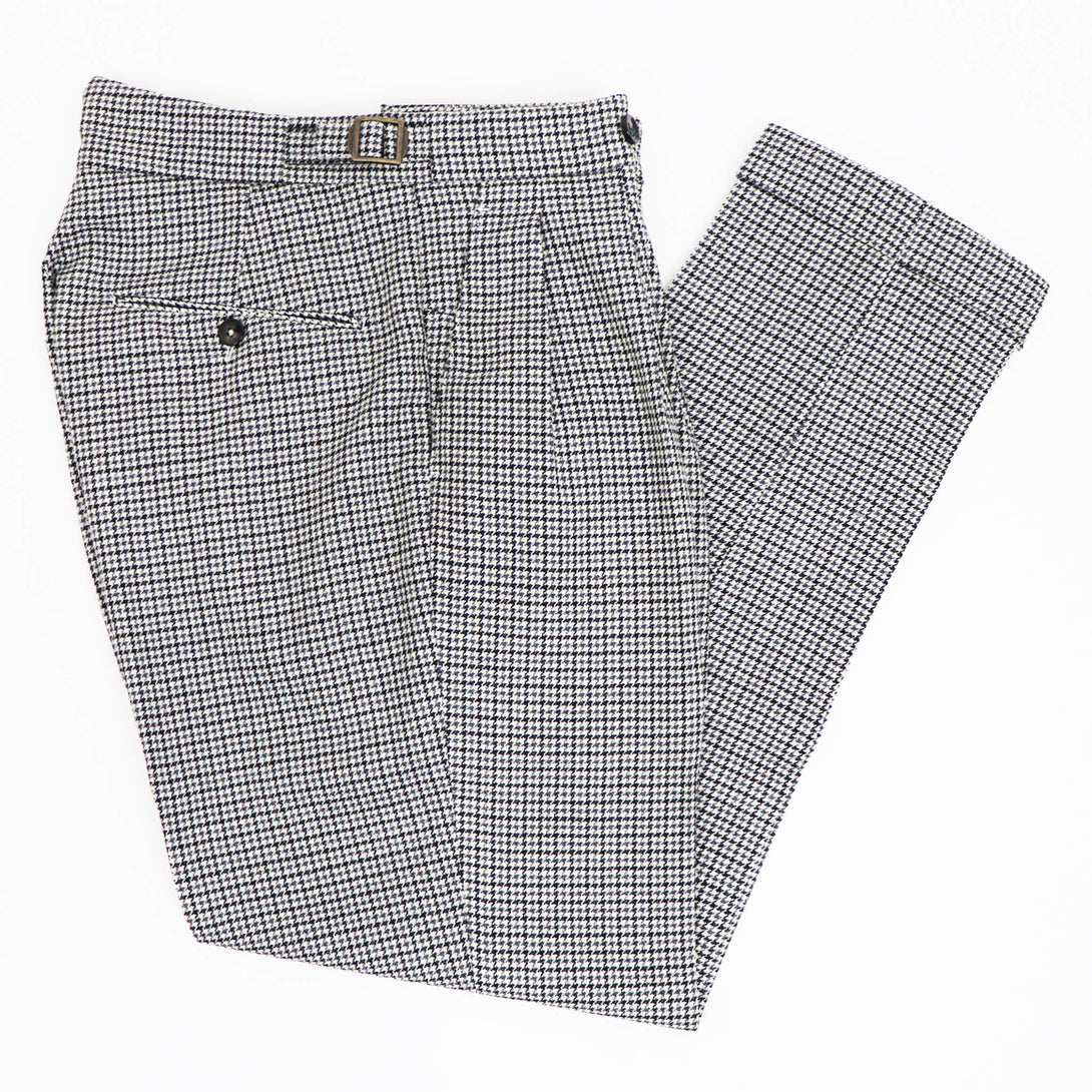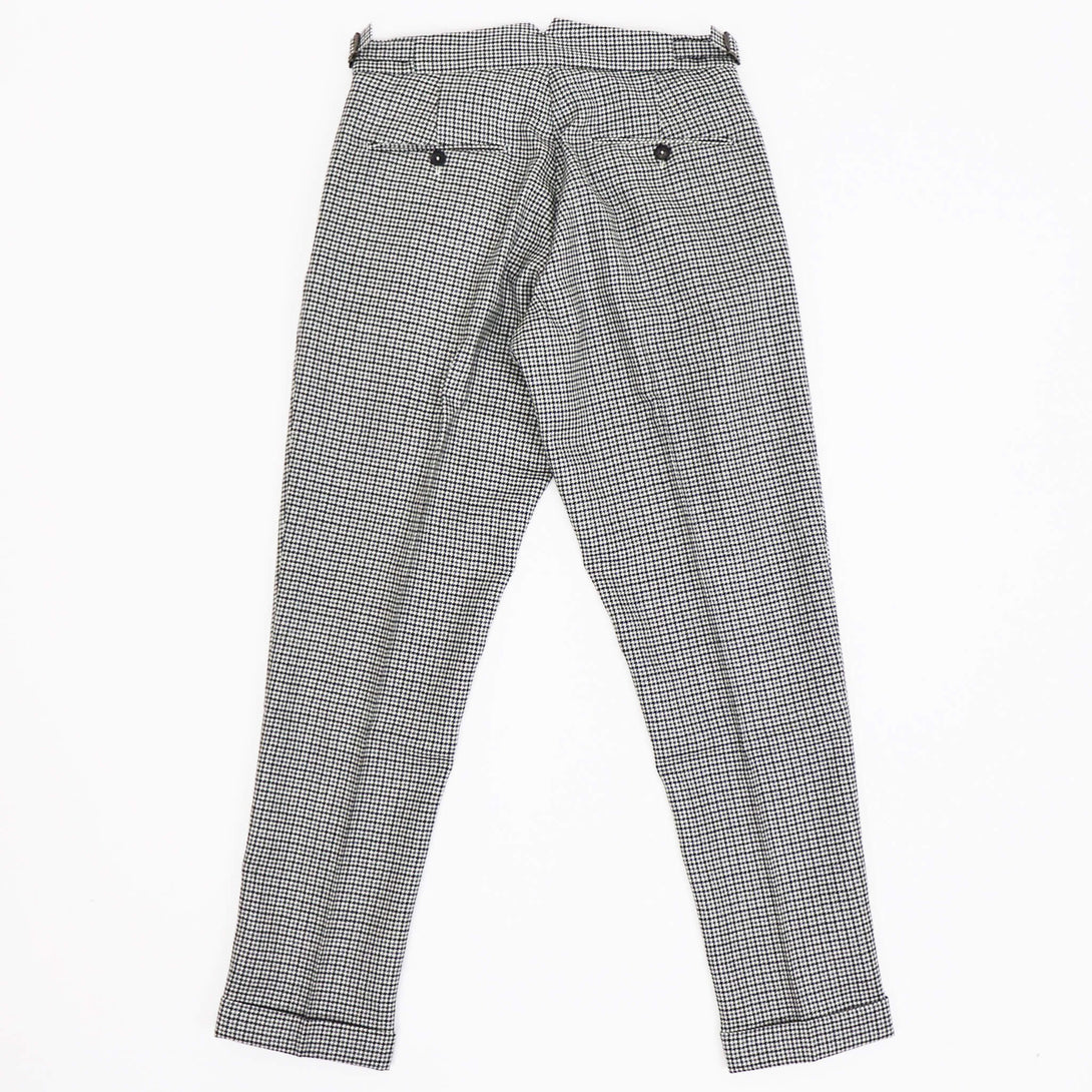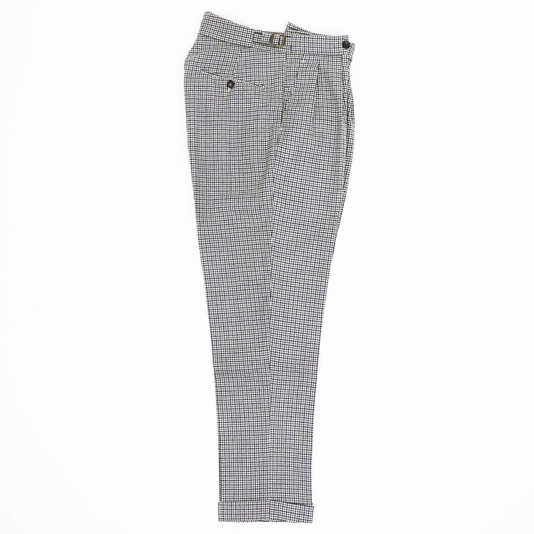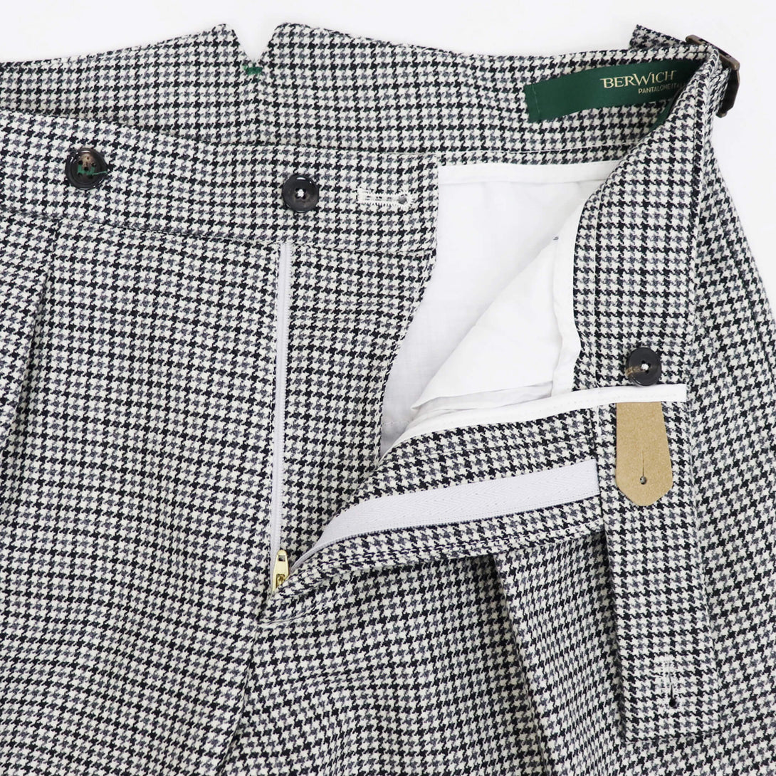 BERWICHを代表するモデルSCOTCH(スコッチ)は、2プリーツが入りサイドアジャスターが付くクラシカルな仕様で、ゆったりとした腰回りと裾口にかけての美しいテーパードが目を惹くモダンクラシックな表情が特徴のモデルとなっています。生地は、1830年に創設された老舗伊テキスタイルメーカー"Lanificio Campore(ラニフィシオ カンポーレ)"社製、ブラックとグレーの千鳥格子のウール100%です。クラシカルな柄とモダンなシルエットで大人なスタイリングに仕上がります。