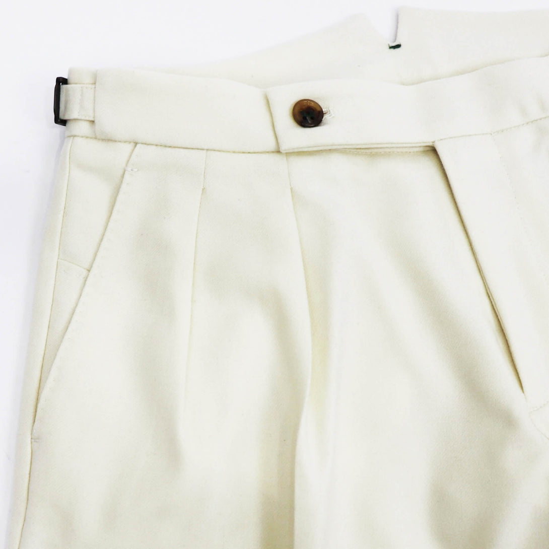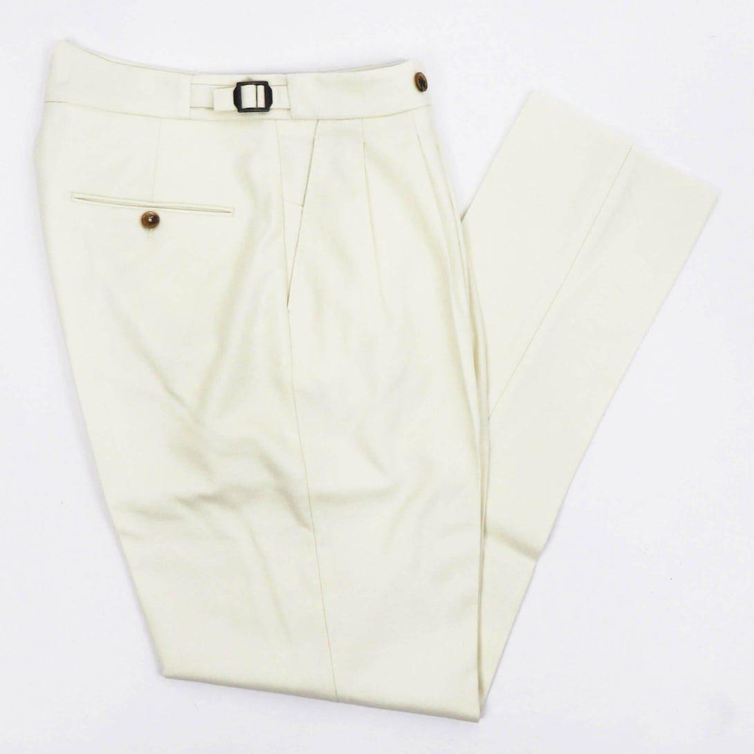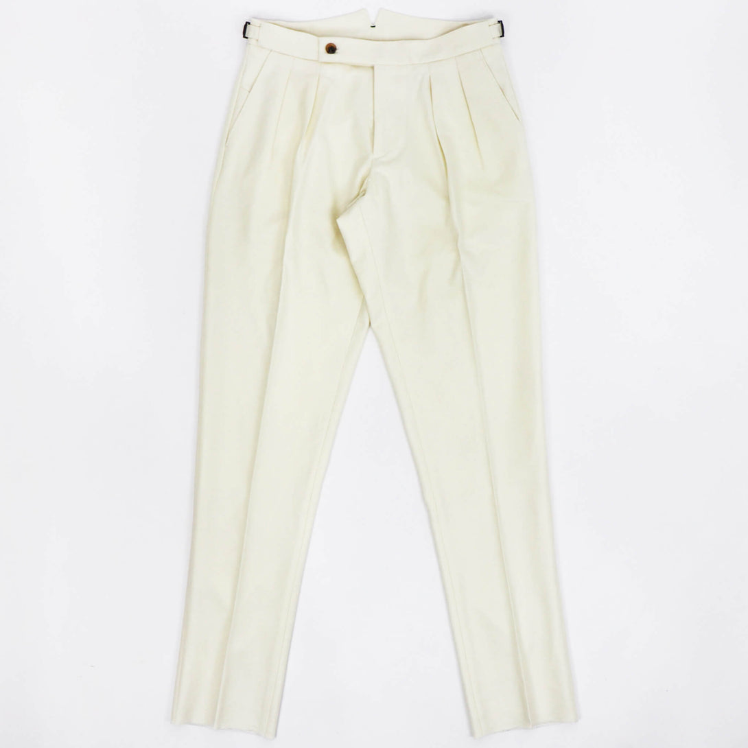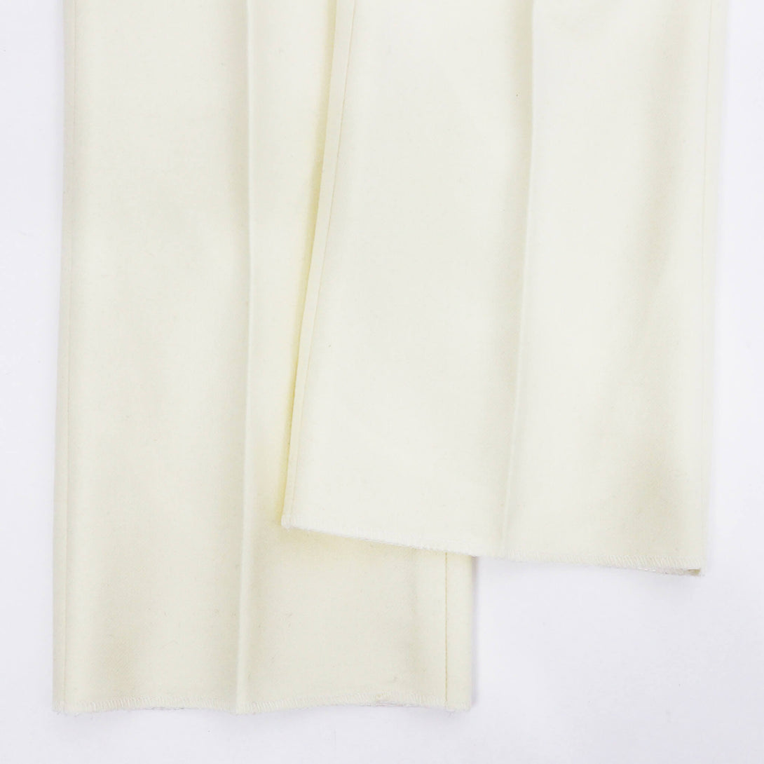 BERWICHを代表するモデルSCOTCH(スコッチ)は、2プリーツが入りサイドアジャスターが付くクラシカルな仕様で、ゆったりとした腰回りと裾口にかけての美しいテーパードが目を惹くモダンクラシックな表情が特徴のモデルとなっています。生地は、名門伊テキスタイルメーカーVITALE BARBERIS CANONICO(ヴィターレ バルベリス カノニコ)社のフランネルファブリックを採用。ラグジュアリーな印象のホワイトカラーとシルエットの相性が非常に良く、穿くだけで気品ある大人なスタイリングに仕上がります。