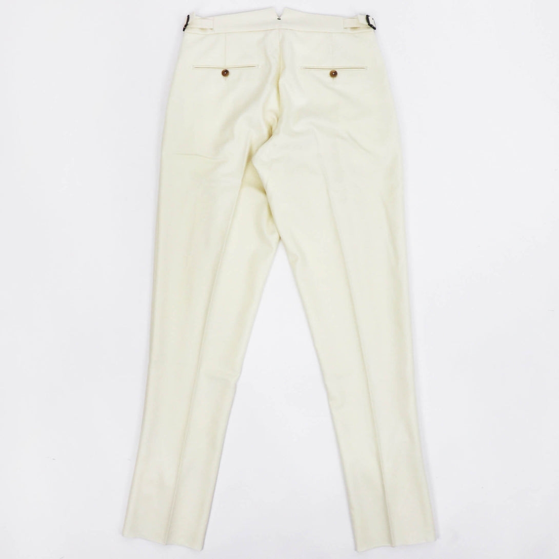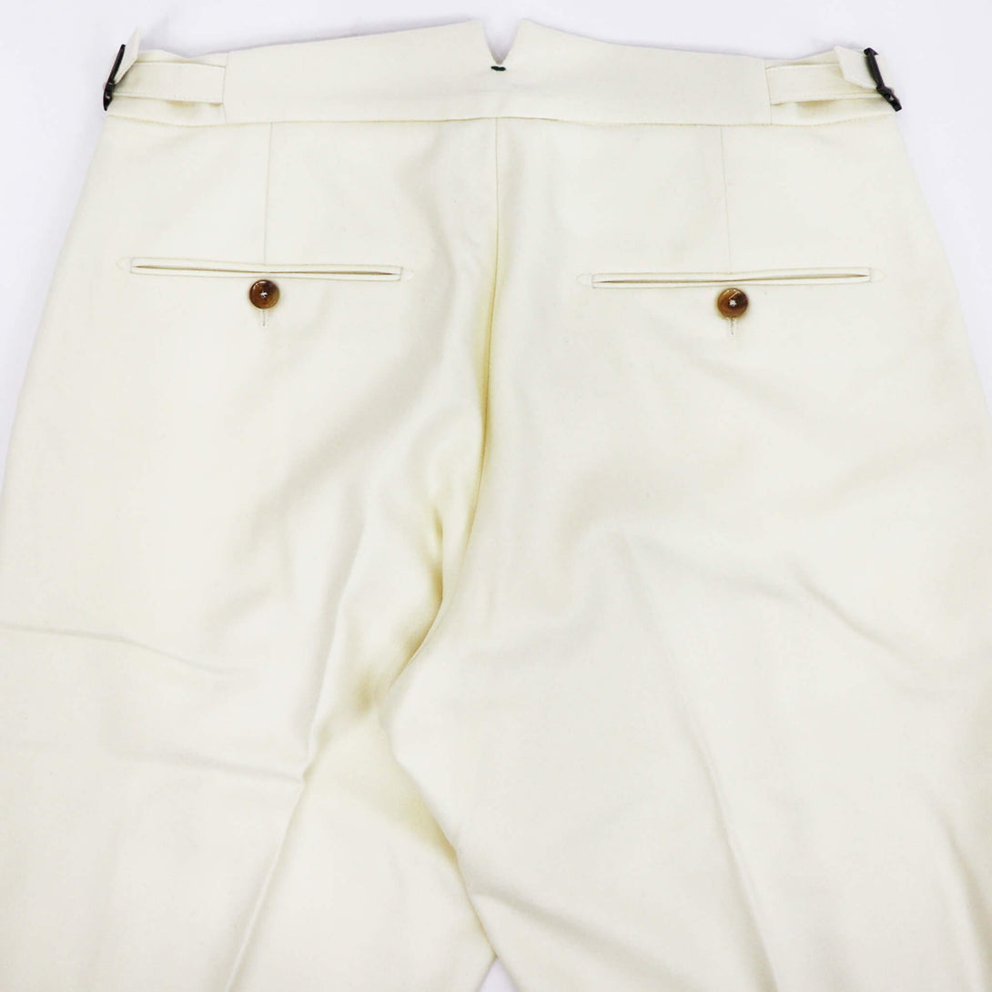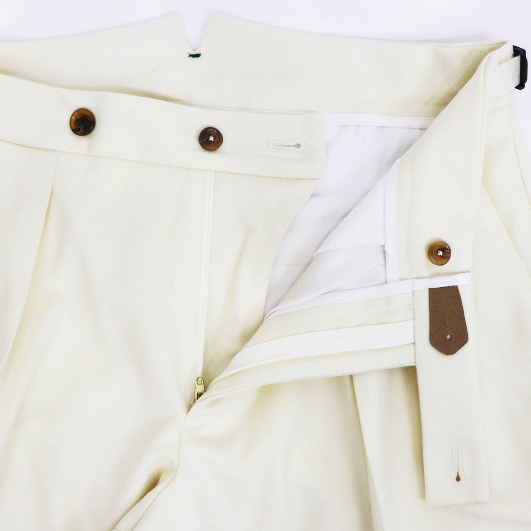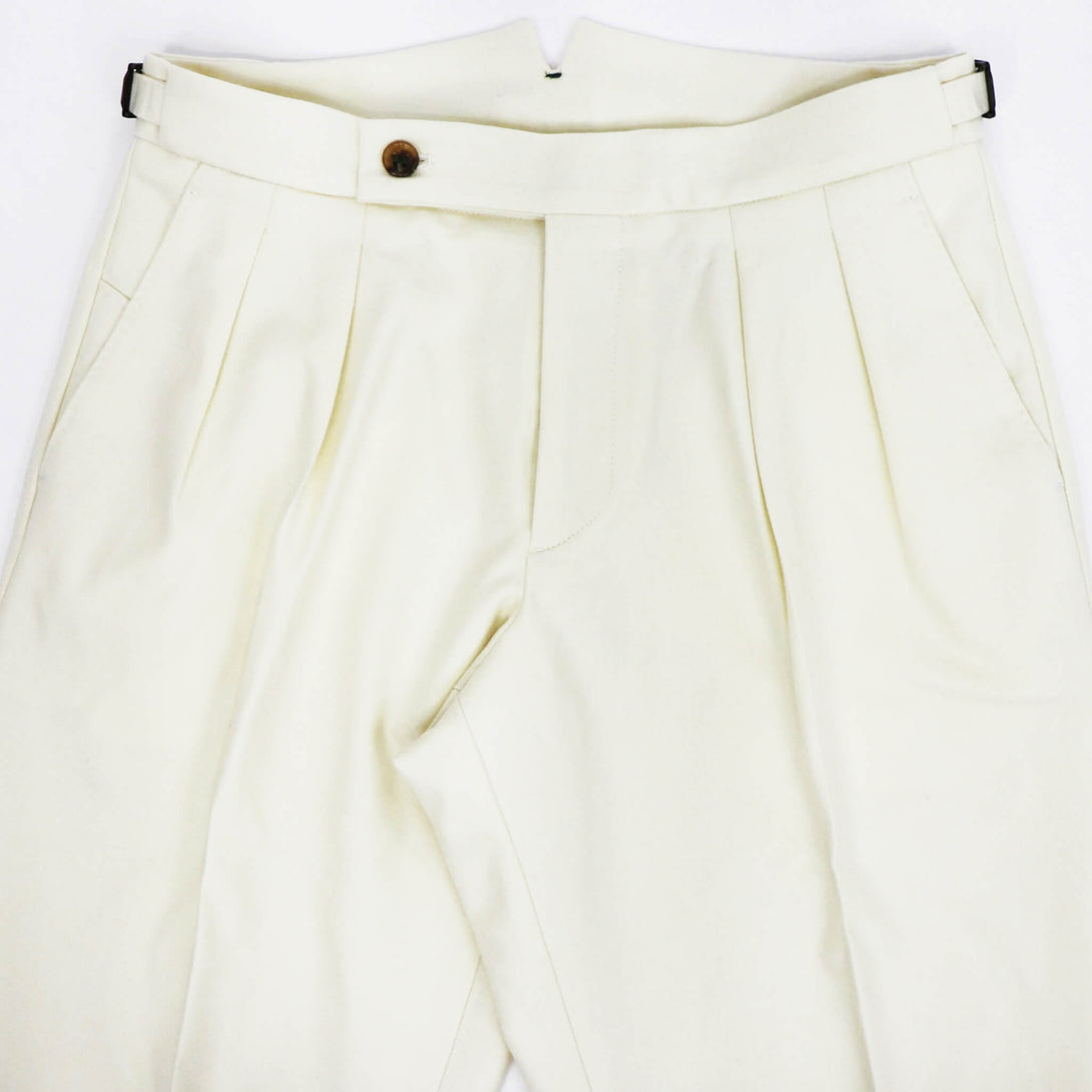 BERWICHを代表するモデルSCOTCH(スコッチ)は、2プリーツが入りサイドアジャスターが付くクラシカルな仕様で、ゆったりとした腰回りと裾口にかけての美しいテーパードが目を惹くモダンクラシックな表情が特徴のモデルとなっています。生地は、名門伊テキスタイルメーカーVITALE BARBERIS CANONICO(ヴィターレ バルベリス カノニコ)社のフランネルファブリックを採用。ラグジュアリーな印象のホワイトカラーとシルエットの相性が非常に良く、穿くだけで気品ある大人なスタイリングに仕上がります。