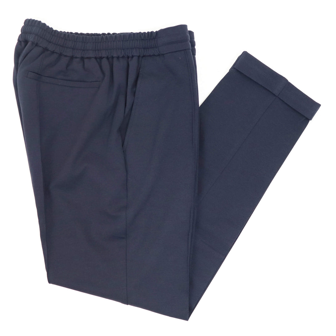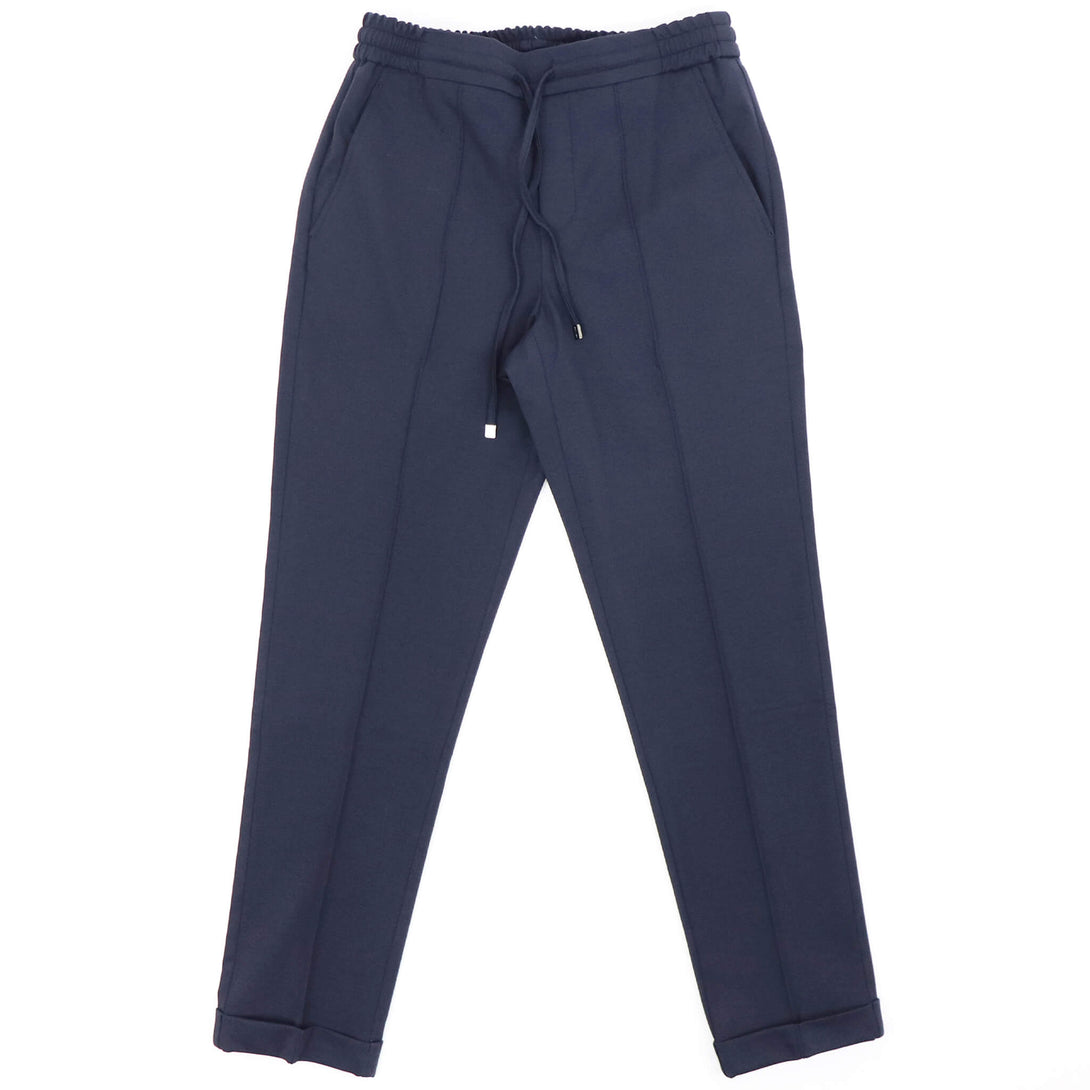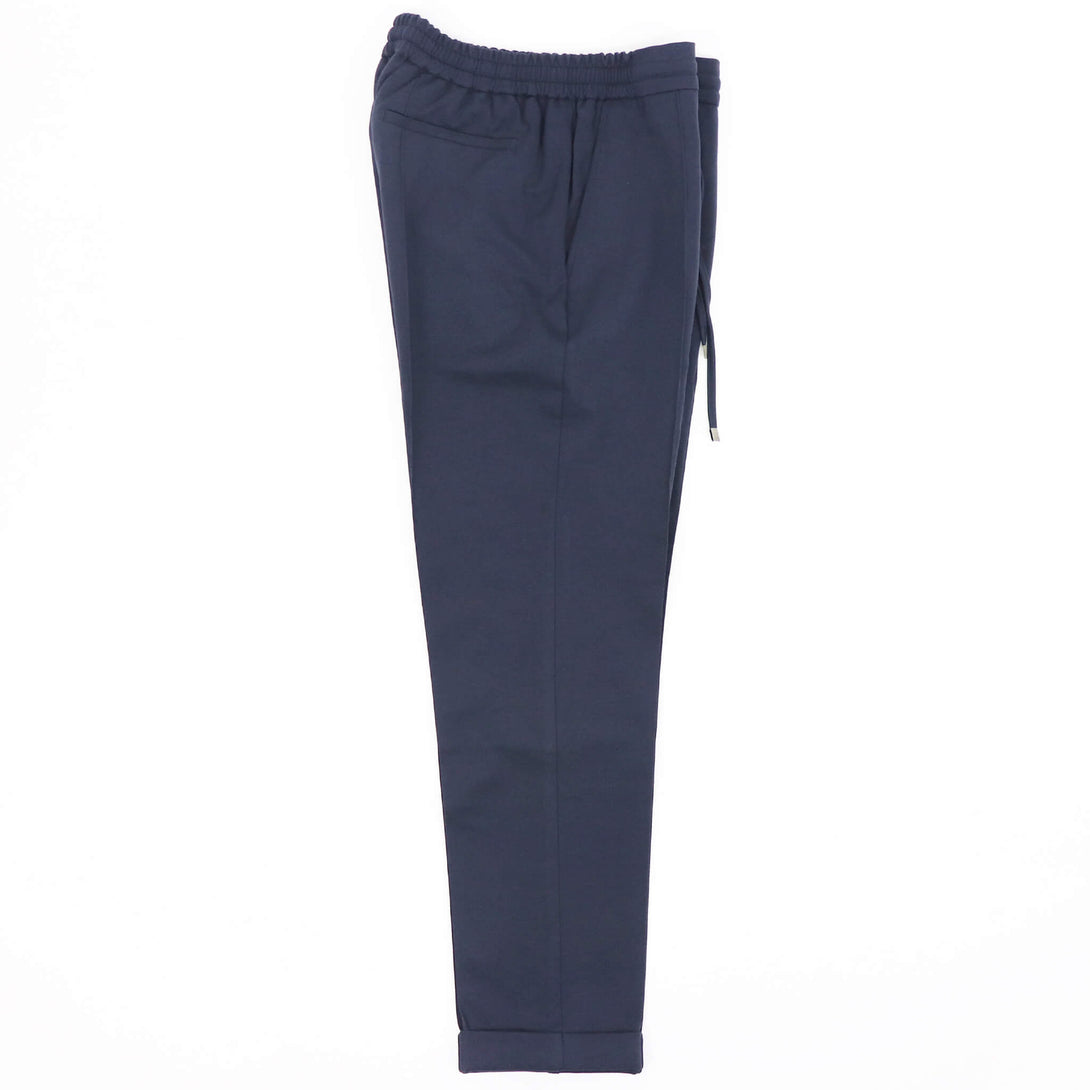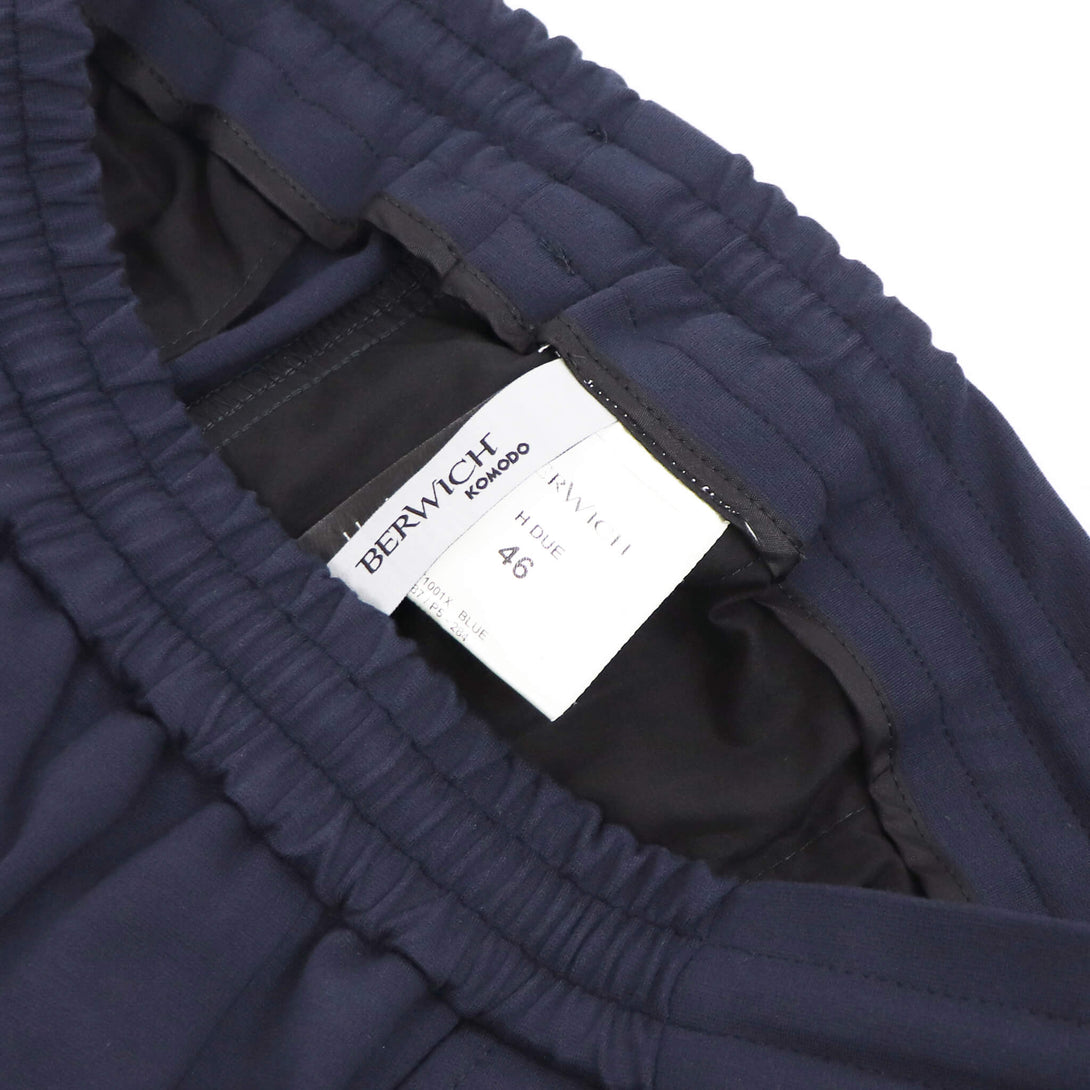 こちらのモデル名”H DUE(アッカデュエ)”は、ファッションディレクター干場氏の希望で、1から形を起こしたモデルとなります。最大のポイントは、永久クリースを前後に入れることで、綺麗なシルエットを損なわれずに穿いていただける仕上がりとなっています。ウエストは、シャーリング加工、ドローコード付き、フロントフライ仕様ではなく、裾はダブル仕上げとなっています(三つ折りに加工も可能 ※店頭にて)シルエットは、程よくワタリにはゆとりがありますが、裾にかけてはしっかりとテーパードを効かせています。それにより一見普通のジャージーパンツがどこか品があり、だらしなく見えないので、大人な方にぴったりなイージーパンツの仕上がりとなっています。今までのBERWICHにはない、コレクションとなっています。