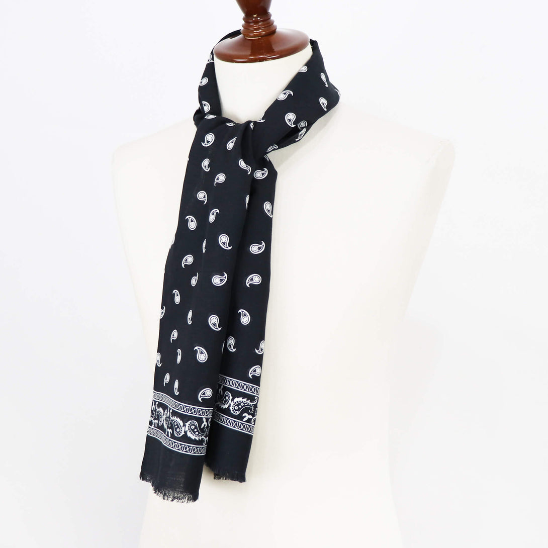 バンダナを連想させるような品のあるアメカジテイストのストール。 最近のシャツ離れの中で注目されているスカーフ。寂しくなりがちな首元を 華やかに飾ってくれます。まさにヨーロッパ的アメカジテイストなアイテムの登場です。
