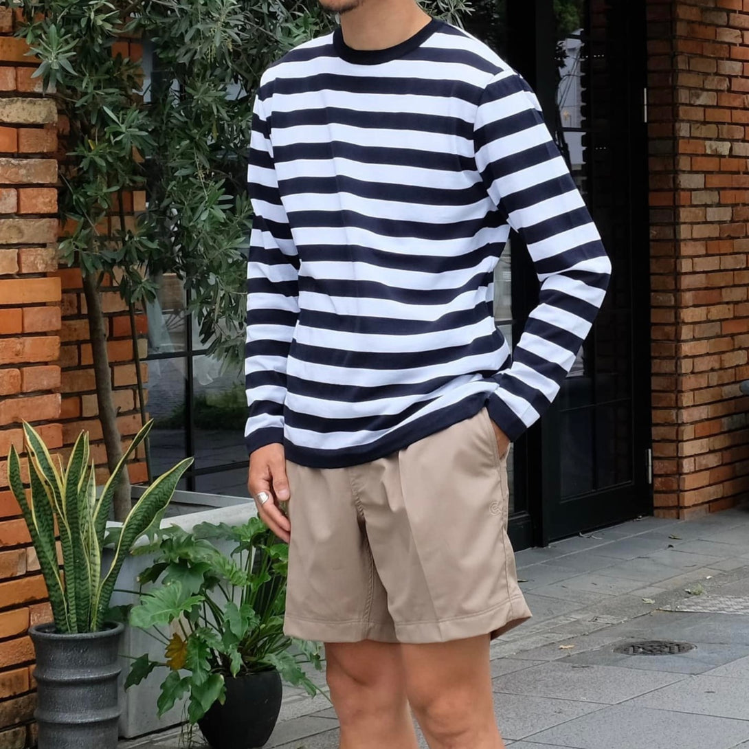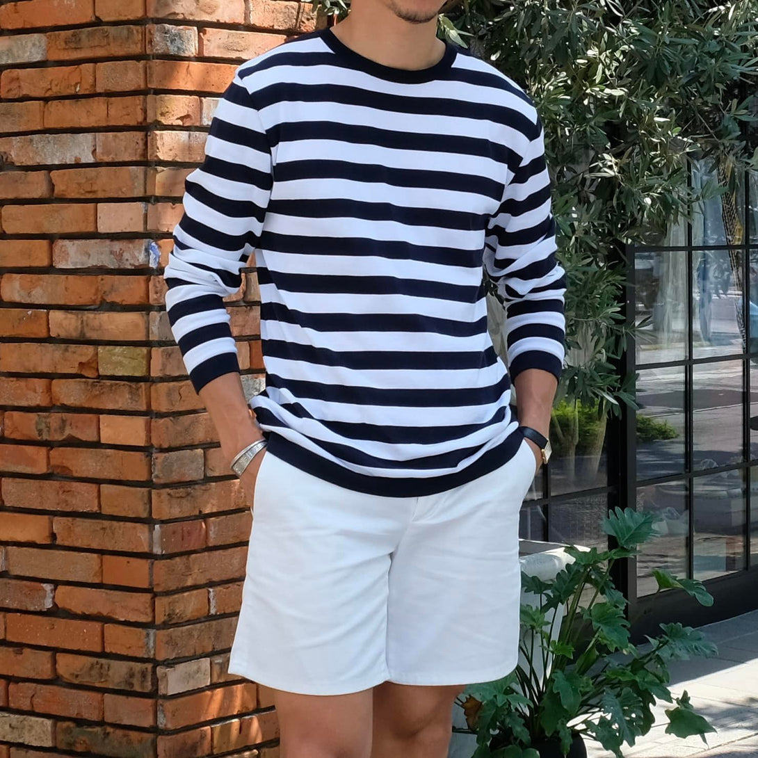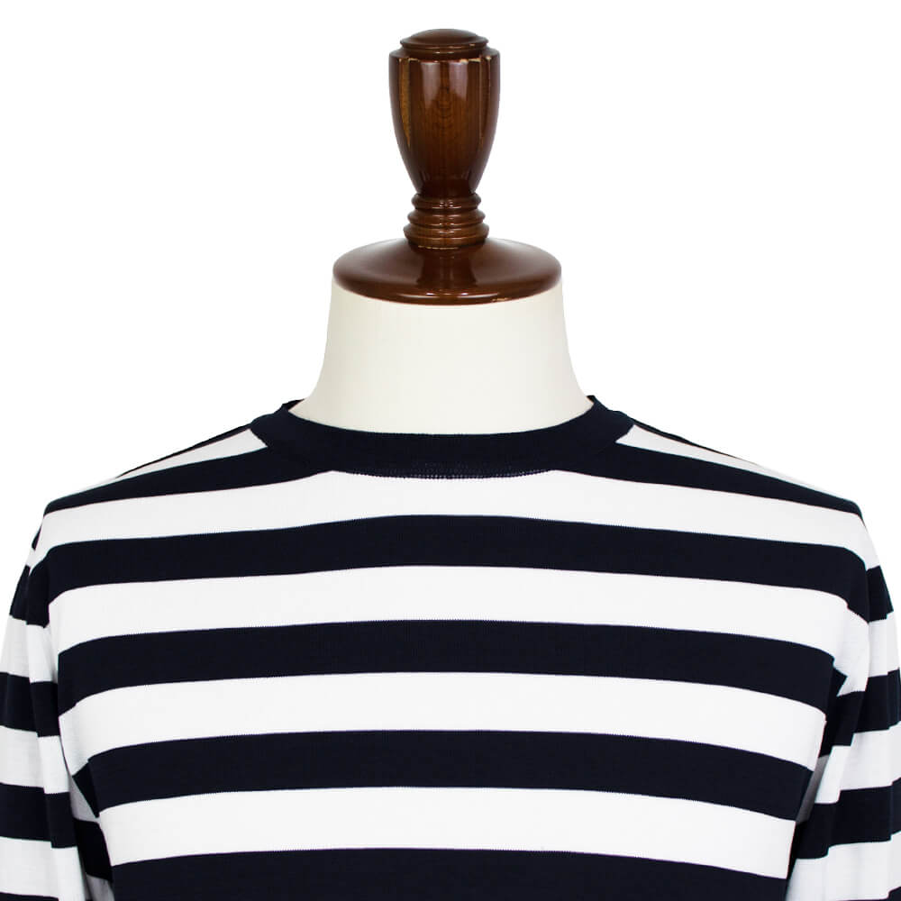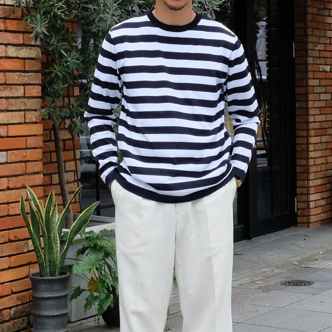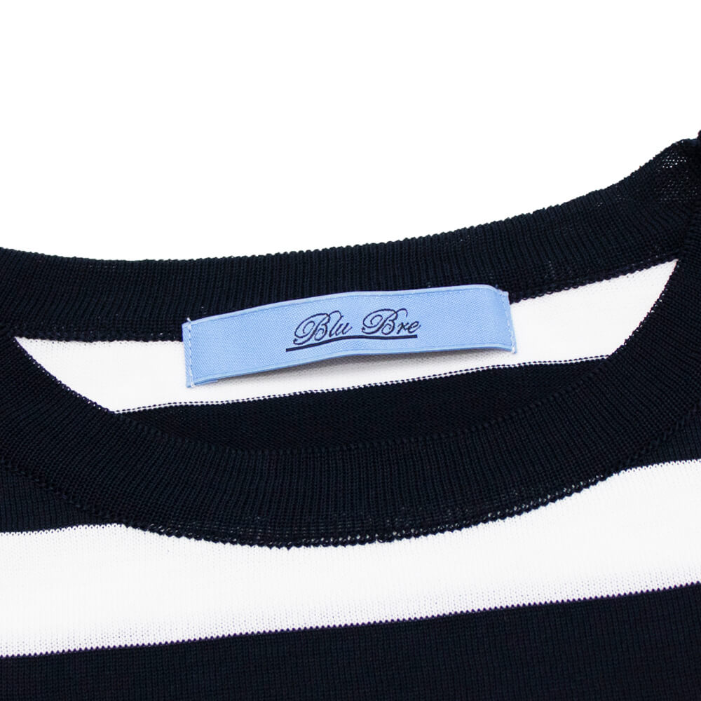 春夏の定番、ボーダーアイテムをBluBre(ブルブレ)で、カラー別注をしました。素材は、ブルブレの定番、ドレスシャツの感覚で着るニットTシャツ。Tシャツの気軽さとニットの凛々しさ、世界最長のコットン繊維とテクノロジーのコンビネーション。類い稀な耐久性、収縮性、伸張性の価値ある組成を持つ糸を使用。だからこその着心地と持続性を実現。密に編んでいる為、型崩れしにくく、インナーとしても一枚でさらっと着ても透けることがありません。ハイクオリティーコットンの紡績に特化したイタリアのエミルコットーニ社の糸を使用し、独特なシャリ感、繊細かつ滑らかなタッチが湿気の多い日本でも清涼感があり快適に着ていただけます。ご家庭で手洗い可能なイージーケアアイテムになります。