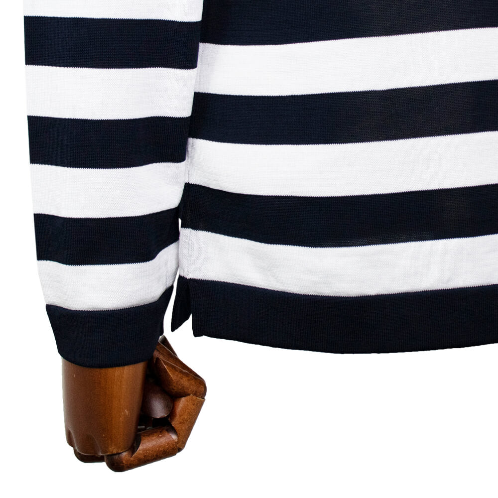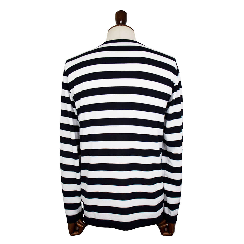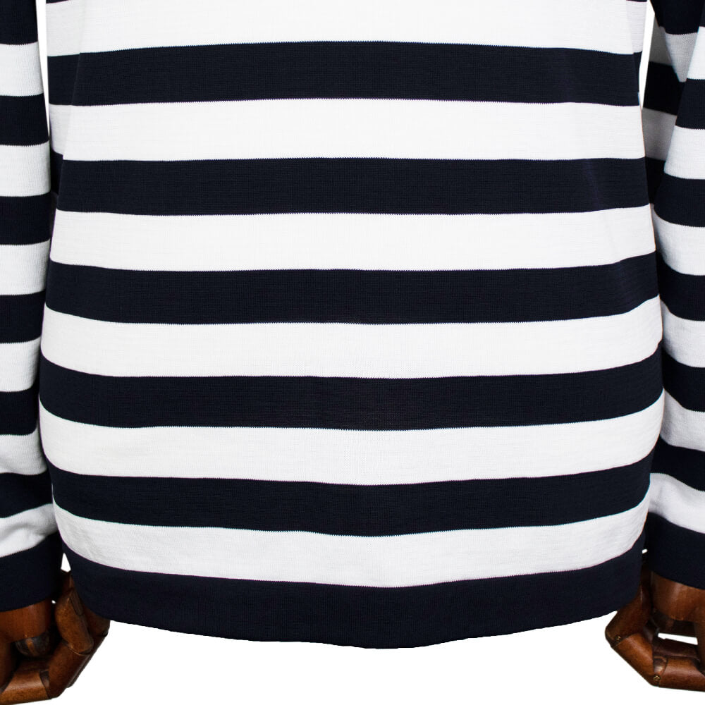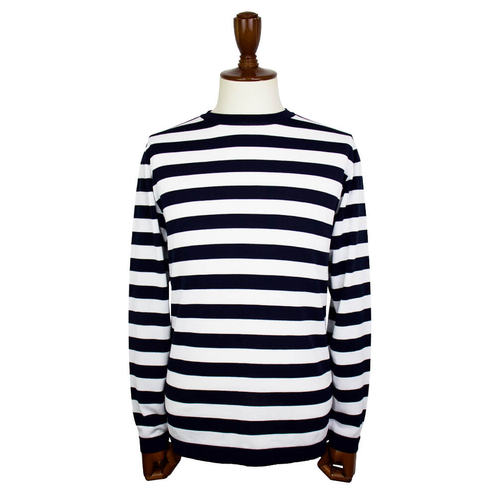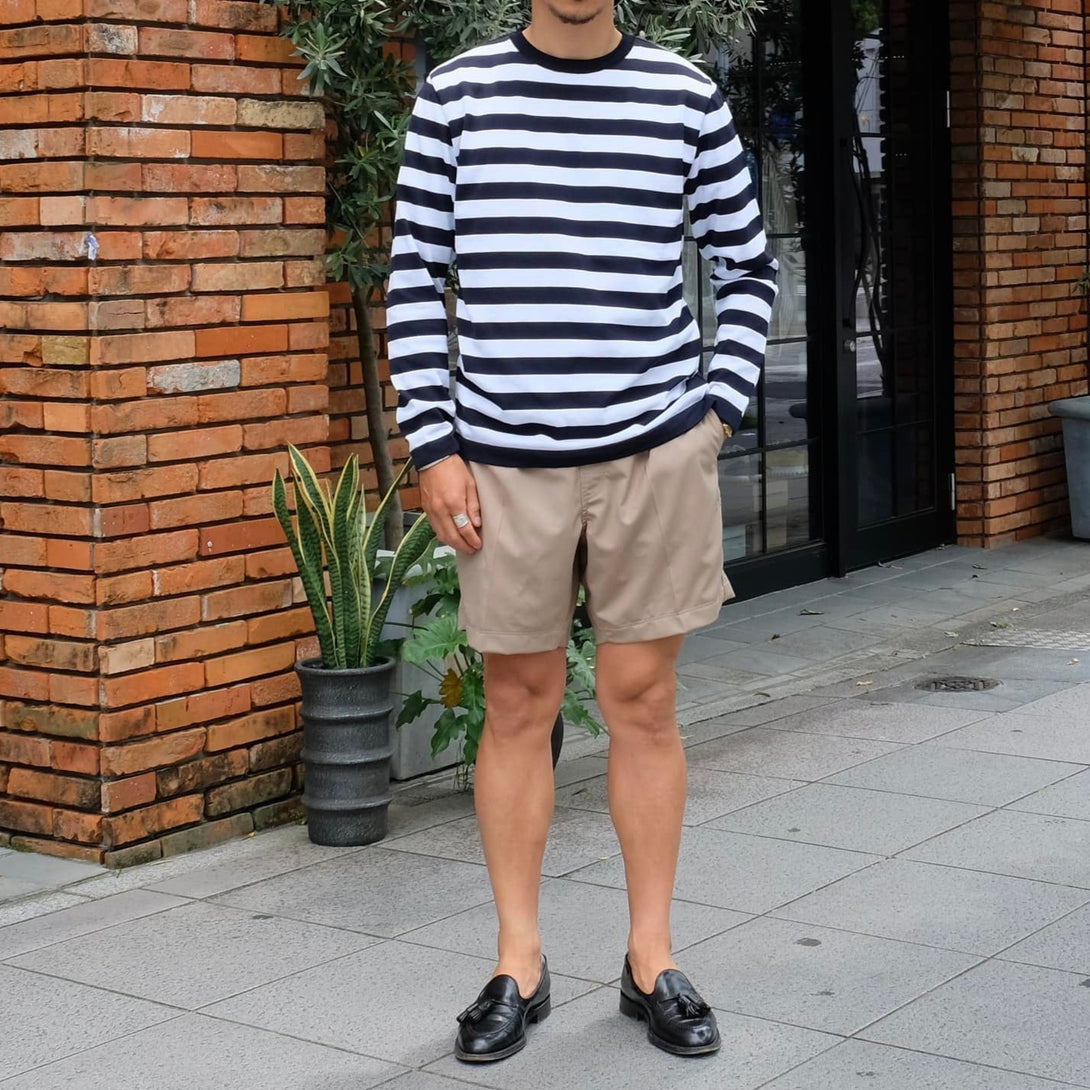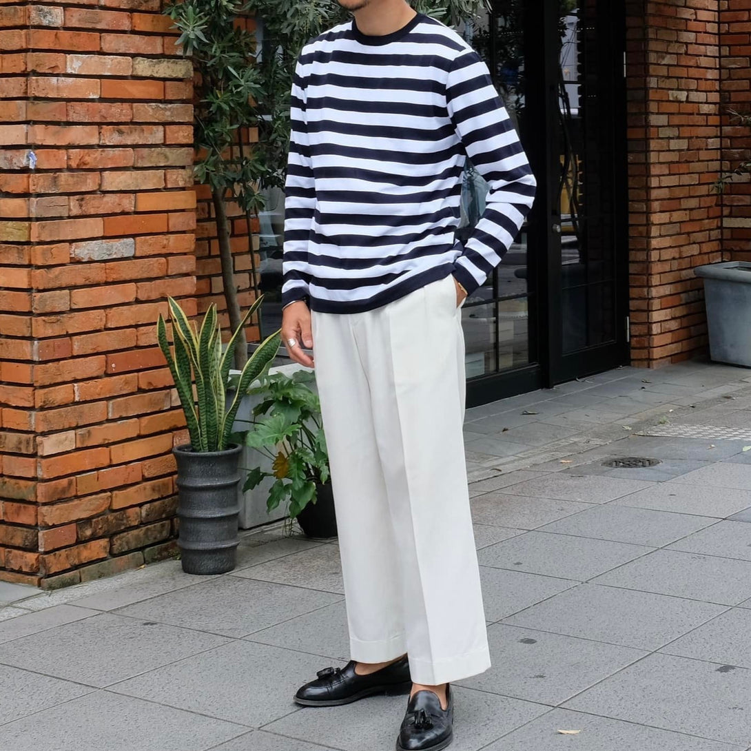 春夏の定番、ボーダーアイテムをBluBre(ブルブレ)で、カラー別注をしました。素材は、ブルブレの定番、ドレスシャツの感覚で着るニットTシャツ。Tシャツの気軽さとニットの凛々しさ、世界最長のコットン繊維とテクノロジーのコンビネーション。類い稀な耐久性、収縮性、伸張性の価値ある組成を持つ糸を使用。だからこその着心地と持続性を実現。密に編んでいる為、型崩れしにくく、インナーとしても一枚でさらっと着ても透けることがありません。ハイクオリティーコットンの紡績に特化したイタリアのエミルコットーニ社の糸を使用し、独特なシャリ感、繊細かつ滑らかなタッチが湿気の多い日本でも清涼感があり快適に着ていただけます。ご家庭で手洗い可能なイージーケアアイテムになります。