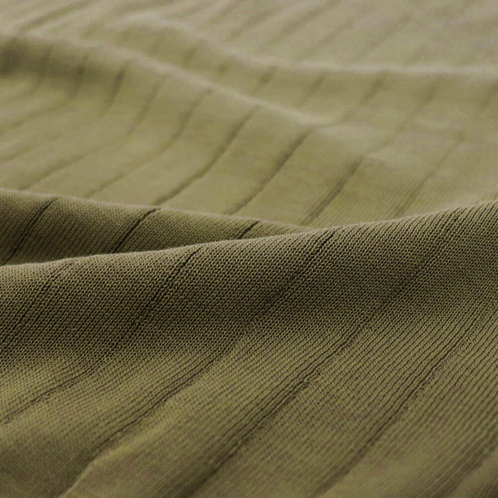 昨年もご好評いただいた、スキッパーポロ。襟の大きさや、空き具合が考慮され襟のみミラノリブ編みにすることで、しなやかなロールラインを保つ設計となっています。12ゲージ2本取で編み地も素材の特性も相まって、張り感がありしっかりしているため、タイトすぎない程よいサイズ感となっています。無地ながらも針抜き編みの凸凹したデザインがピンストライプを連想させる表情となっています。裾口と袖口をリブ編みにし、腕周り、腰回りがスッキリ見えるよう設計され一枚でも様になる大人な仕上がりとなっています。