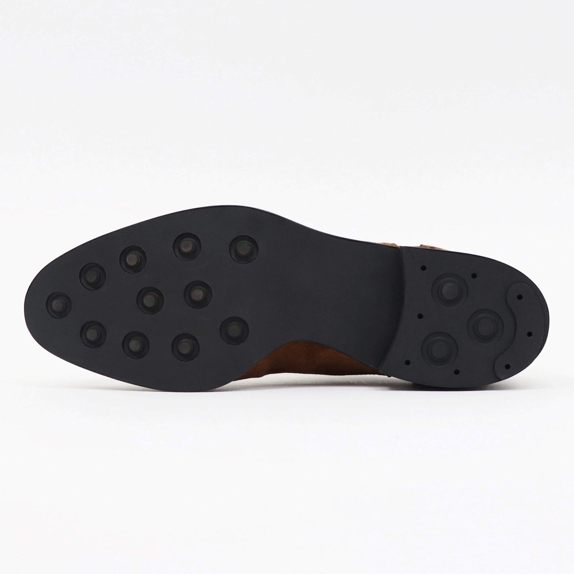 スエード革は着用前に防水スプレーを吹きかけることで、撥水性、防汚性が向上し、雨天時の着用に向いているとされています。そうした意味でも雨天対応型のシューズですので、ソールに関しましても、雨の影響を受けづらい新たな”ラバーソール”を採用。ソールにある突起物(スパイク)の効果で歩行時の足元に安心感をもたらしています。