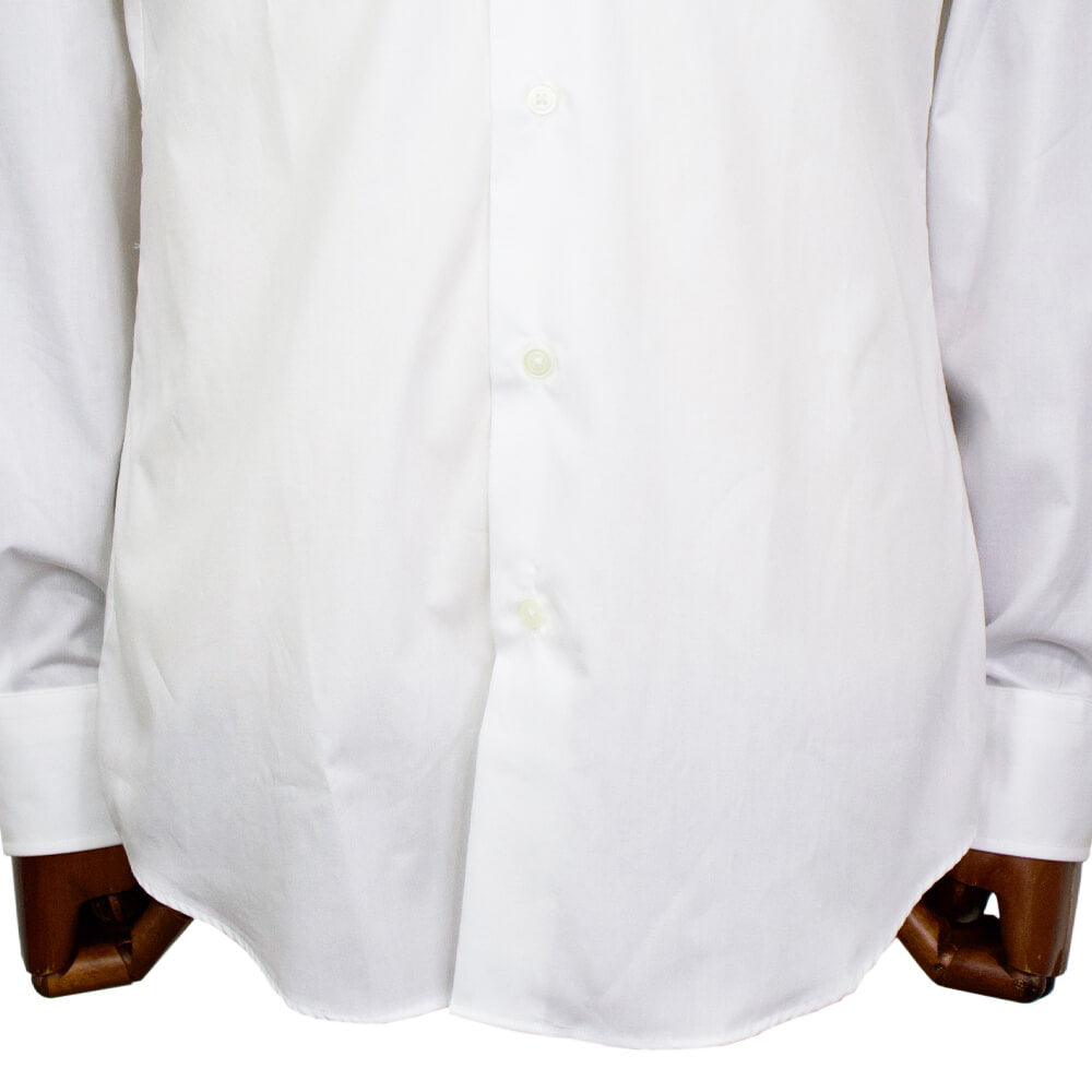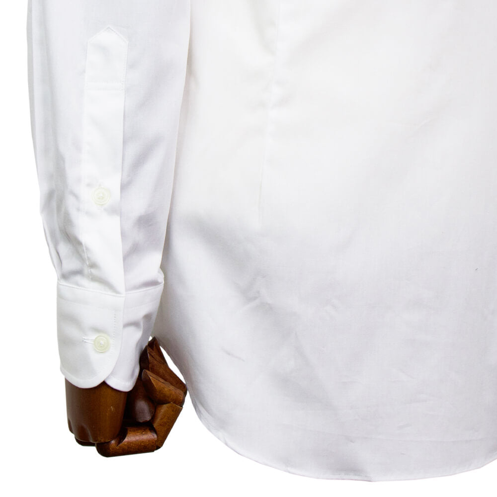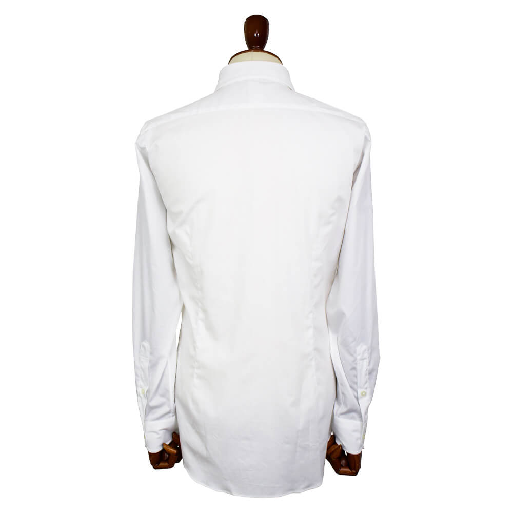 まずはサイズ感。誰にでも合うシャツより、とにかくスッキリ見えること、カッコよくみえることに重点を置いたサイススペックとなっています。とりわけ、バストから中胴への絞りを強めで、お腹の出ている方では着られないほど。しかし着用できる方にとっては、最高のボディシルエットとなることをお約束致します。また、裄丈は長めの設定で、なかなかサイズのなかった腕の長い方にもおすすめです。、もちろん腕の短い方でもご着用いただけますよう、お直しのサービスもございますので、お気軽にご相談ください。