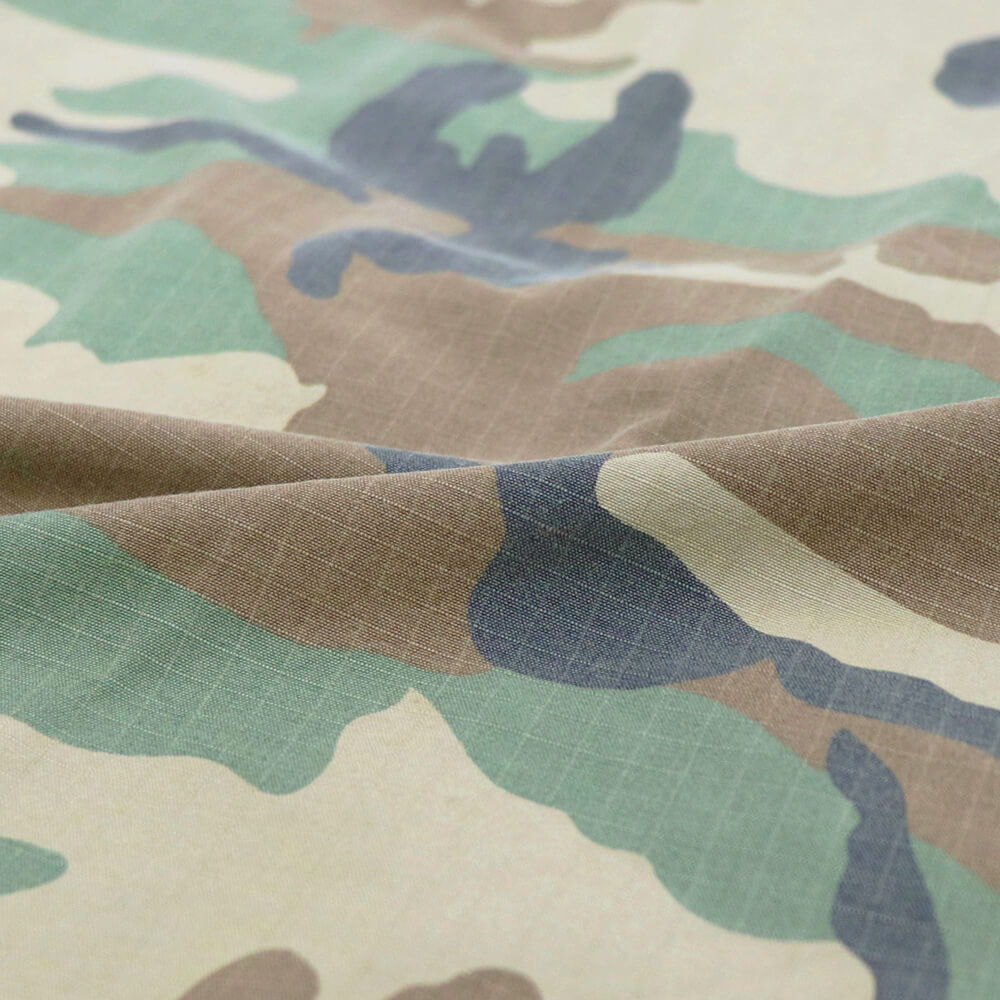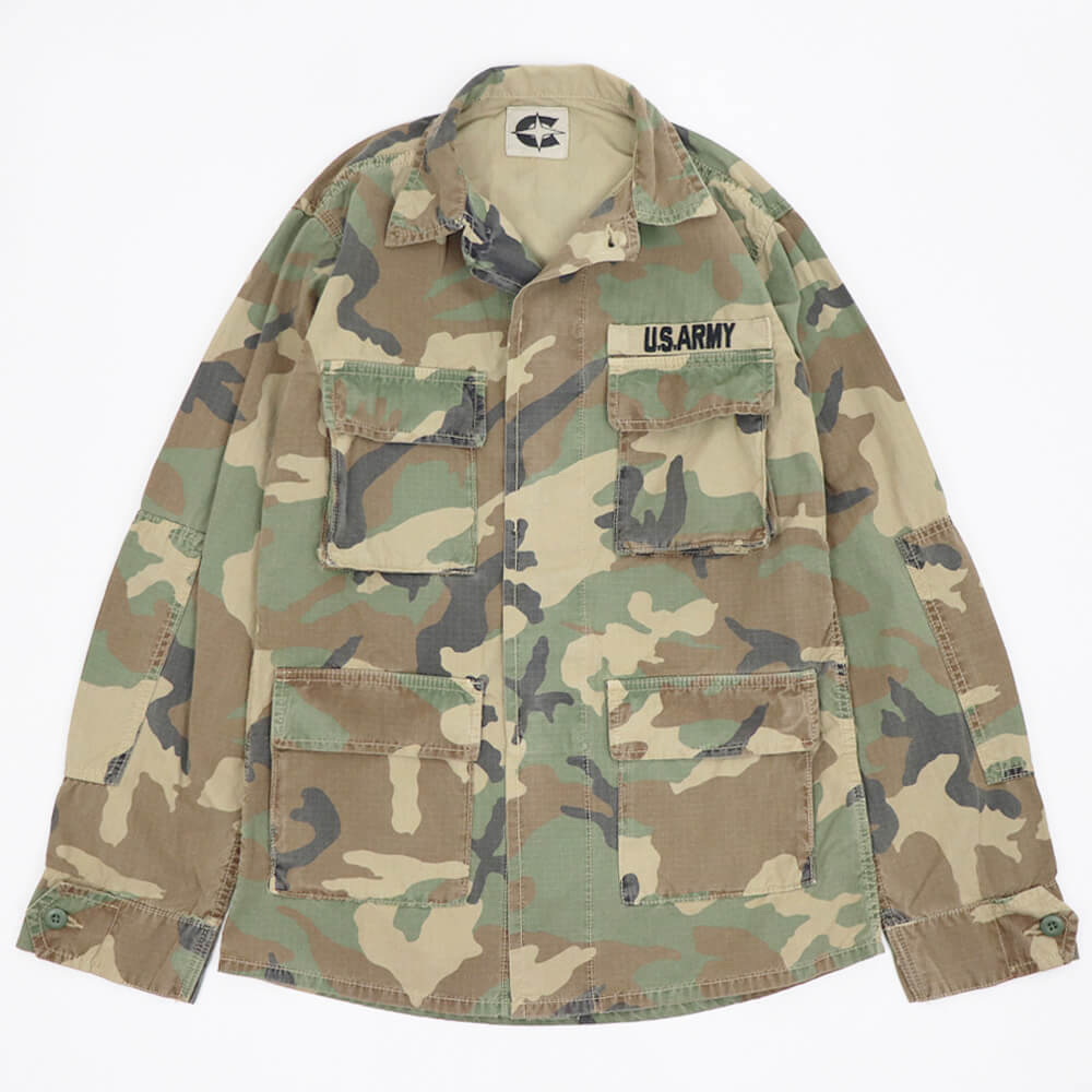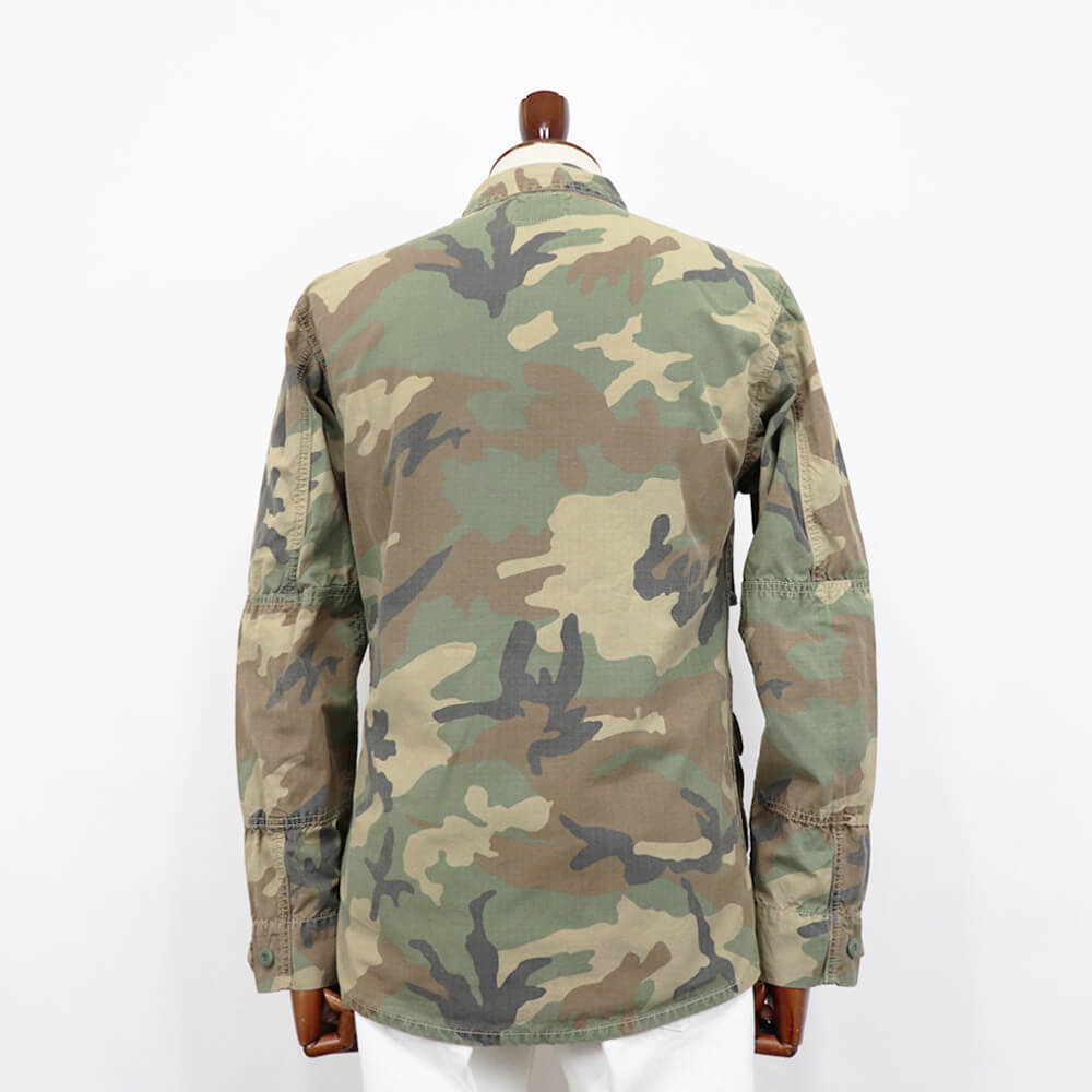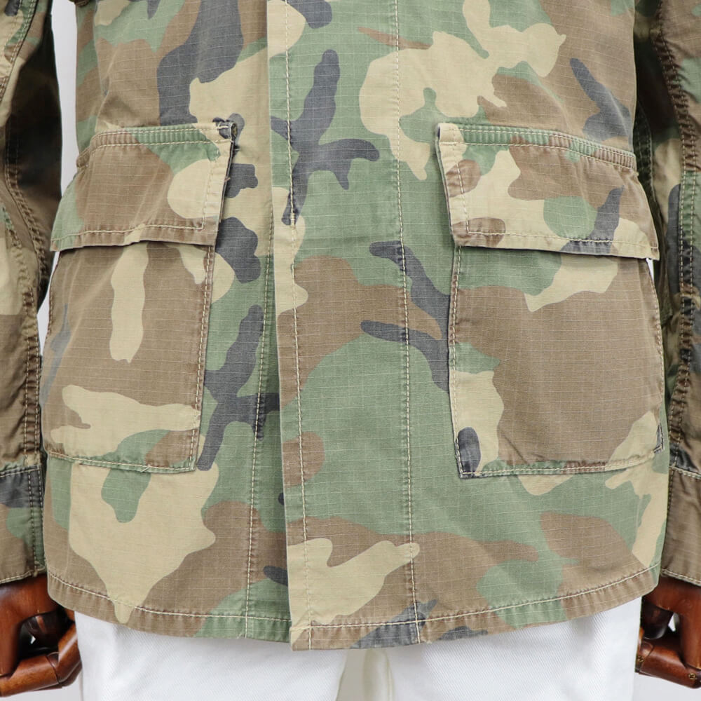 BDUジャケットの特徴とも言える4つのフロントポケットは2重構造のフラップがついており、ボタンが外に露出しない仕様となっています。4箇所のポケットはマチ付きで立体的なデザインとなり、フロントは比翼仕立てでボタンが引っかからない仕様、肘部分には補強のためにあて布がされた2重構造、袖はボタンで調節可能といった作りになっています。
