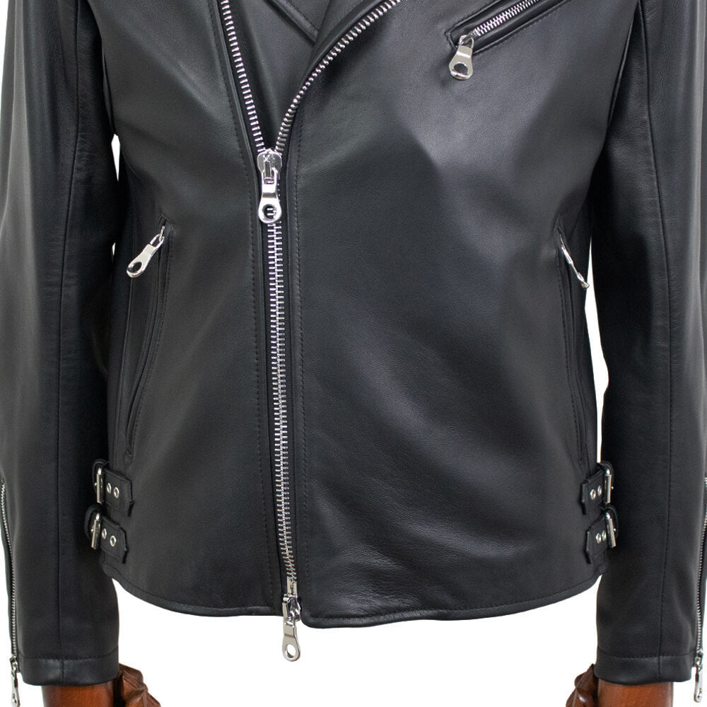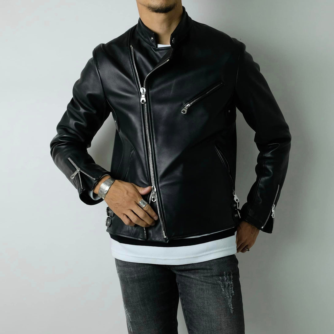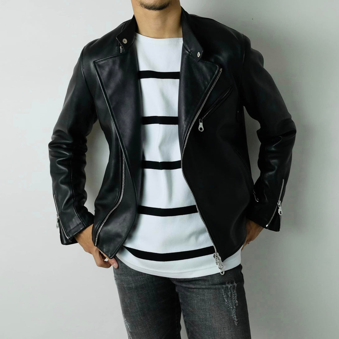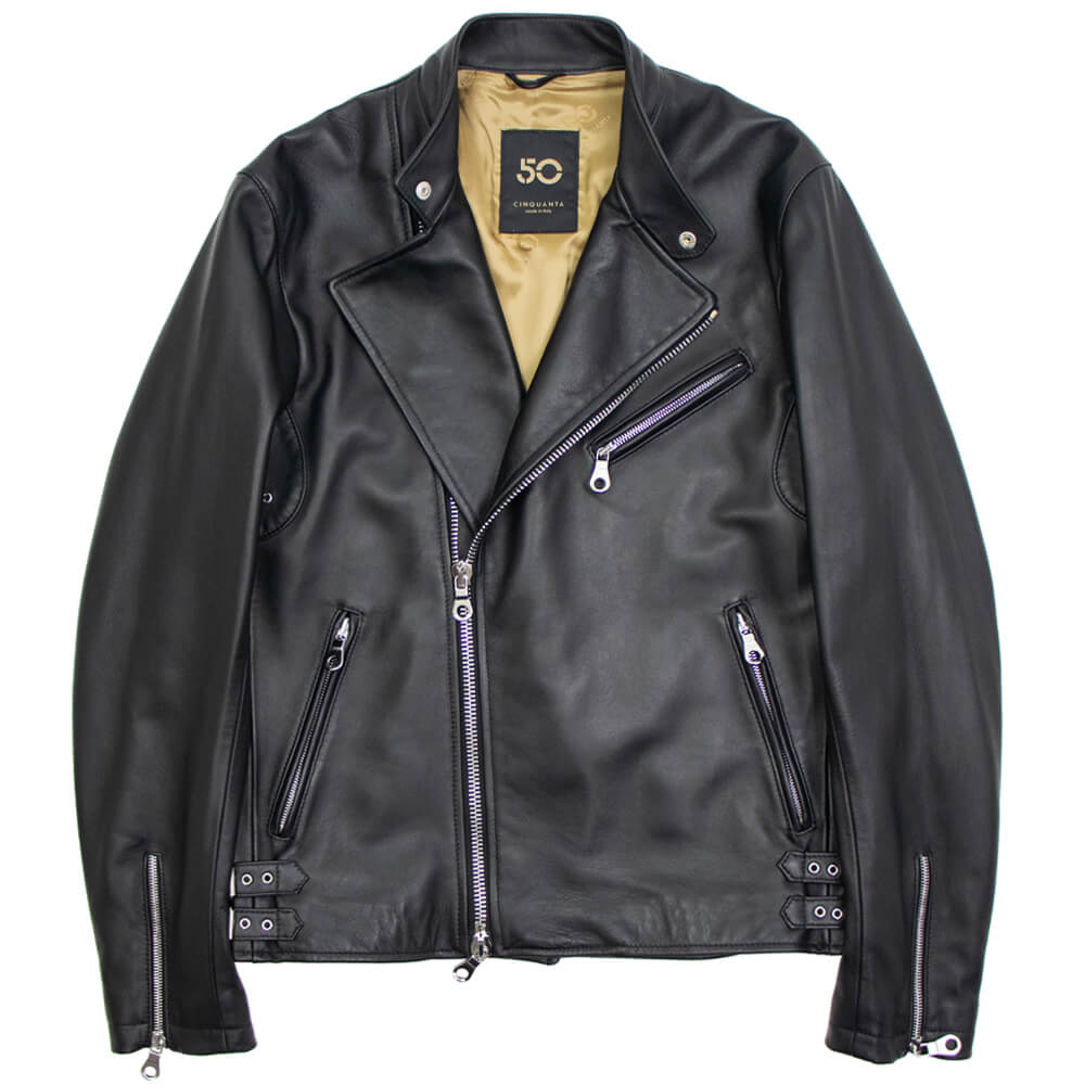 そしてCINQUANTAの人気の秘訣はなんといっても日本人体型に合うよう試行錯誤されているシルエットではないでしょうか。前肩仕様で、狭めの肩幅にコンパクトな前身頃、アームは細身で袖ぐりも小さく非常にスマートな印象。身体に沿う細身のフィッティングながらストレスを感じさせない動きやすさを実現しています。 シングルの着回しやすさとダブルの男らしさを兼ね揃え 従来の無骨でハードなイメージのレザージャケットとは違い、上品さ溢れる落ち着いた大人のためのレザーアイテムです。