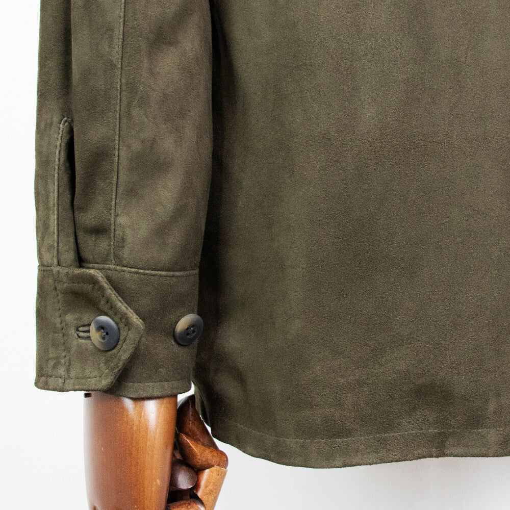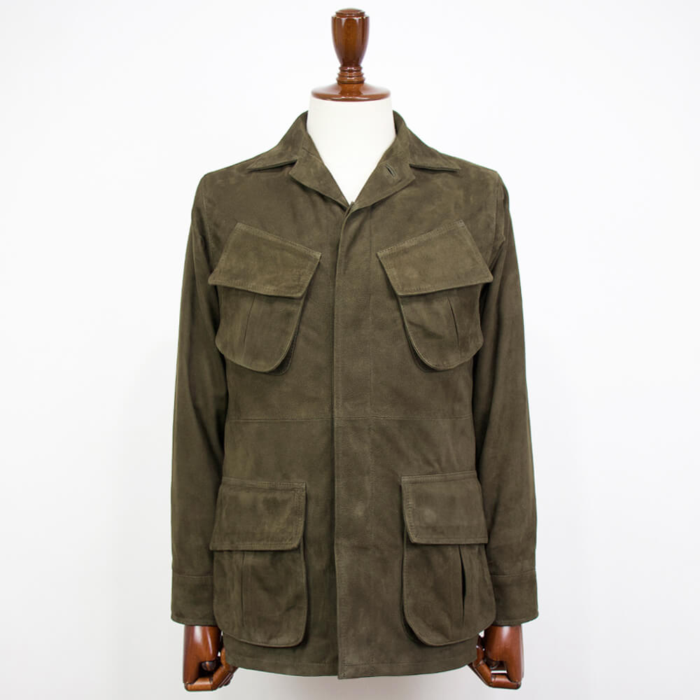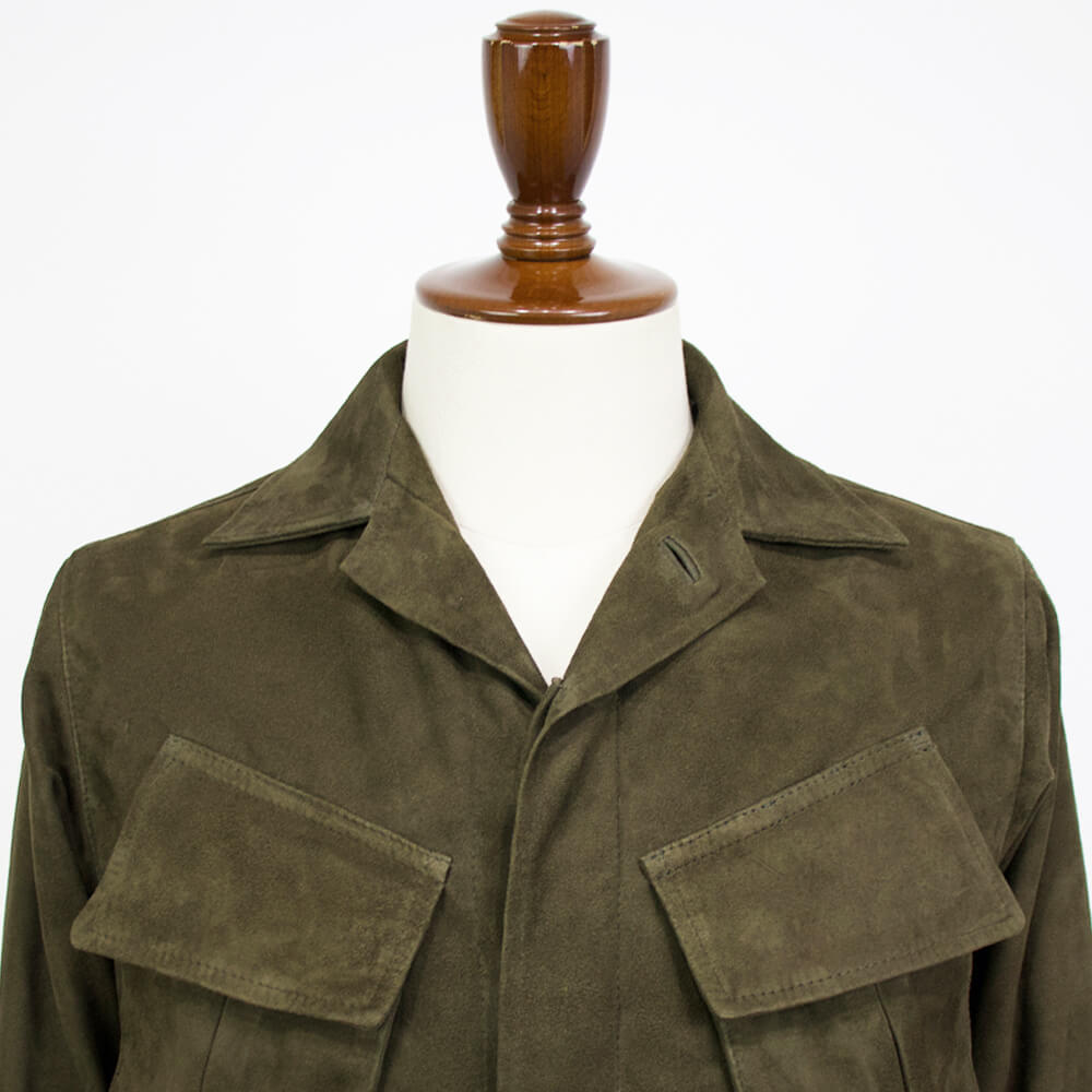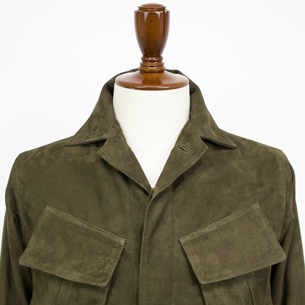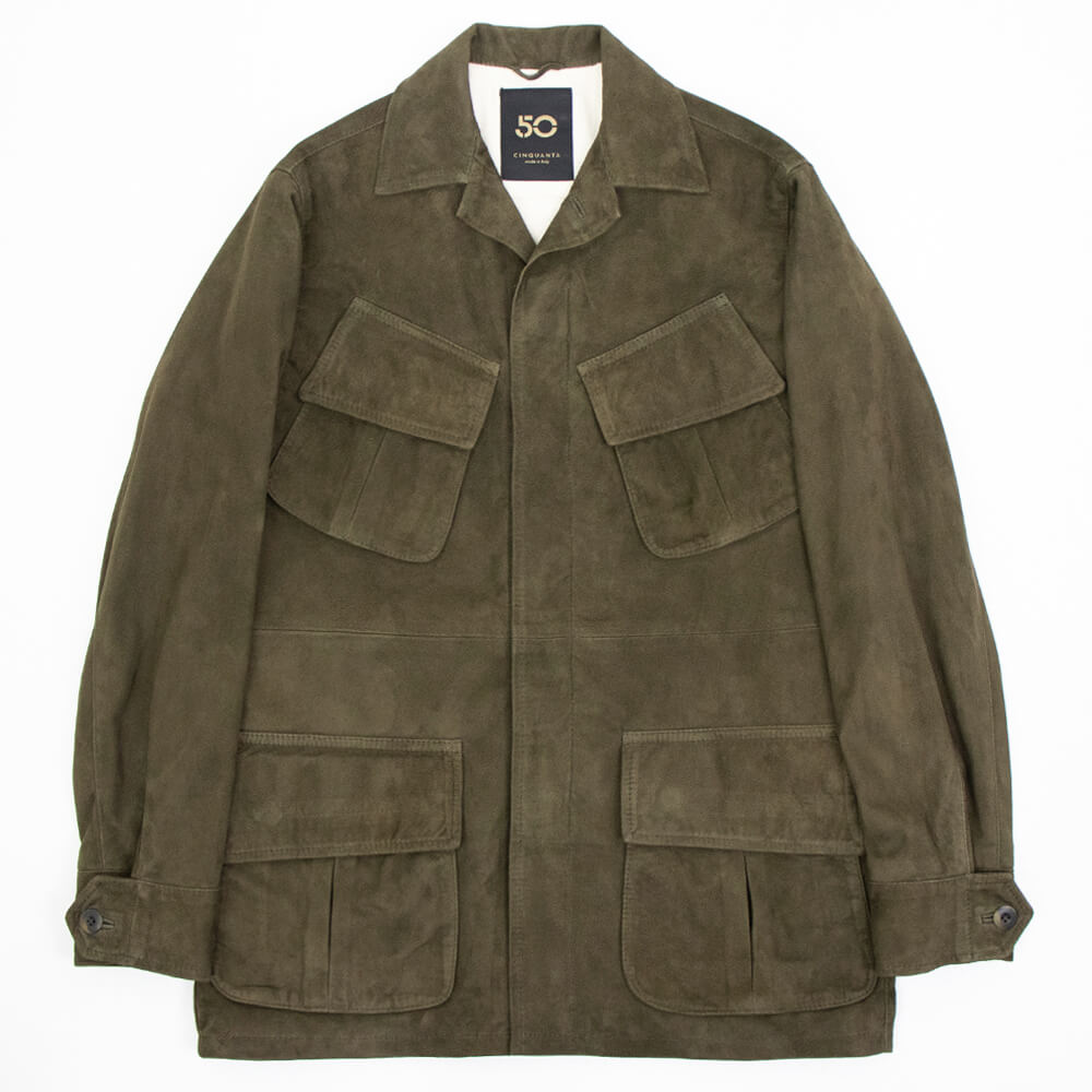 1970年代の、USARMYジャングルファティーグジャケットをベースに、現代的にモディファイされた、CINQUANTAのオリジナル。大人な雰囲気と、ラギっと感ある仕上がりをイメージして素材はスエードをセレクト。上質なゴートスエードによるなめらかな毛並みと美しい光沢でミリタリーのアイテムも上品な印象に。