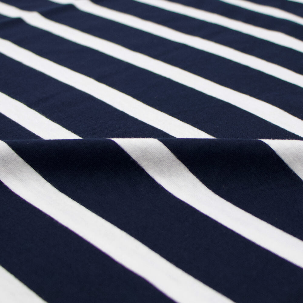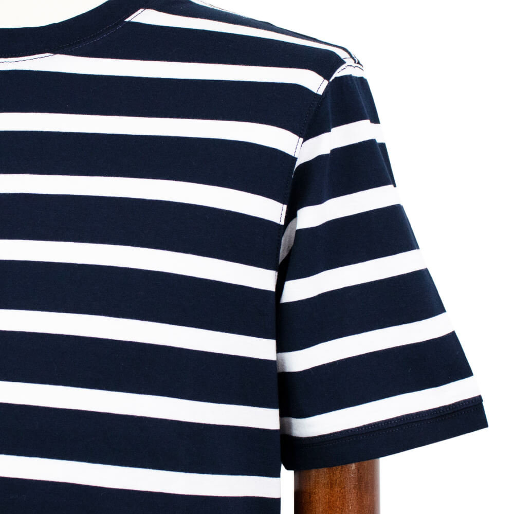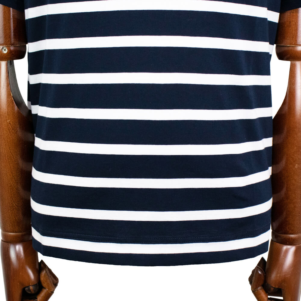 上質なコットンのカットソー生地を使って仕上げられたクルーネックのTシャツです。ネイビーとブラックのボーダーは、派手になりがちな大柄ボーダーを落ち着いた印象のコーディネートに仕上げてくれます。一枚での着用はもちろんの事、ネイビージャケットやショートブルゾンなどと合わせると、スポーティーなトラッドスタイルを楽しむことができます。