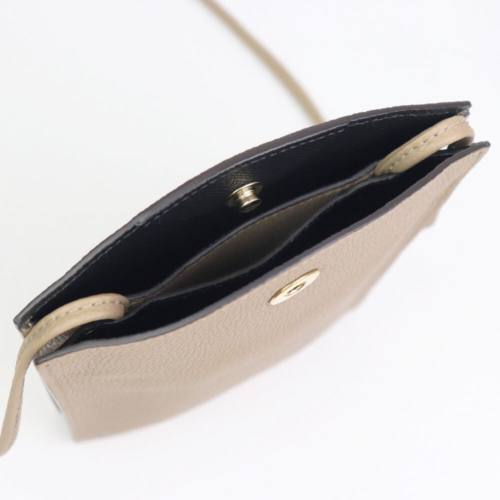 シュリンクレザーの風合いを生かした、コンパクトなサイズ感のショルダーバッグ。落ち着いたシックなカラーでデザインされているので、オンオフを問わず多彩なシーンに対応できます。開口部はスナップボタン留めで手軽に開閉が可能。フィレンツェの名門革工房で学んだ伝統の技術を守りながら、良い素材のみが持つ質感をダイレクトに伝える「CISEI」のコレクションをお確かめください。
