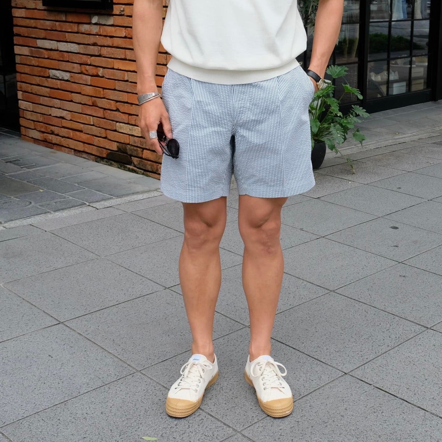 コロニークロージングでは、定番モデルの水陸両用ショーツを、今季は、Vandori × Giottoの共同別注が実現。Vandori オーナーである笹岡様より、お声がけ頂き今回の別注アイテムが完成しました。アイコニックなフェイクフロントとサイドアジャスターのギャップが面白く、通常モデルに比べ、3cm丈を長くしていますので、タウンユースで着用しやすい長さになっています。素材は春夏の定番、シアサッカーを使用。内側のインナーも無くしていますので、清涼感ある見た目と、履き心地を実現しています。シンプルな着こなしで、品のある大人なコーディネートが楽しめるアイテムです。もちろん、Vandori、BluBreアイテムとの相性は抜群です。