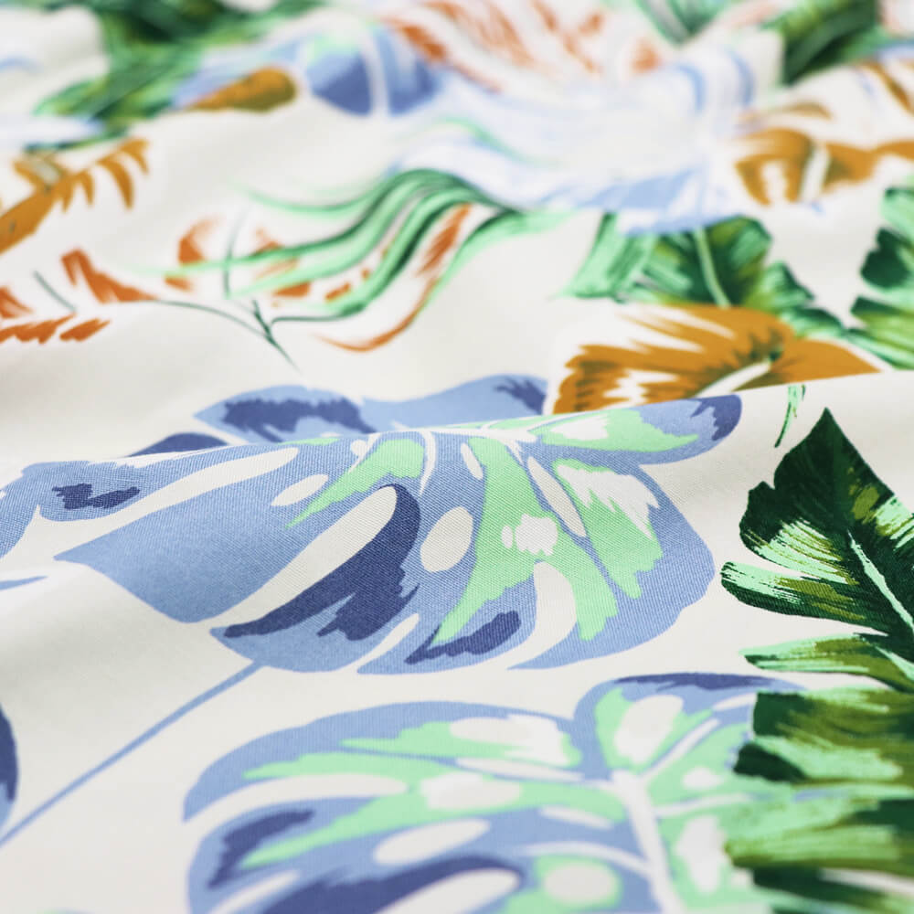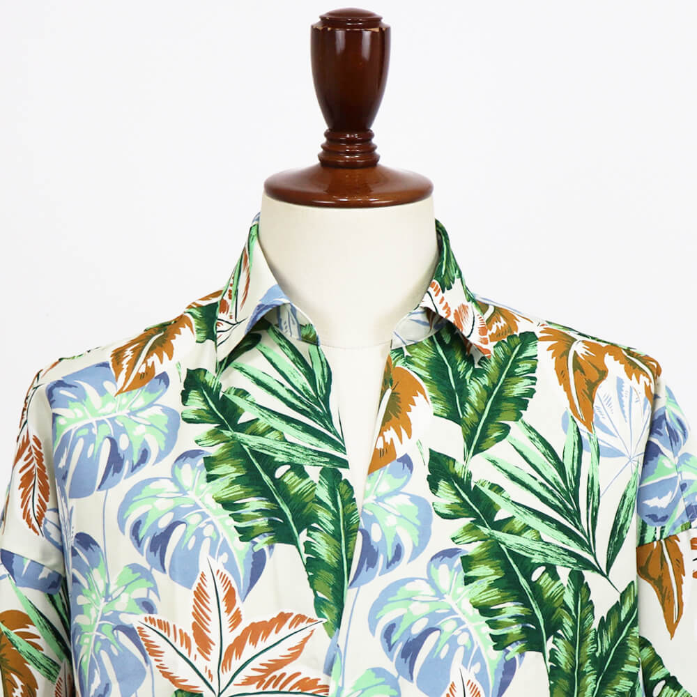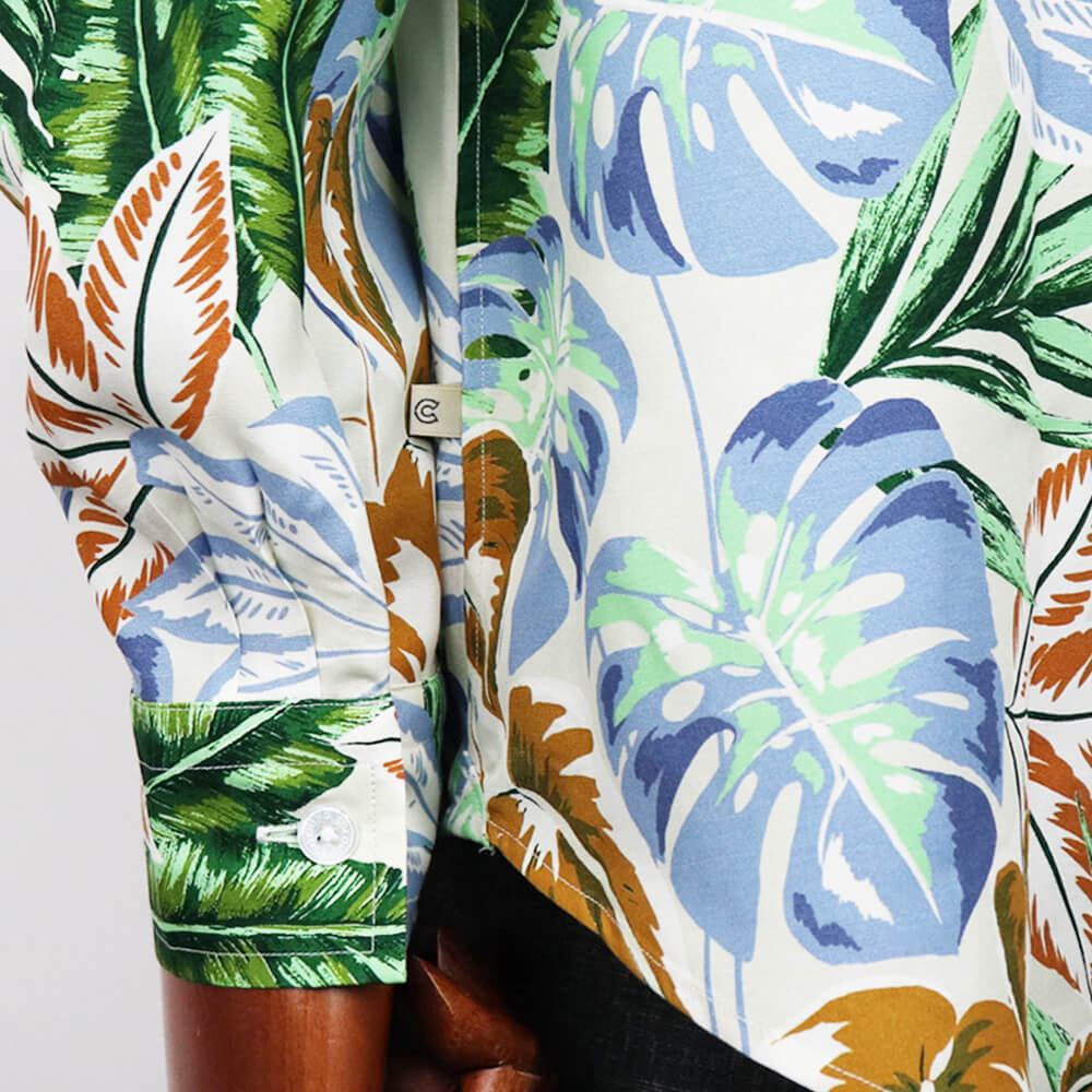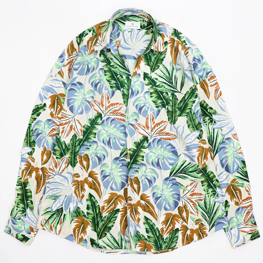 生地は、アロハシャツを連想させるリーフ柄。また左裾にはブランドの頭文字であるCマークがさりげなく刺繍されているのもにくい演出ですね。プールサイドやシーサイド、リゾート地では一枚でさらりと着用するのがかっこいいですが、タウンユースとして着用する際はインナーにカットソーなどを着るとリラックス感ある大人のサマースタイルとして存在感を発揮します。