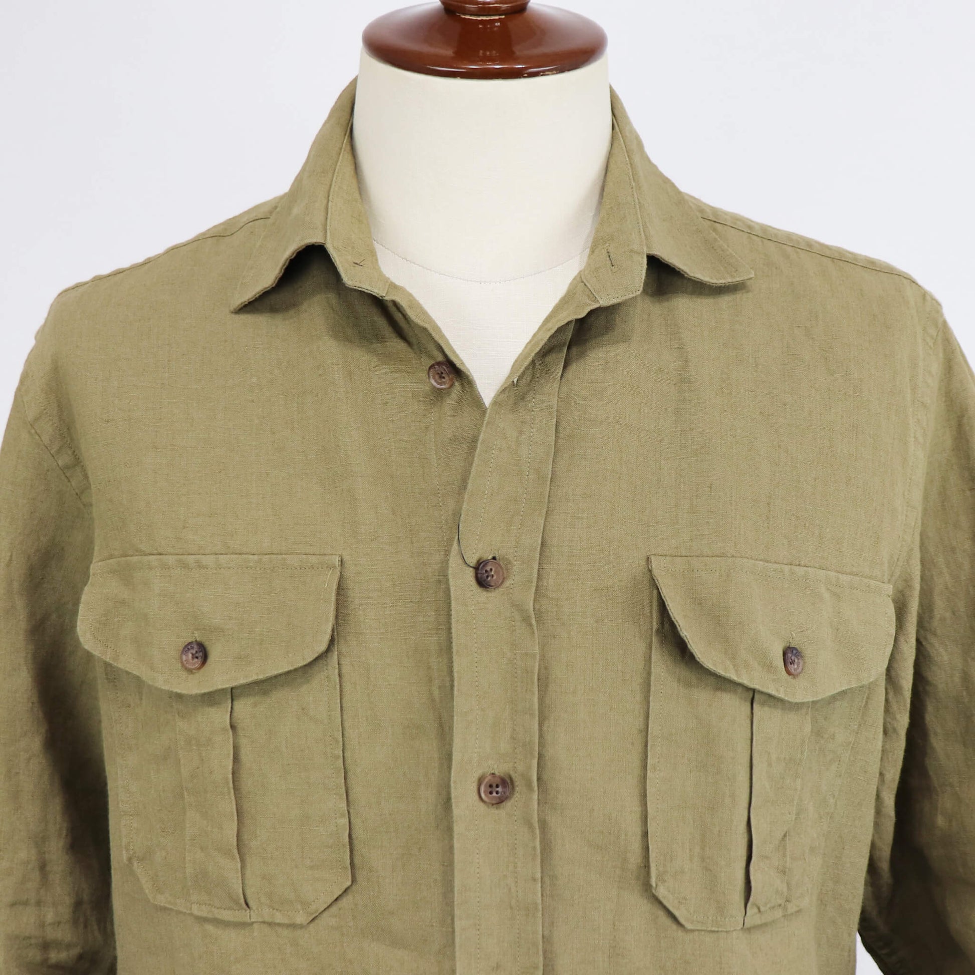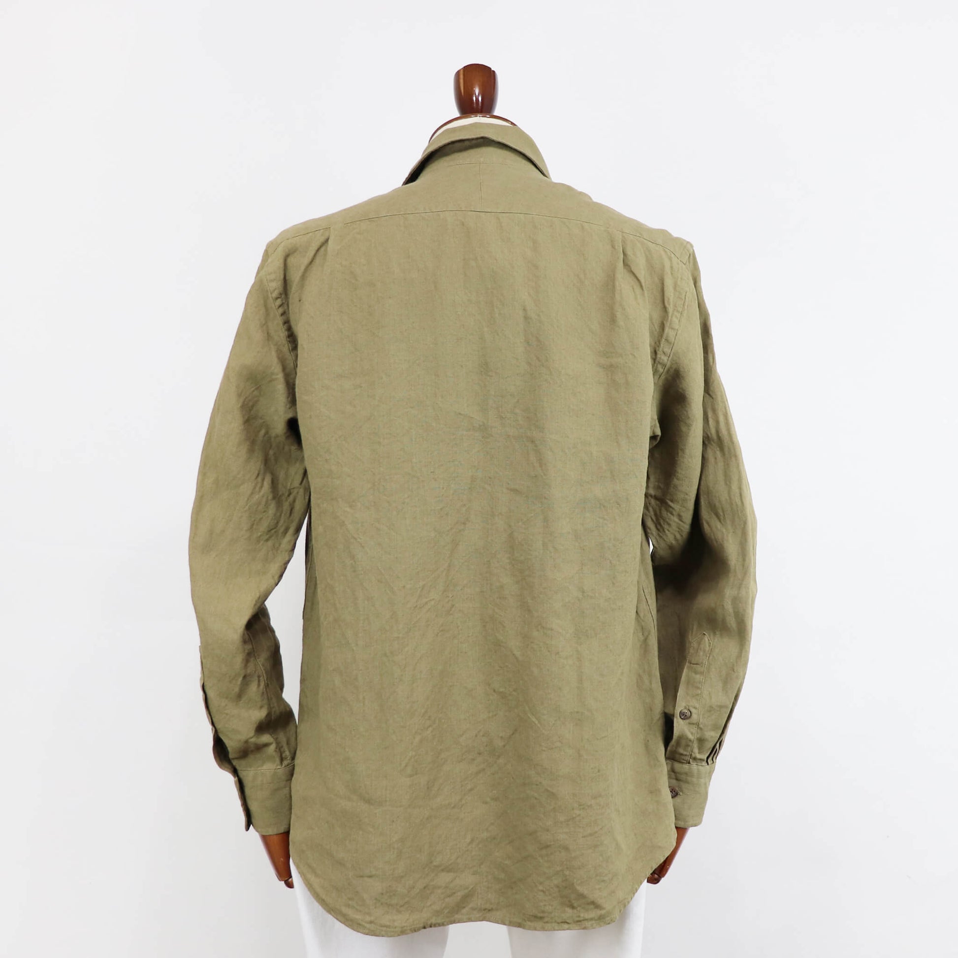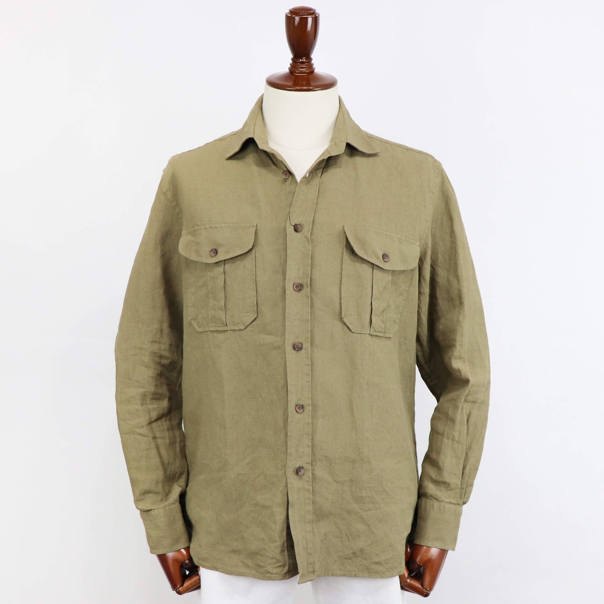 アイリッシュリネンのオーバーシャツ。イタリアのリネンとは違いコシがありシャリ感の強い生地が特徴的。着込んで体に馴染みクタッとなった時が楽しみです。