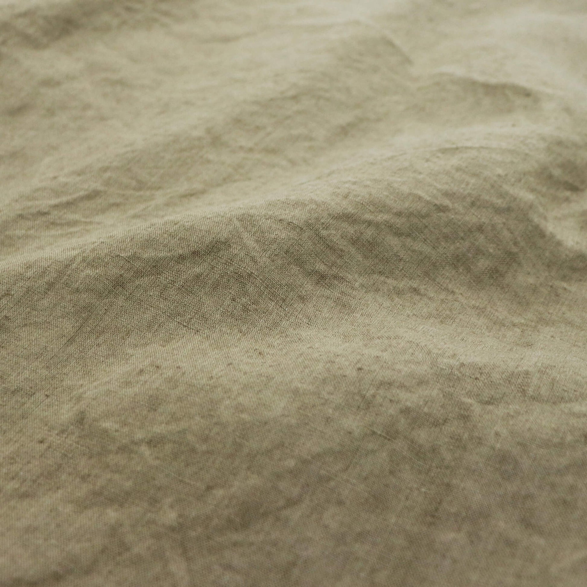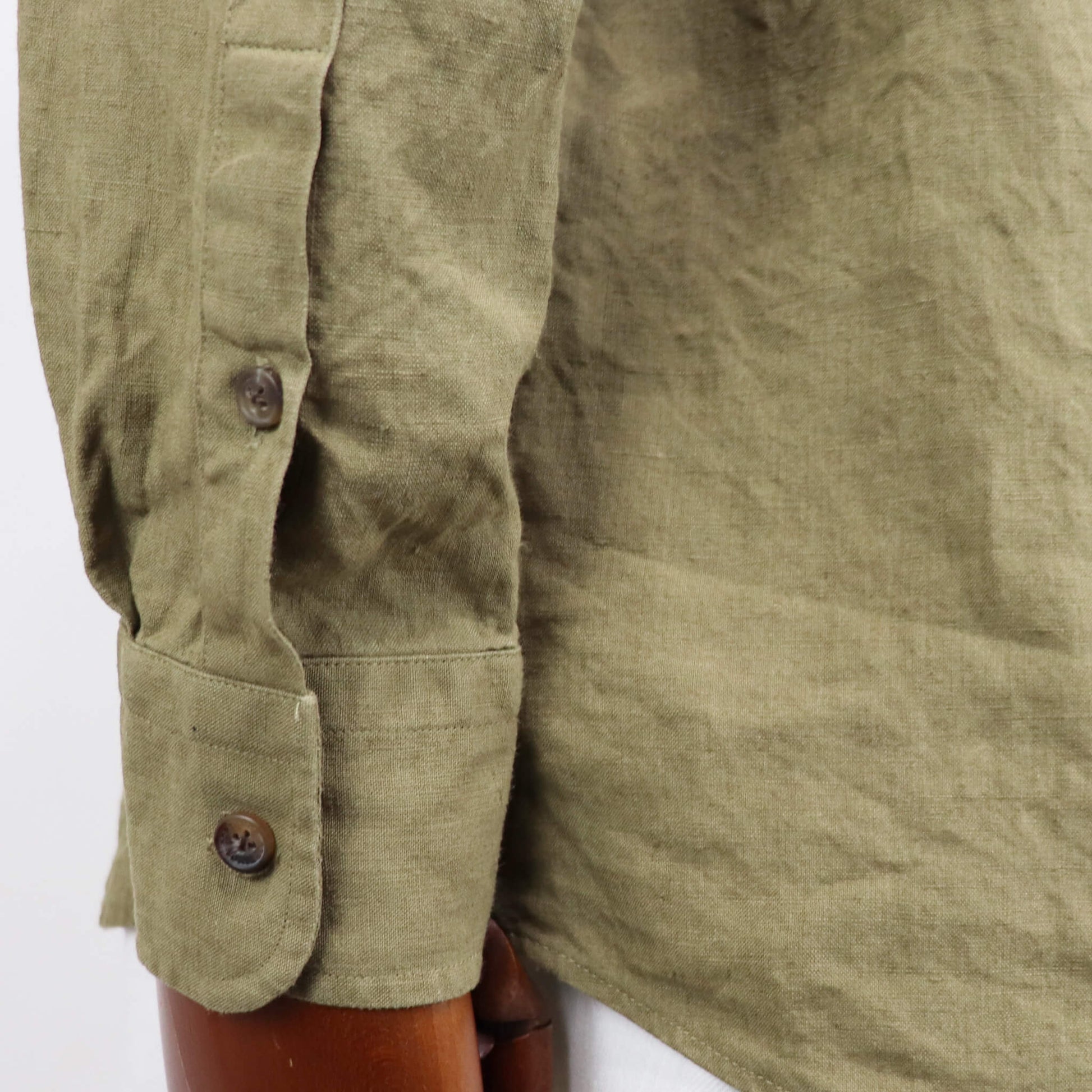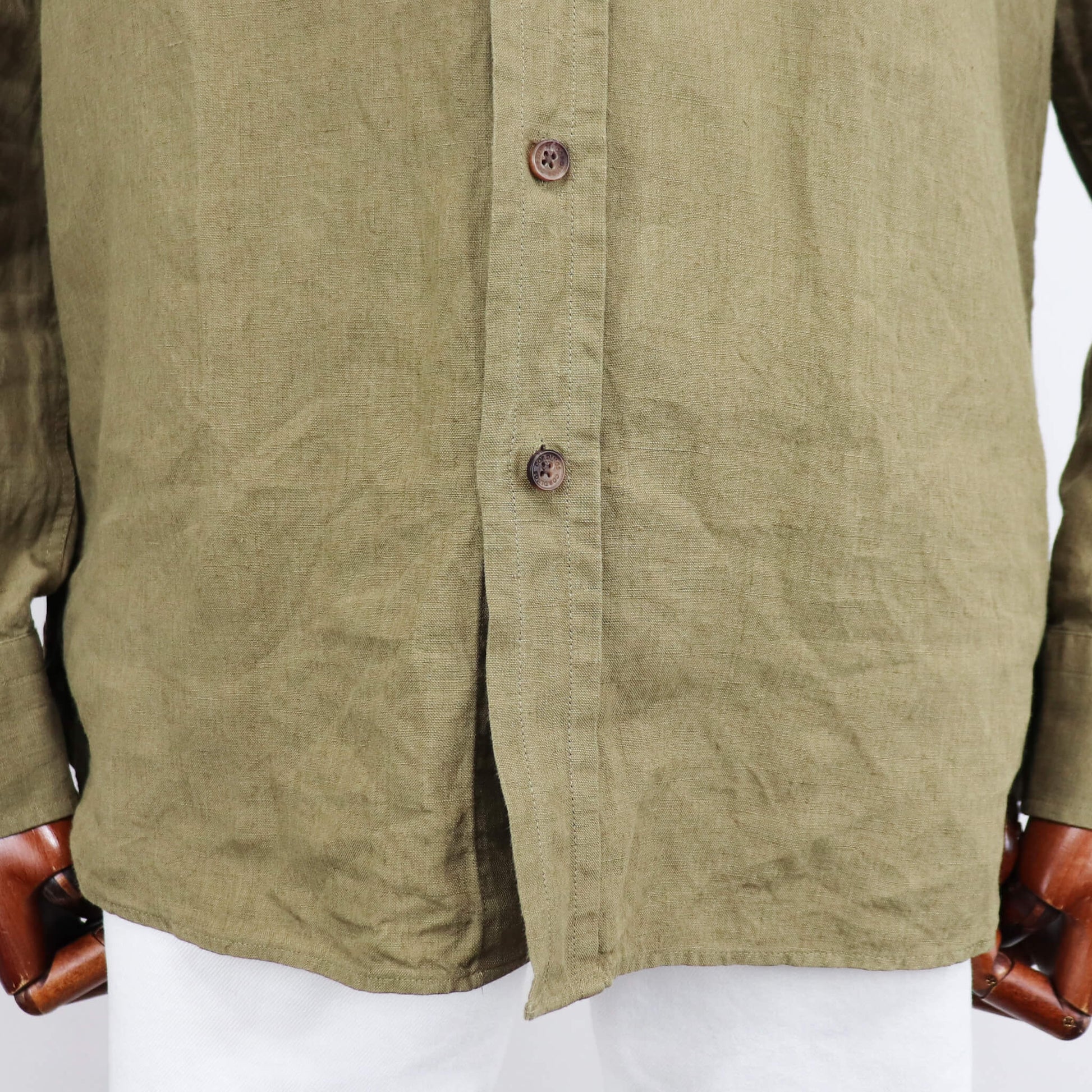 アイリッシュリネンのオーバーシャツ。イタリアのリネンとは違いコシがありシャリ感の強い生地が特徴的。着込んで体に馴染みクタッとなった時が楽しみです。