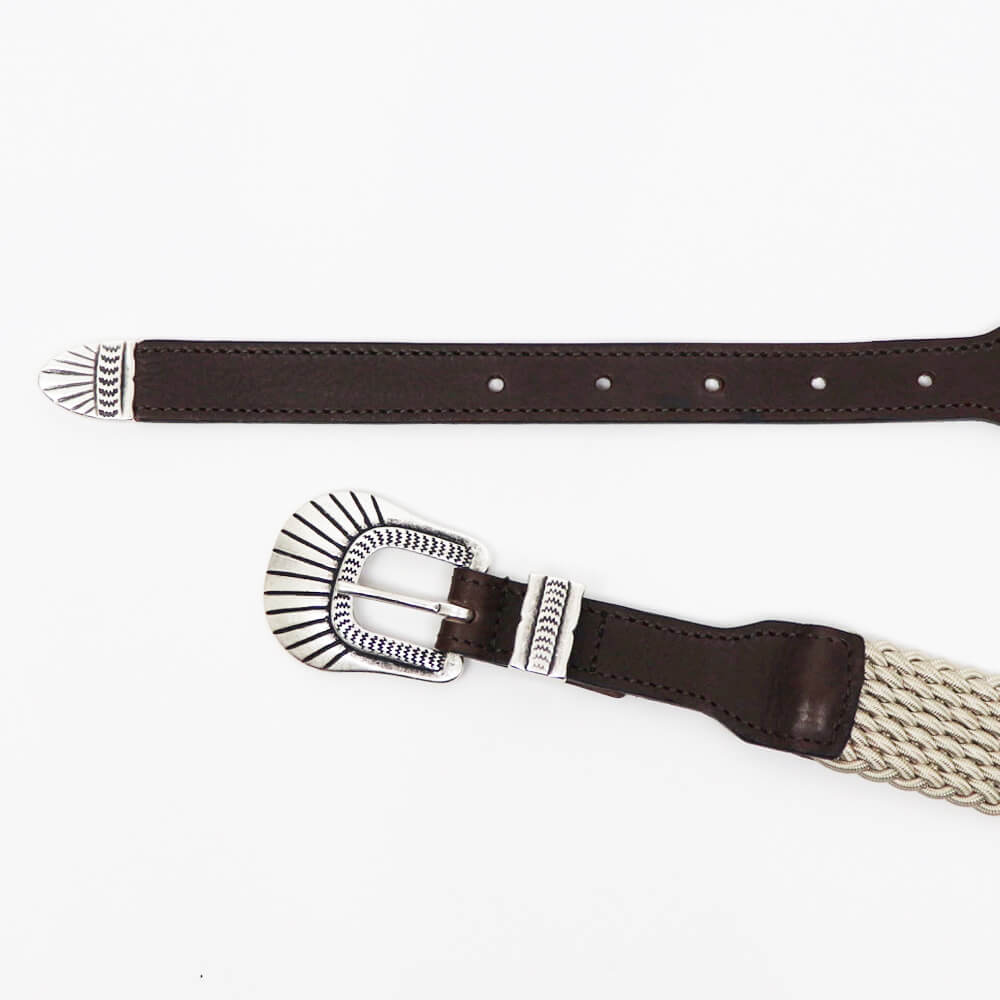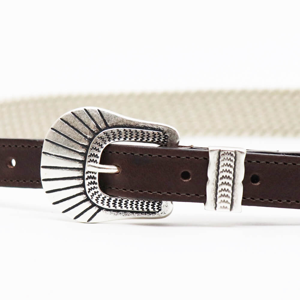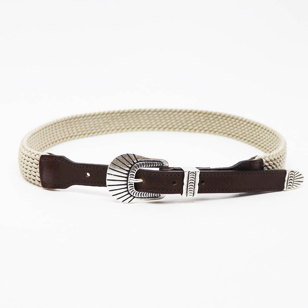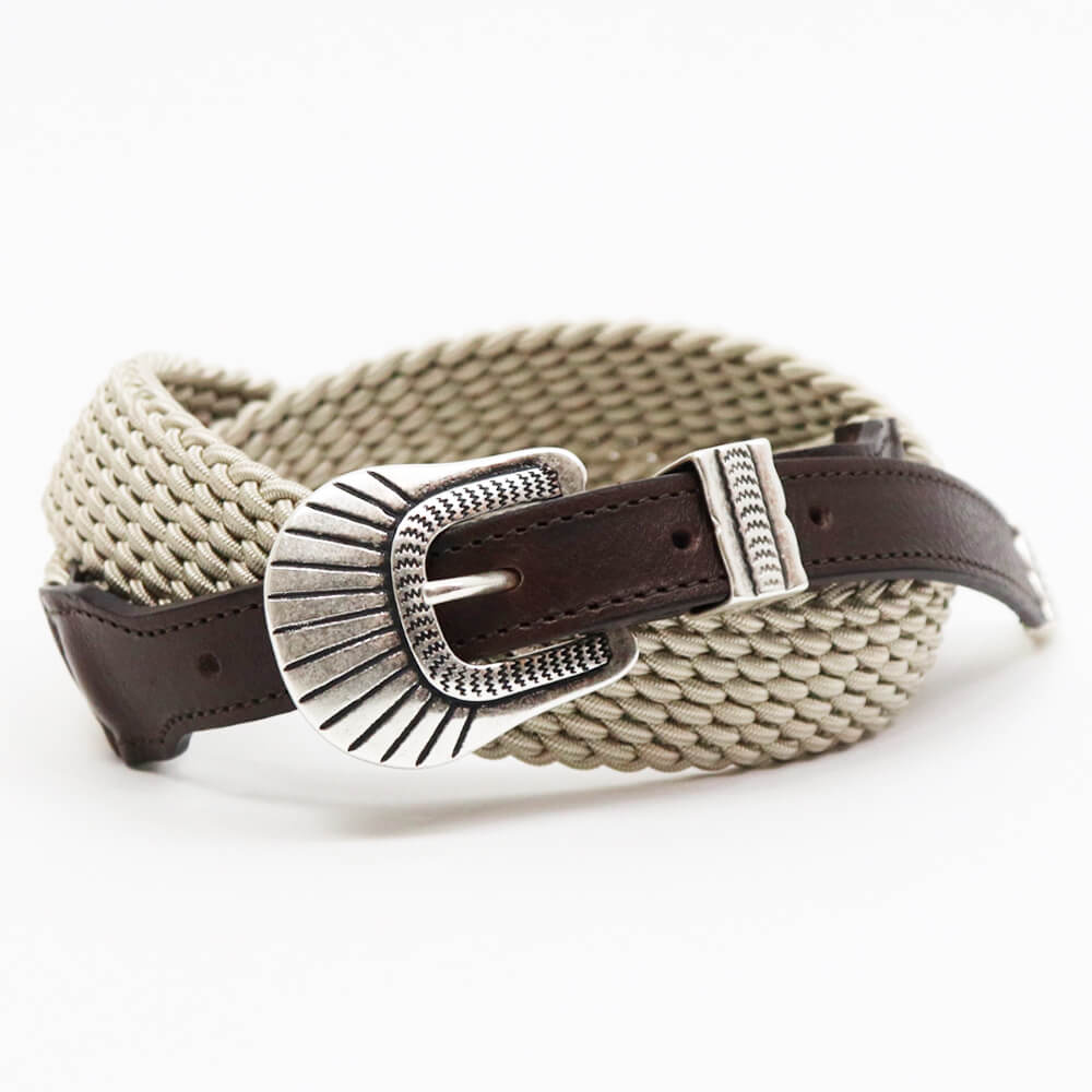 異素材のコンビネーションがD'AMICO(ダミーコ)らしい、遊び心のあるプンターレ付きのエラスティックベルトが入荷しました。エラスティック部分は約3cm幅、レザー部分は約2cm幅となっておりすっきりとした見た目で、素材のカジュアルさにより野暮ったくみえがちなエラスティックベルトを、伸縮するという付け心地の良さだけを残してスタイリッシュに仕上げた最高のベルトです。