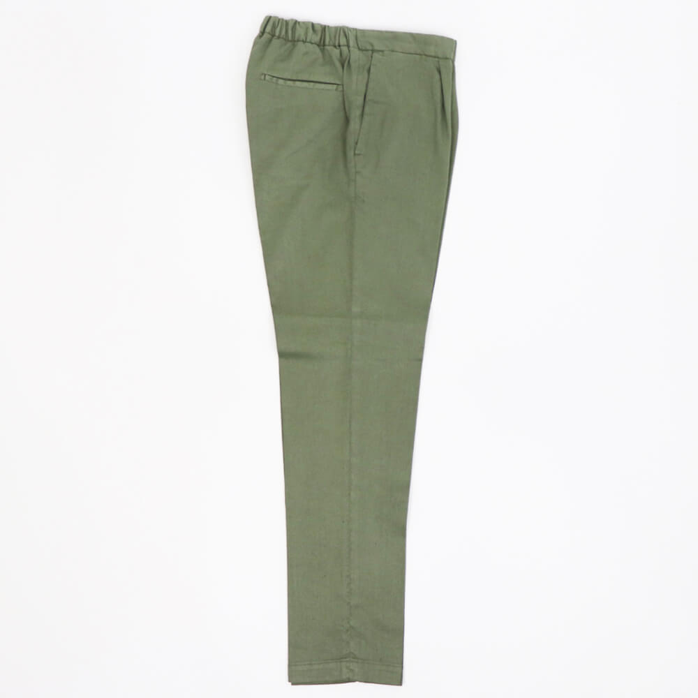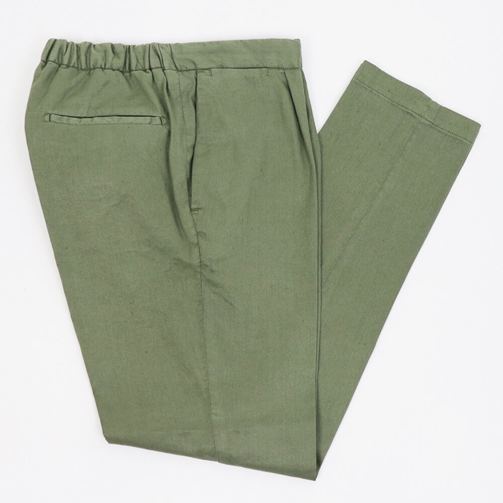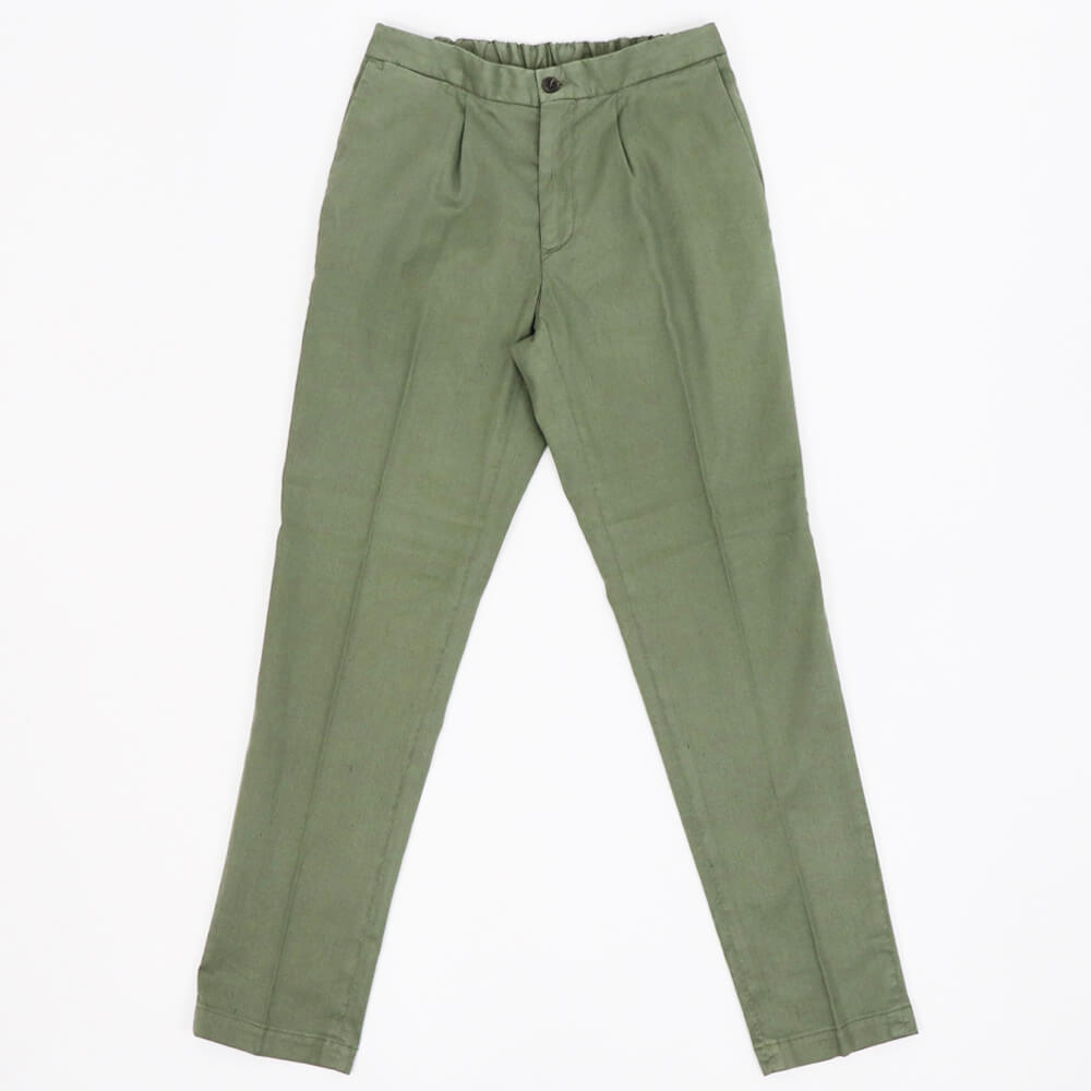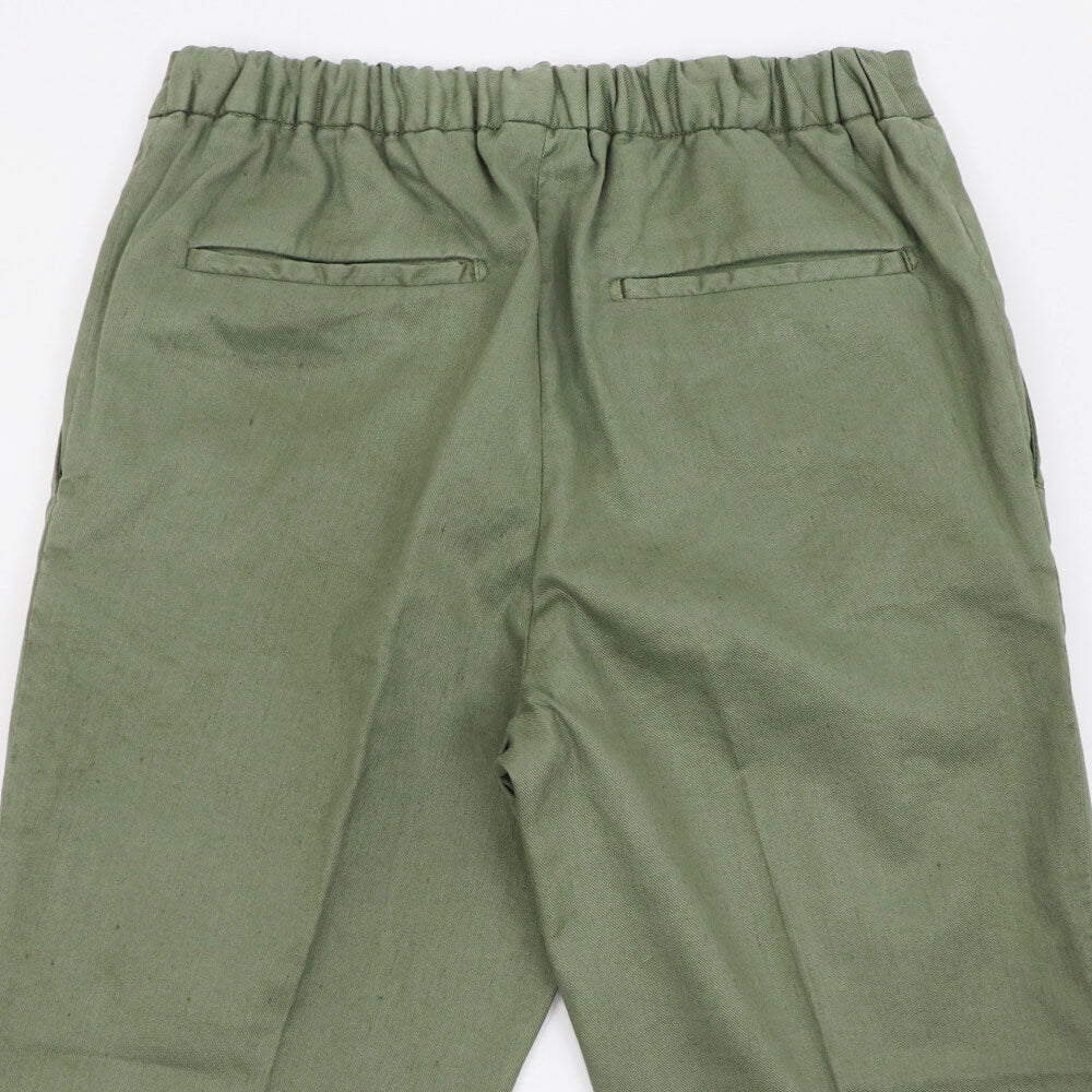 DEVORE(デヴォレ)の新作のパンツは春夏を意識したディテールの物をセレクト。ウエスト部分にドローストリングスと背面部分にゴムを仕込み、腰回りにゆとりを持たせ、自然なテーパードが魅力のモデルです。素材はコットンリネンで、ストレッチも効いているので春夏にピッタリ。スタイリングのポイントとしては、スニーカーはもちろんですが、エスパドリーユや、レザーサンダルなどでのコーディネートが理想的なパンツになります。