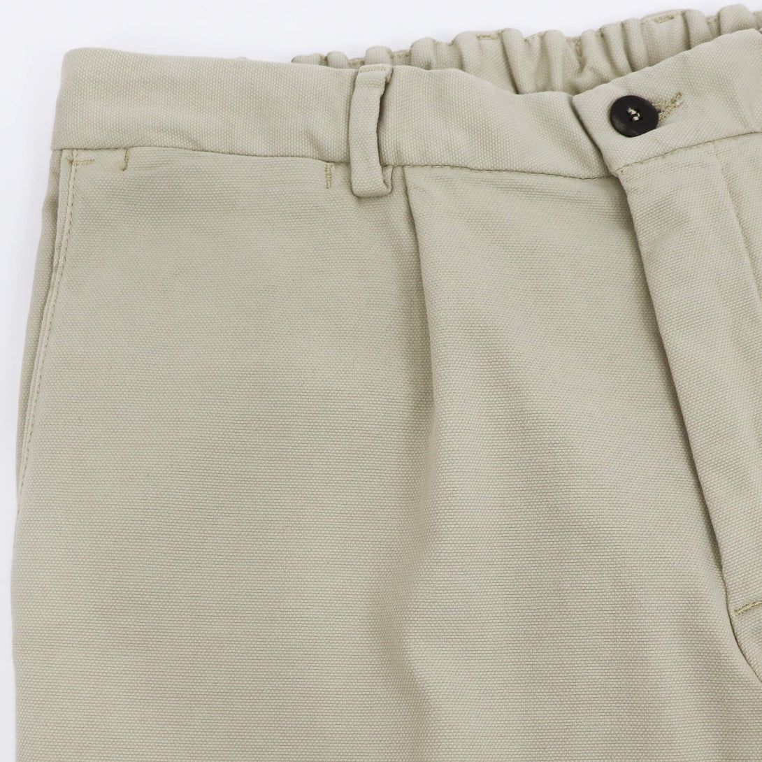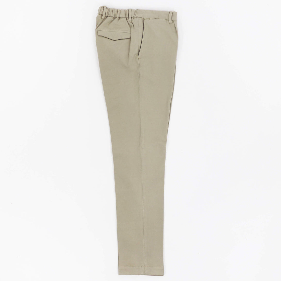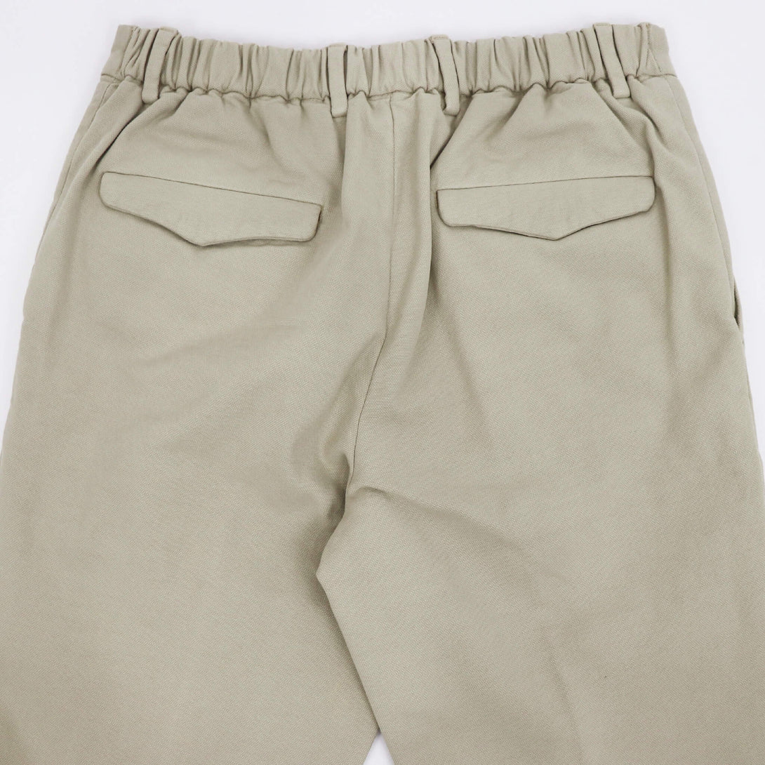 DEVORE(デヴォレ)の新作のパンツは秋冬を意識したコットンベースの物をセレクト。ウエスト部分は背面部分にゴムを仕込み、腰回りにゆとりを持たせ、自然なテーパードが魅力のモデルです。素材はコットン×エラスティックで、ストレッチも効いているのでストレスなく着用していただけます。