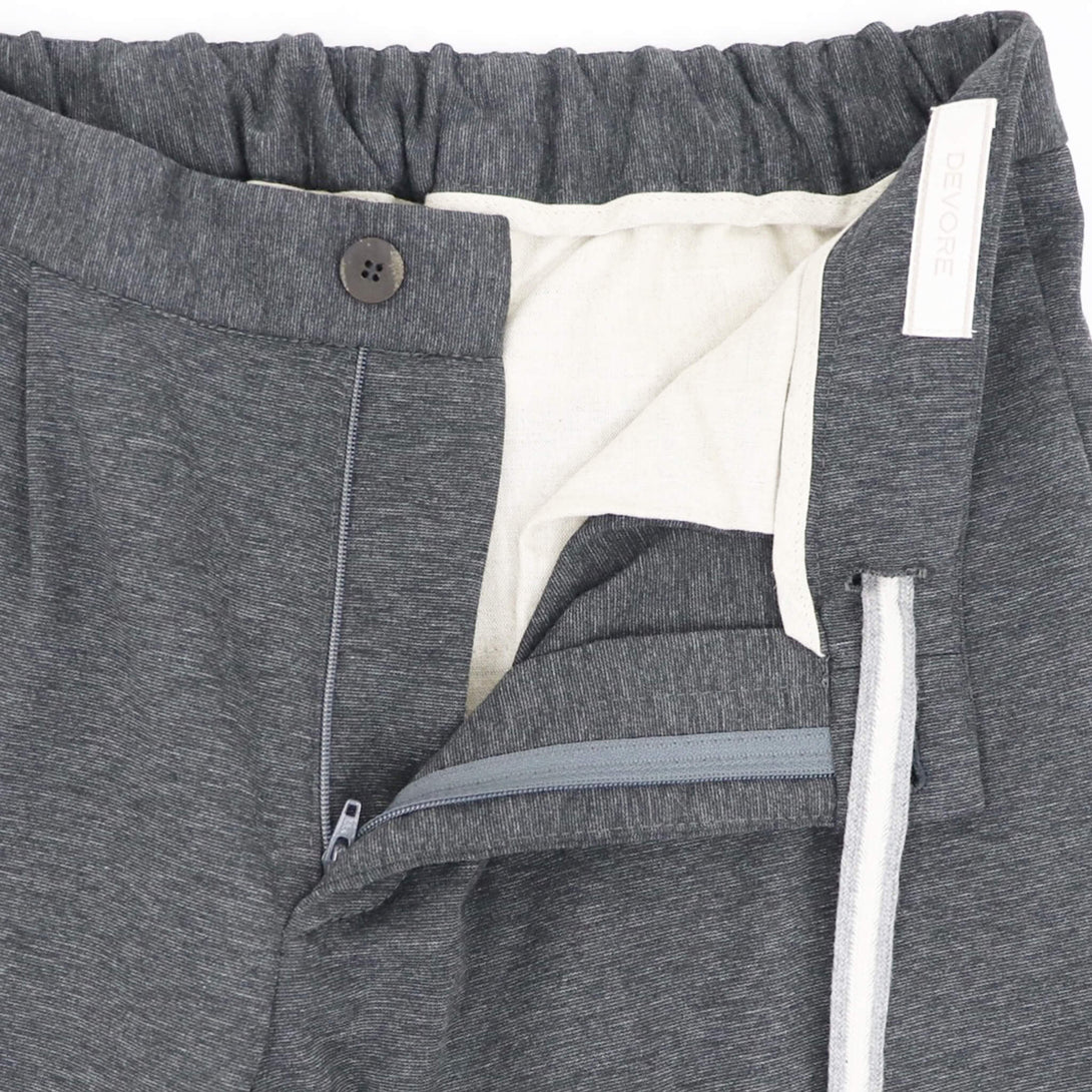 24F/WのDEVORE(デヴォレ)。ジャージー素材の新作パンツの登場です。ウエスト部分にドローストリングスと背面部分にゴムを仕込み、腰回りにゆとりを持たせ、自然なテーパードが魅力の細身モデル。