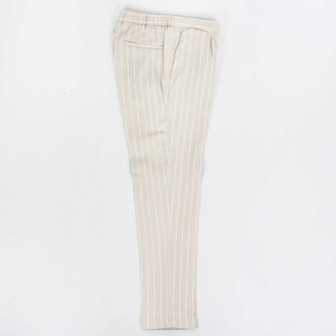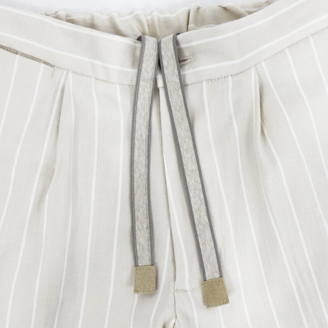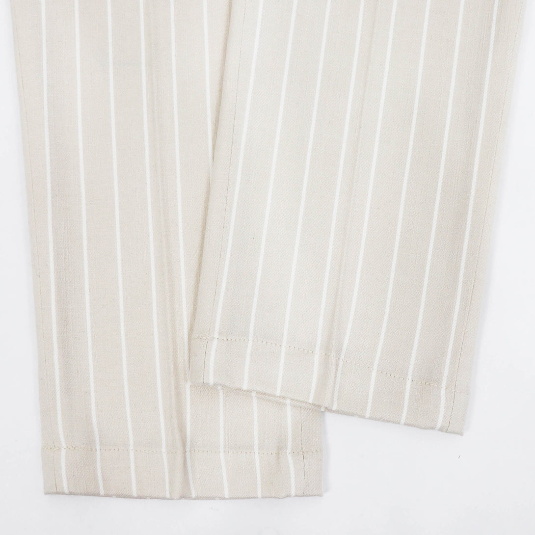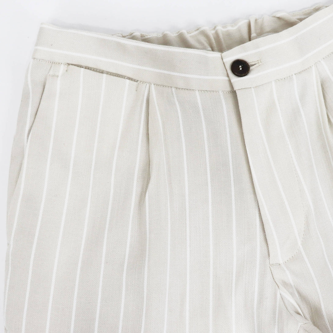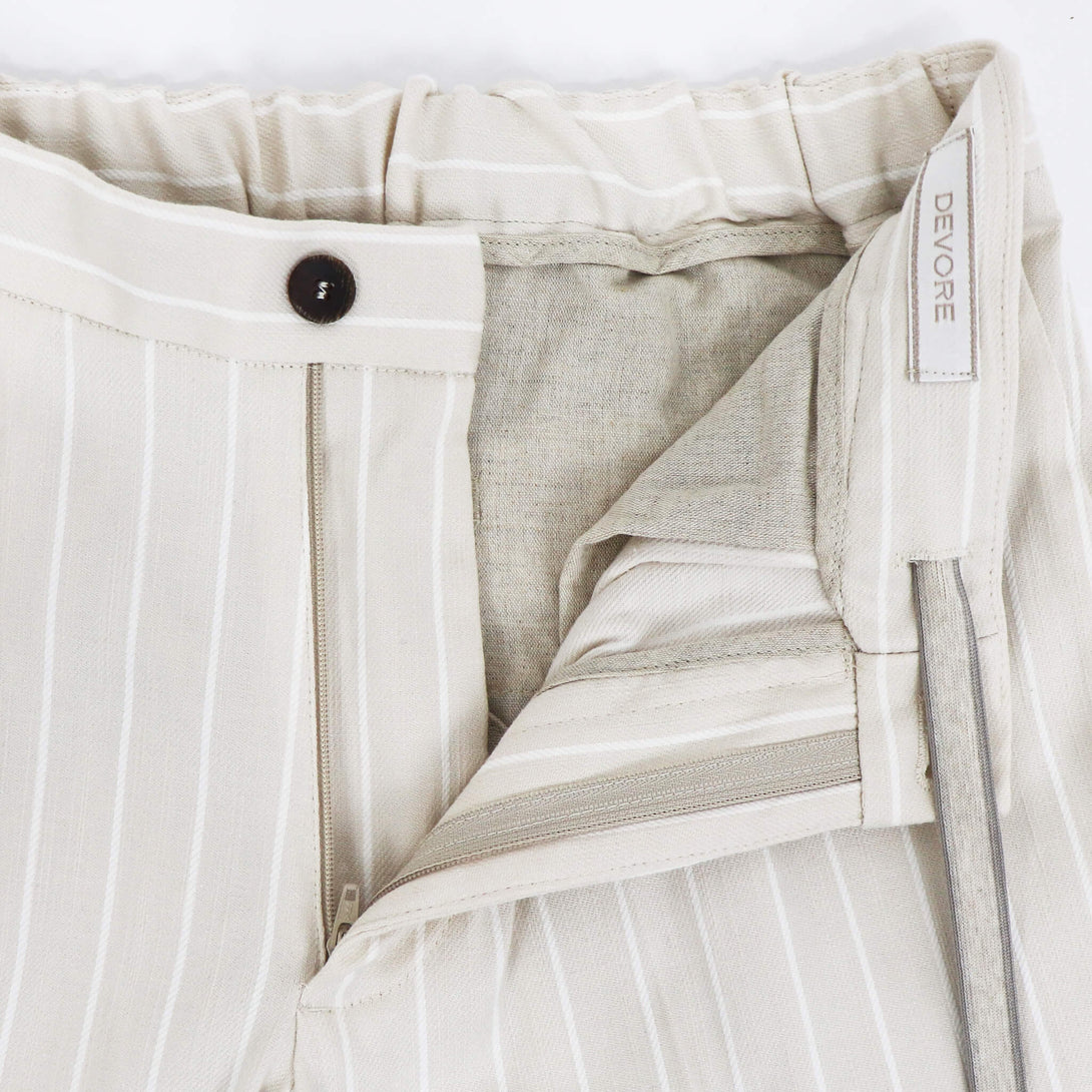 DEVORE(デヴォレ)の新作のパンツは春夏を意識したディテールの物をセレクト。ウエスト部分にドローストリングスと背面部分にゴムを仕込み、腰回りにゆとりを持たせ、自然なテーパードが魅力のモデルです。素材はコットンリネンで、ストレッチも効いているので春夏にピッタリ。スタイリングのポイントとしては、スニーカーはもちろんですが、エスパドリーユや、レザーサンダルなどでのコーディネートが理想的なパンツになります。