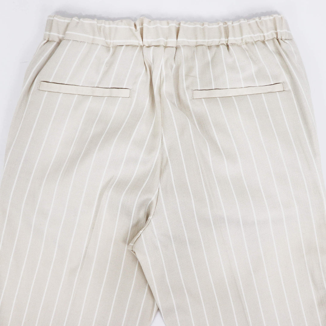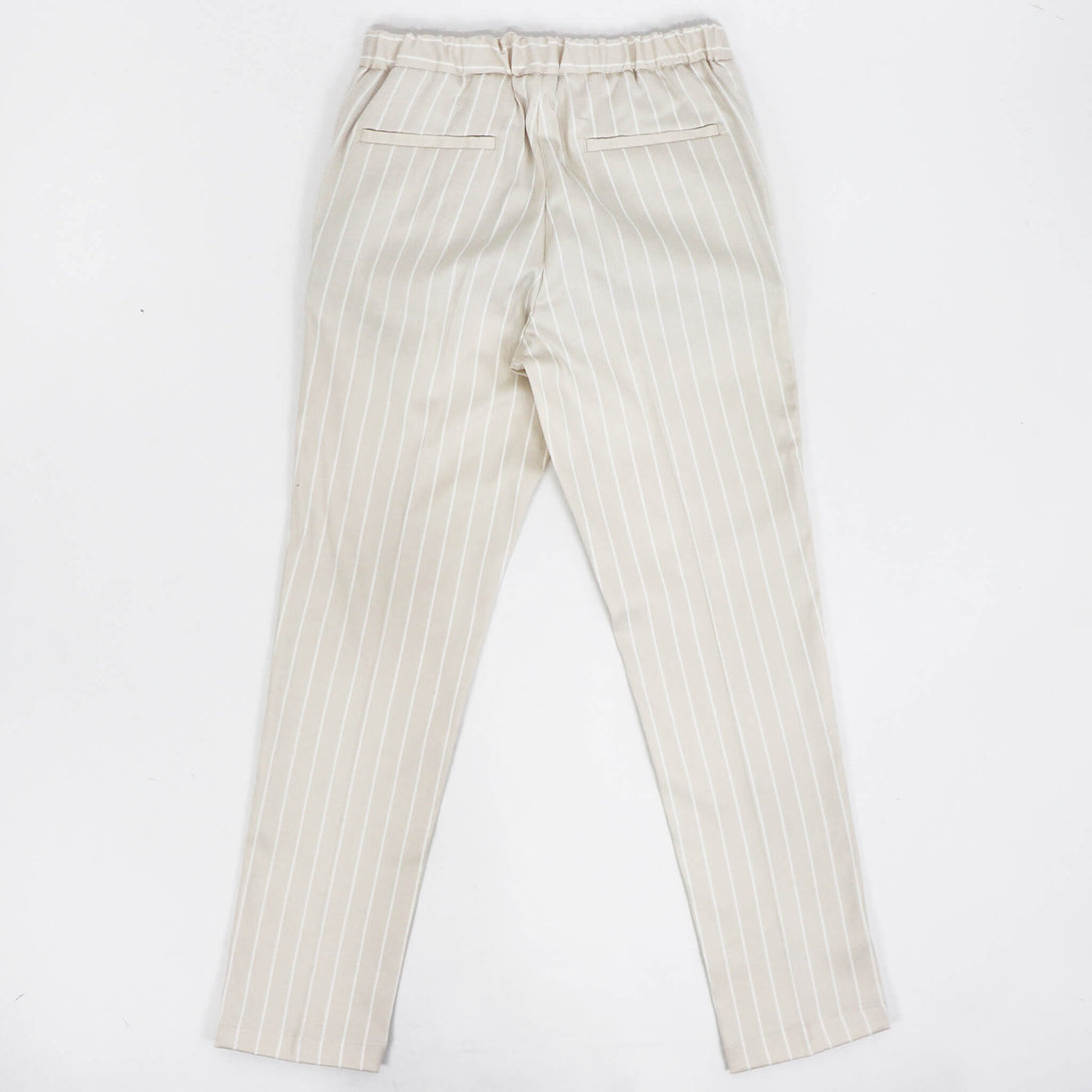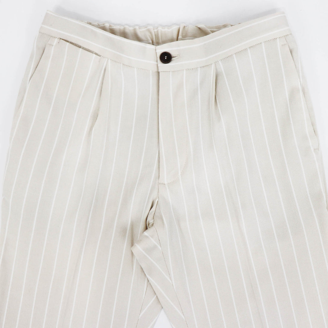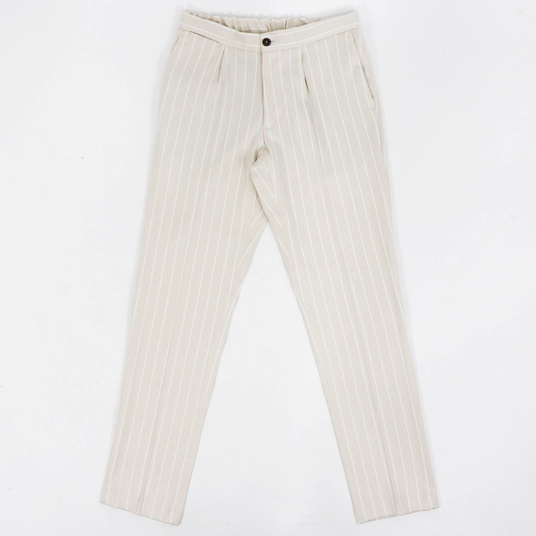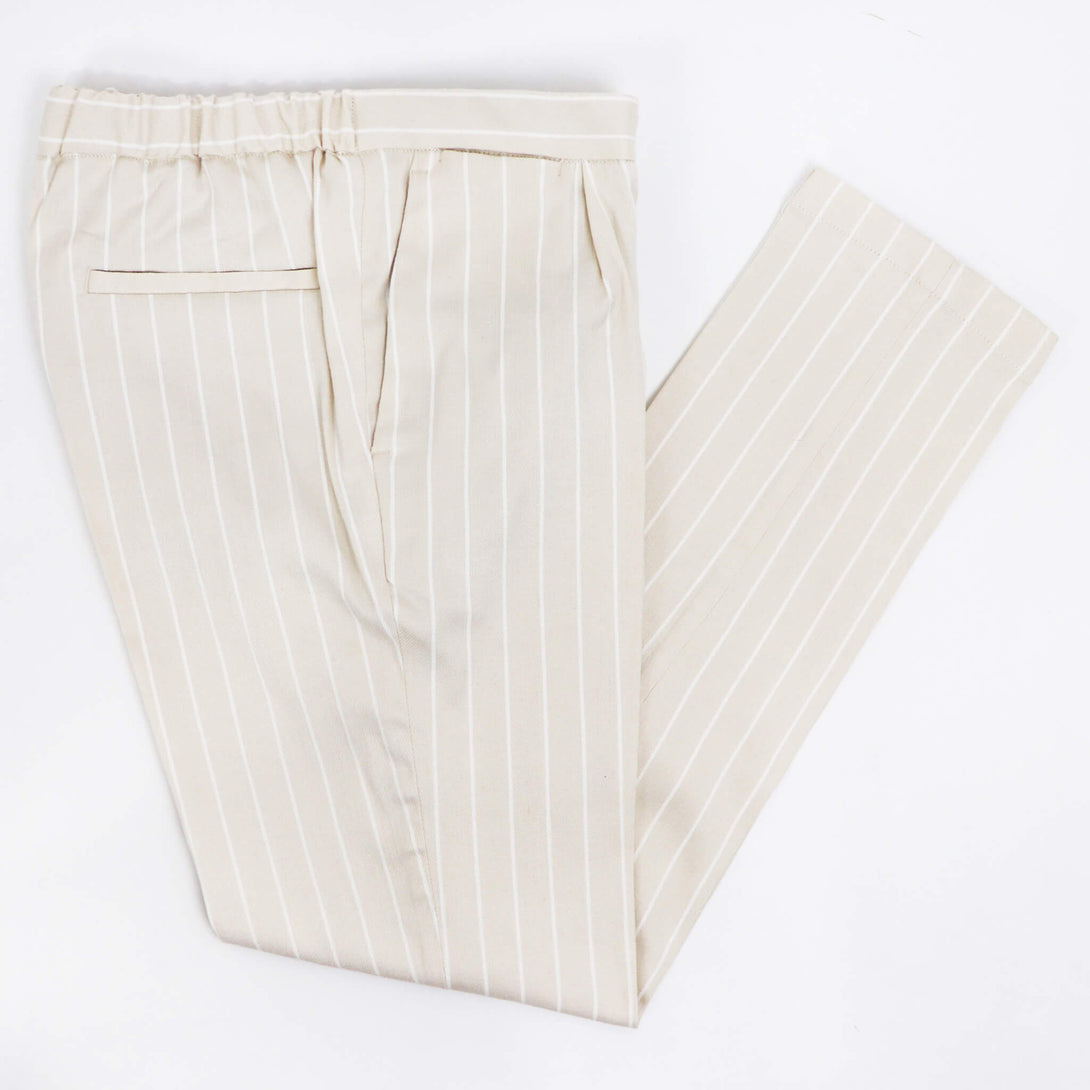 DEVORE(デヴォレ)の新作のパンツは春夏を意識したディテールの物をセレクト。ウエスト部分にドローストリングスと背面部分にゴムを仕込み、腰回りにゆとりを持たせ、自然なテーパードが魅力のモデルです。素材はコットンリネンで、ストレッチも効いているので春夏にピッタリ。スタイリングのポイントとしては、スニーカーはもちろんですが、エスパドリーユや、レザーサンダルなどでのコーディネートが理想的なパンツになります。