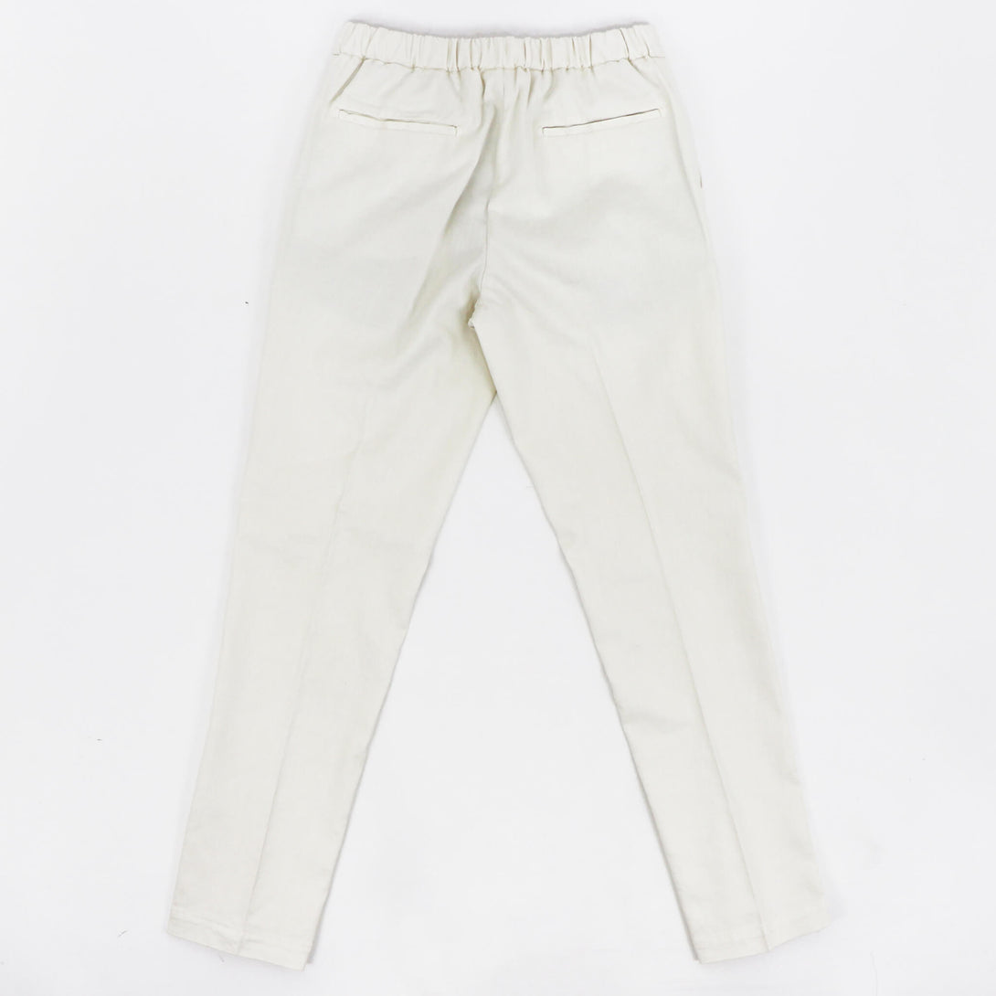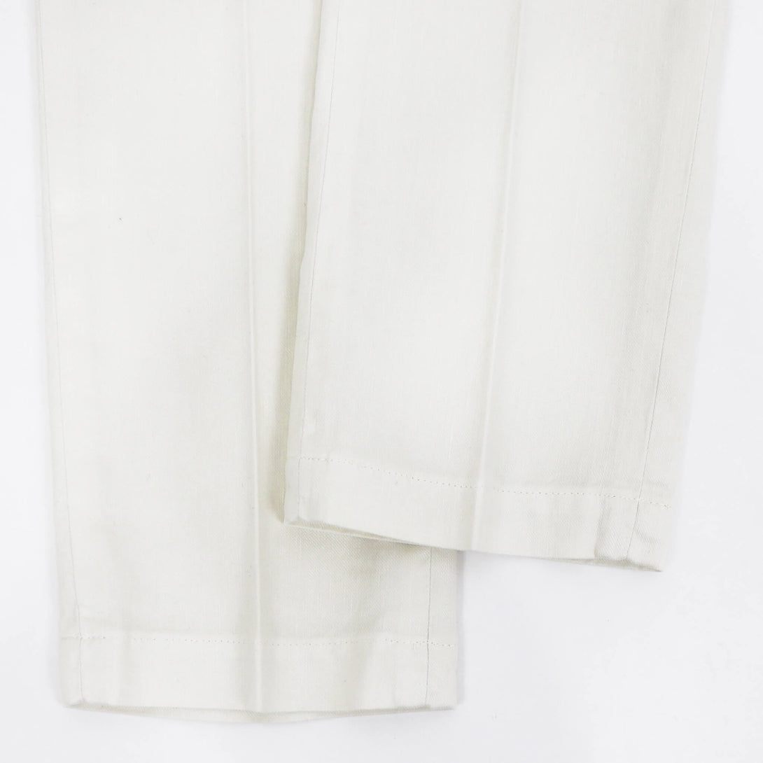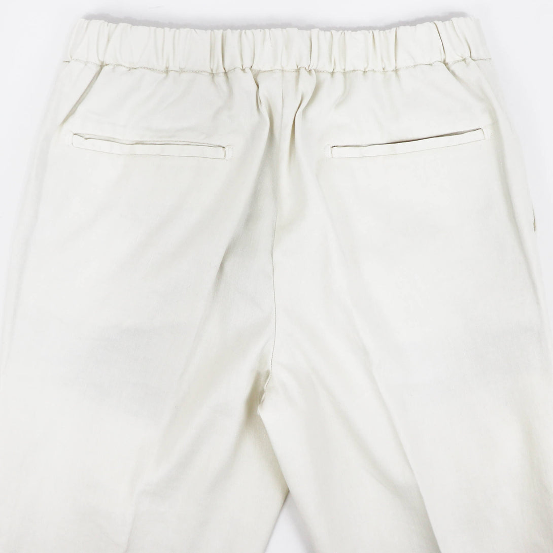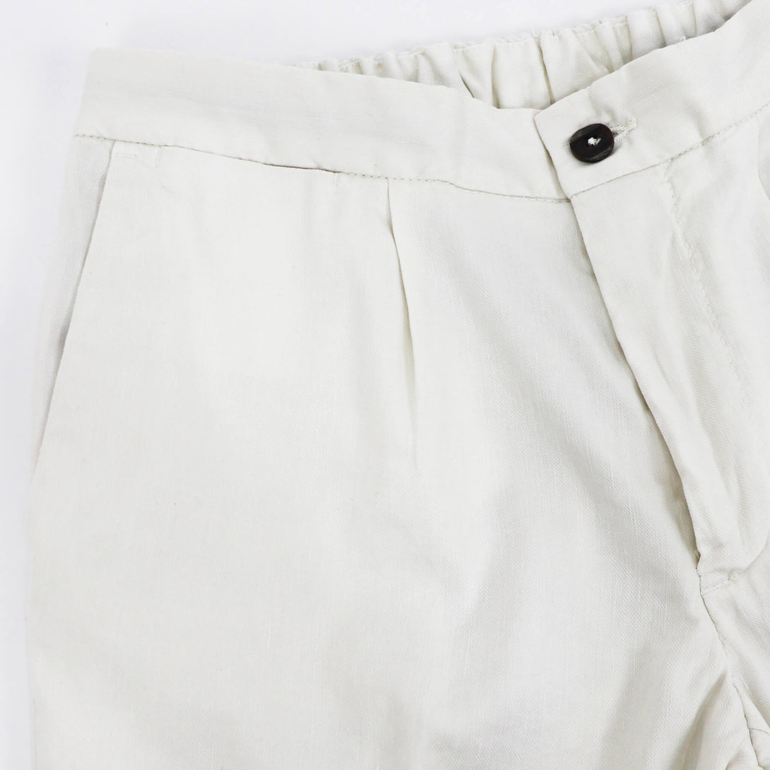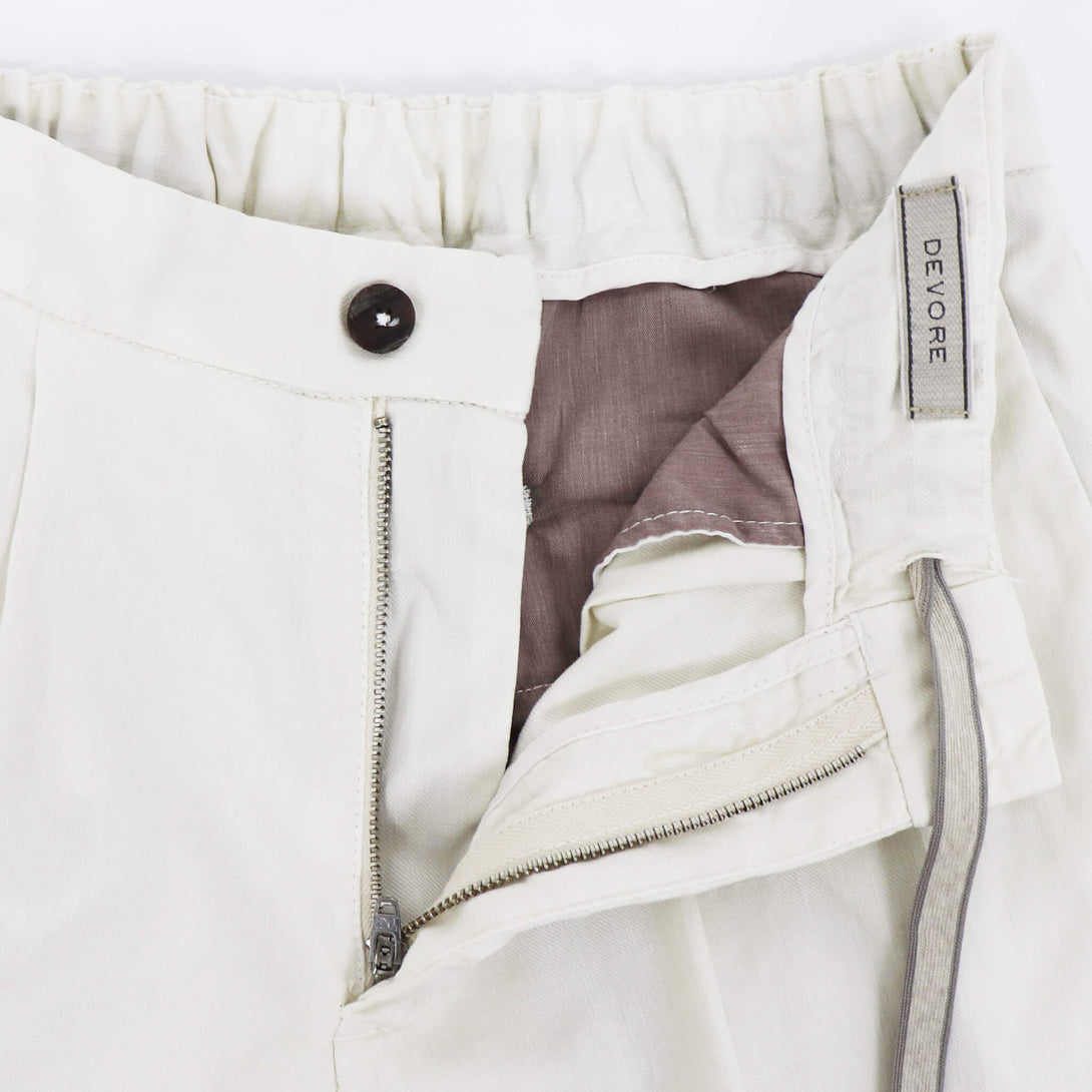 DEVORE(デヴォレ)の新作のパンツは春夏を意識したディテールの物をセレクト。ウエスト部分にドローストリングスと背面部分にゴムを仕込み、腰回りにゆとりを持たせ、自然なテーパードが魅力のモデルです。素材はコットンリネンで、ストレッチも効いているので春夏にピッタリ。スタイリングのポイントとしては、スニーカーはもちろんですが、エスパドリーユや、レザーサンダルなどでのコーディネートが理想的なパンツになります。