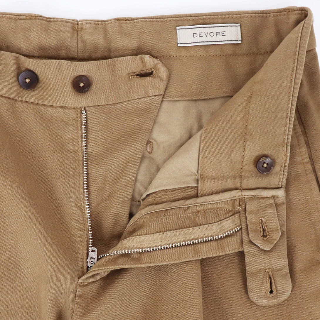 イタリア、ナポリのボトムス専業ブランド『DEVORE Incipit』(デヴォレ・インチピット)は、デザイナーの”Marco Re”(マルコ・レ)とナポリのパンツメーカー”Defra社”が立ち上げたブランドです。 多くのパンツメーカーが海外に生産拠点を移す中、自らの企画した生地を生産できるクォリティとマーケットでの適正な価格をナポリに見出しました。 Marco Reは「Brando」や「Boglioli」、「Tonello」をはじめとする数々のブランドのディレクションやコンサルタントに携わり、コットン生地の企画や製品染めに長けており、DEVOREを代表する”Solaro(ソラーロ)”生地は彼がオリジナルで企画し作られています。 またミリタリーにも精通しており、非常に多くのアーカイブを保有し、随所にミリタリーの素材やディテールを取り入れています。