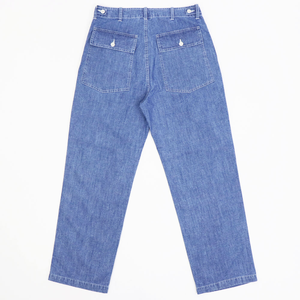 ワイドなストレートシルエットでアメリカの無骨な雰囲気を彷彿とさせ、フロントのパッチポケットにサイドアジャスター、フラップ付のバックポケットなどミリタリーの要素が詰まったディテールとなっています。