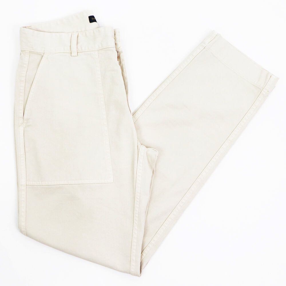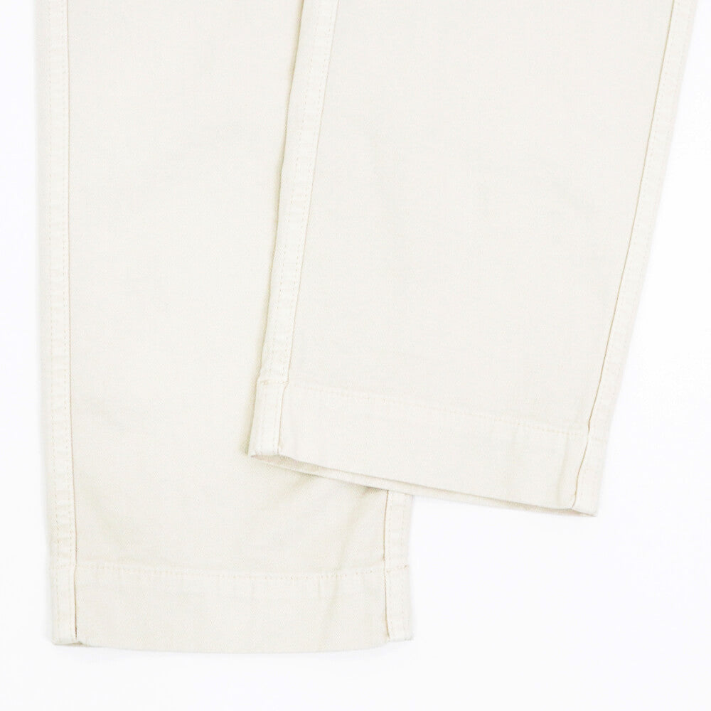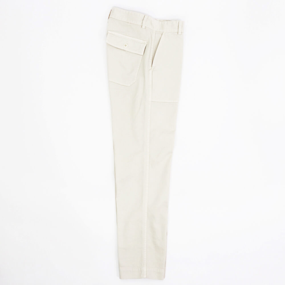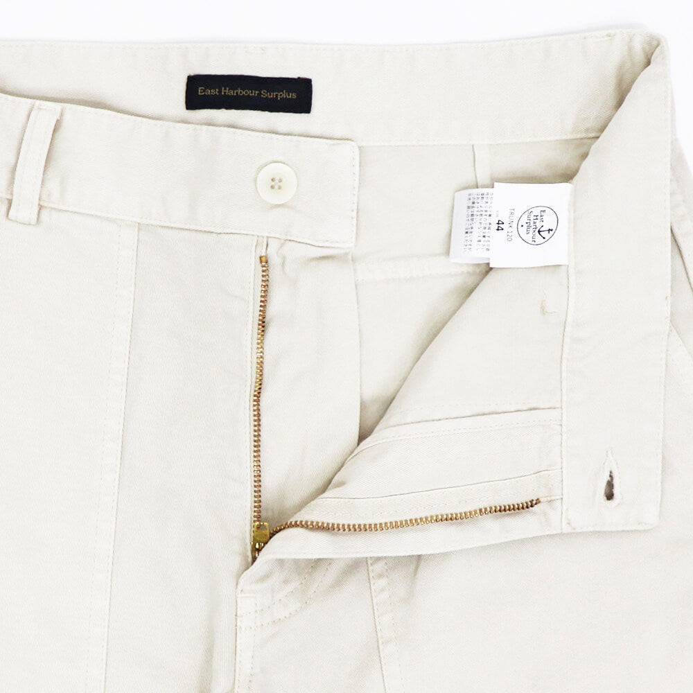 コットン97%ポリウレタン3%のストレッチツイル素材に洗いをかけたベイカーパンツ。股上は深すぎず渡りや膝幅もスッキリとした上品なシルエット。ワーク&ミリタリーな無骨さも感じられるがどことなくイタリアのクラシックなパンツの雰囲気が読み取れるパンツに仕上がっています。誂えたテーラードジャケットや綺麗めなシューズと合わせるととても馴染んでくれるイーストハーバーサープラスらしい仕上がりになっています。