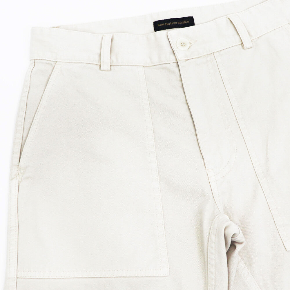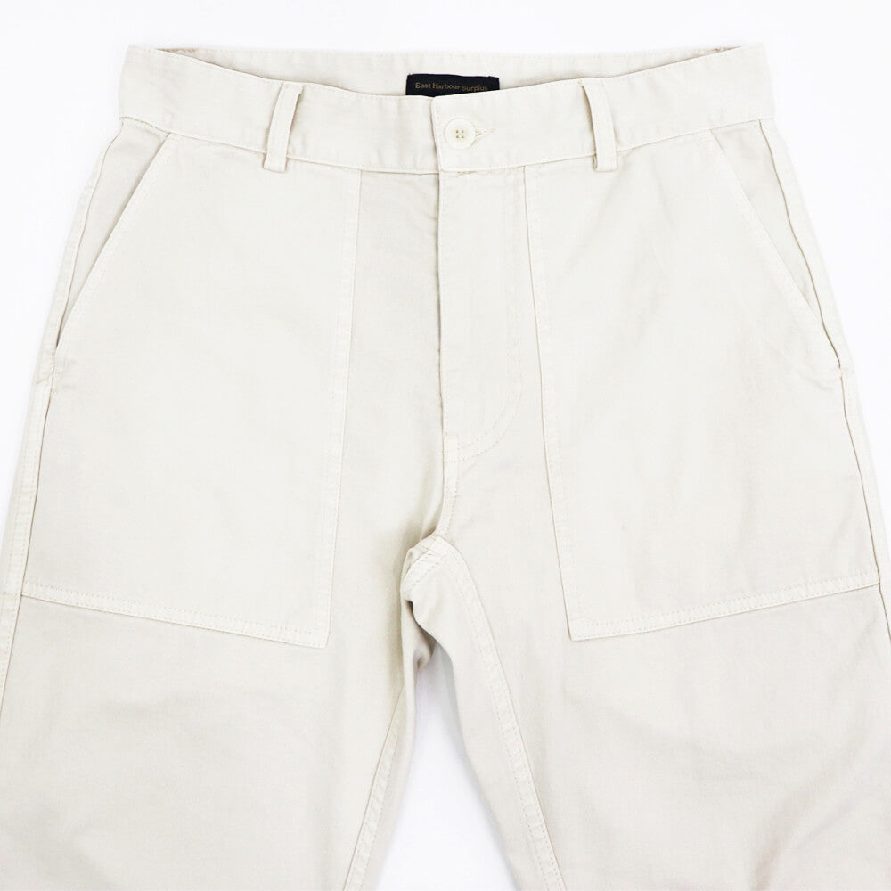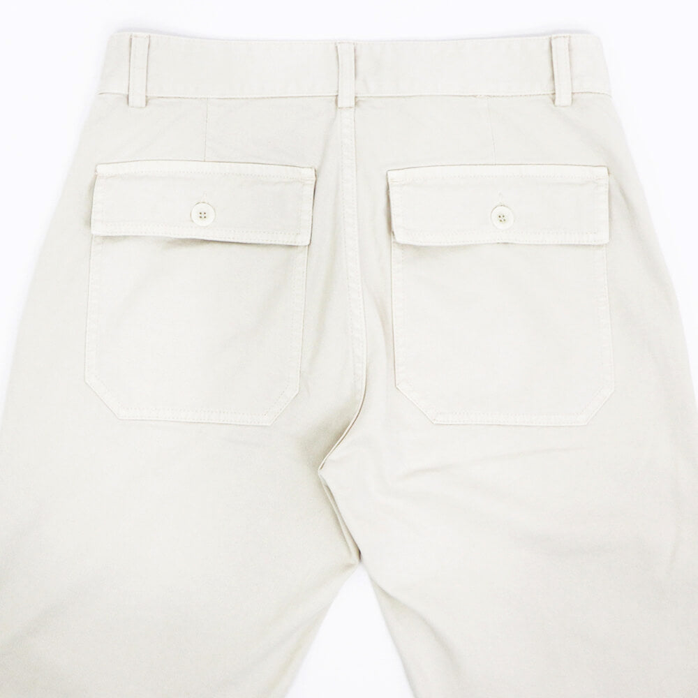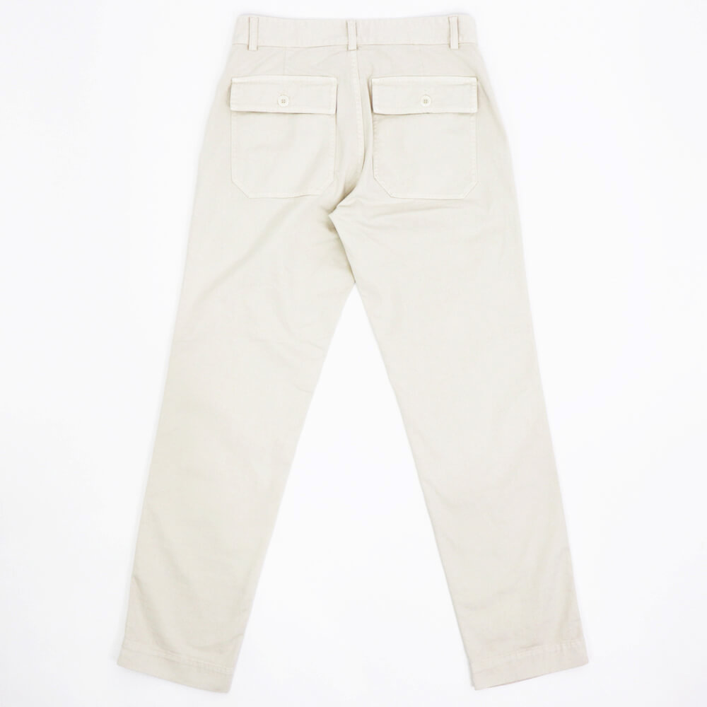 コットン97%ポリウレタン3%のストレッチツイル素材に洗いをかけたベイカーパンツ。股上は深すぎず渡りや膝幅もスッキリとした上品なシルエット。ワーク&ミリタリーな無骨さも感じられるがどことなくイタリアのクラシックなパンツの雰囲気が読み取れるパンツに仕上がっています。誂えたテーラードジャケットや綺麗めなシューズと合わせるととても馴染んでくれるイーストハーバーサープラスらしい仕上がりになっています。