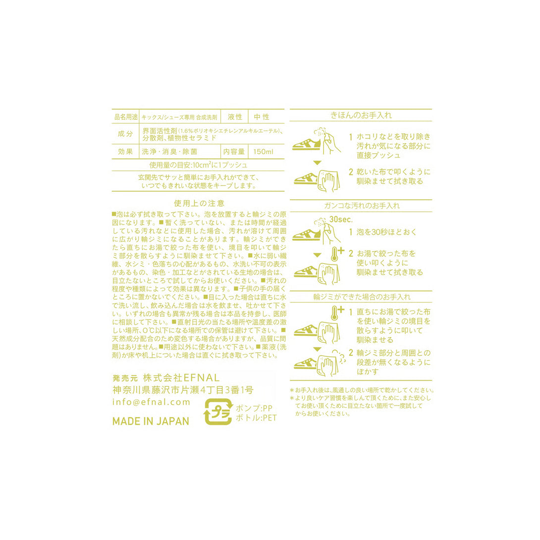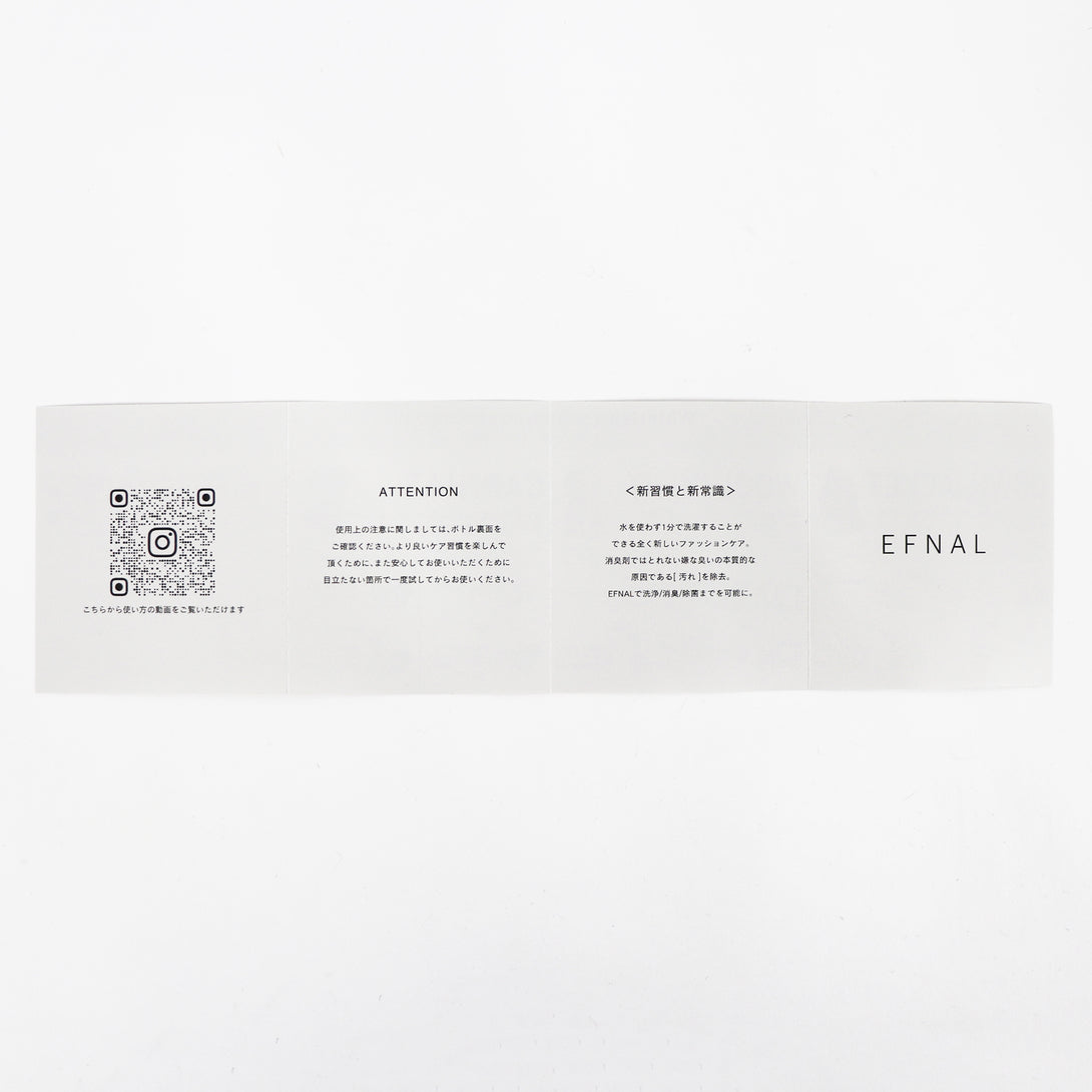 「新習慣と新常識」をコンセプトに普段簡単に洗うことができない、洗いにくいアイテムを水を使わず1分で洗濯することができる全く新しいファッションケアブランドです。消臭剤ではとれない嫌な臭いの本質的な原因である「汚れ」を除去します。EFNALで洗浄/消臭/除菌までを可能に。