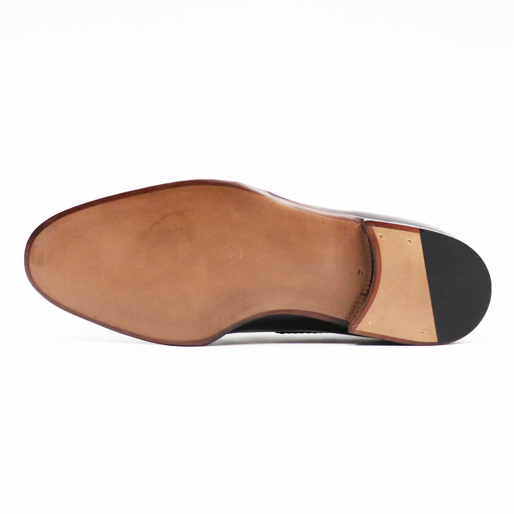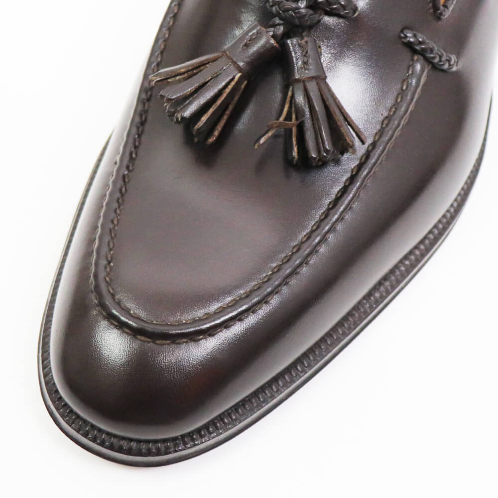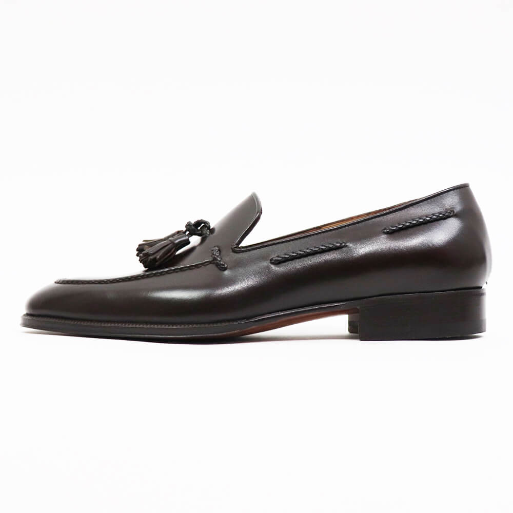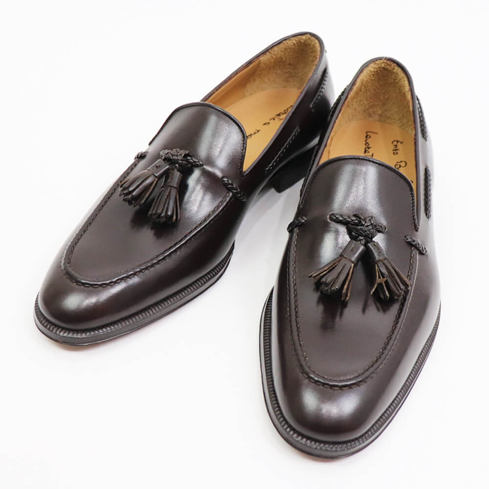 老舗英国タンナー〈ANNONAY(アノネイ)〉社の上質なカーフレザーを採用した〈ENZO BONAFE〉のタッセルローファー『LIPPI 』。本モデルは、タッセルの腰ベルトをメッシュベルトに変更した別注品です。出し縫い以外を手作業で丁寧に作り、既製靴ながらビスポークシューズのような仕上がりが魅力。控えめなモカ縫い、素材の上品な艶感としなやかさによるエレガントな表情は同ブランドならではの佇まいです。クラフトマンシップ感じる、ドレススタイルに取り入れたい1足です。