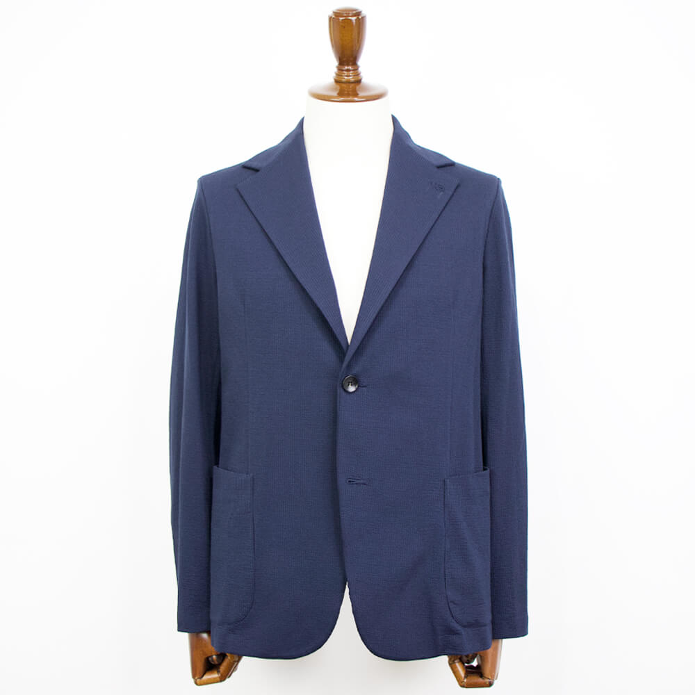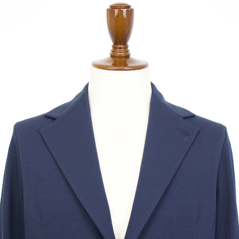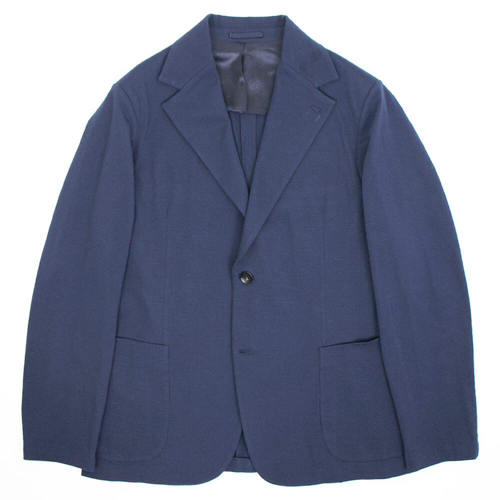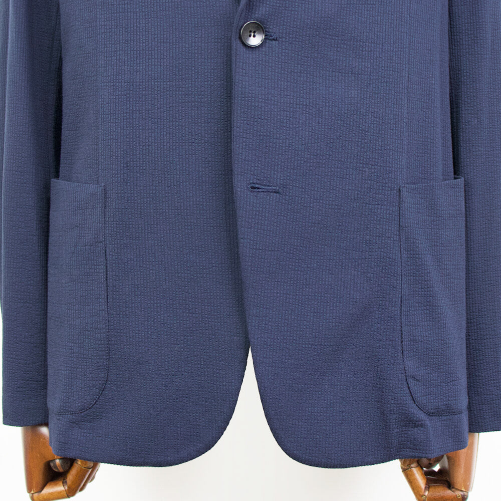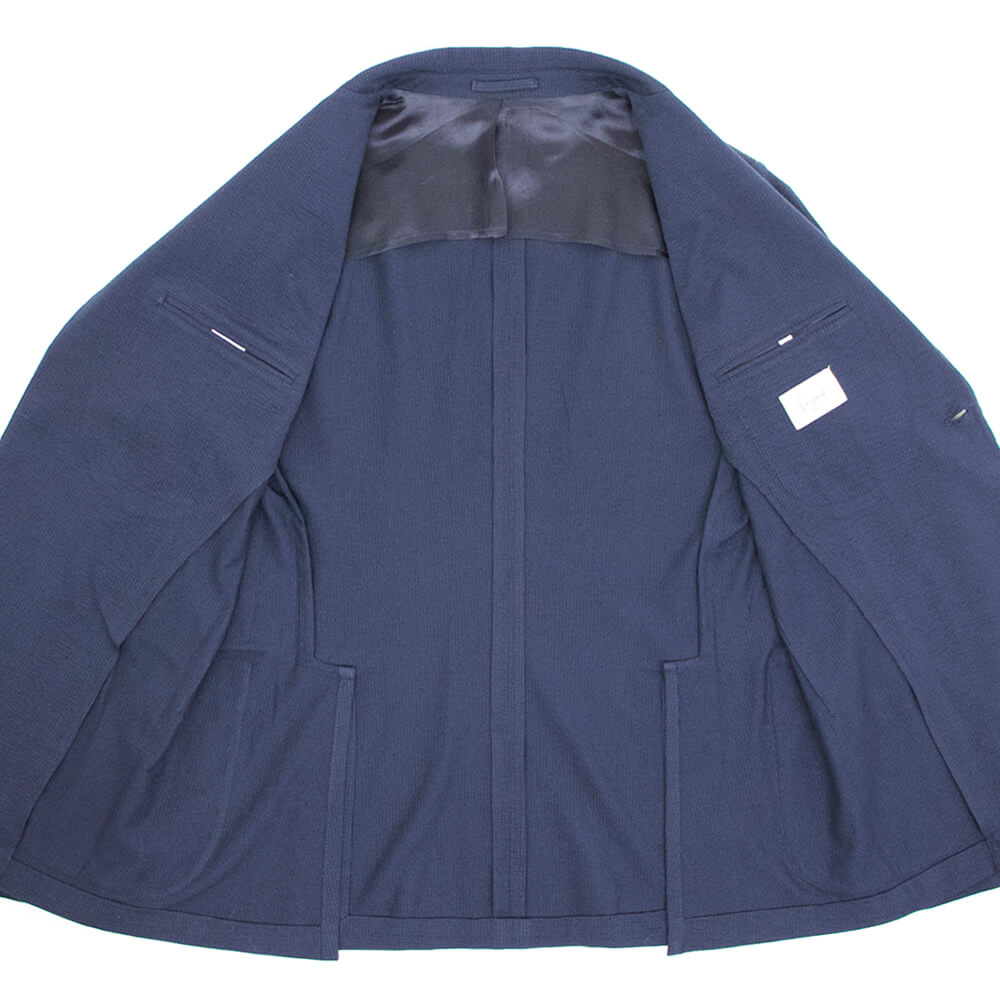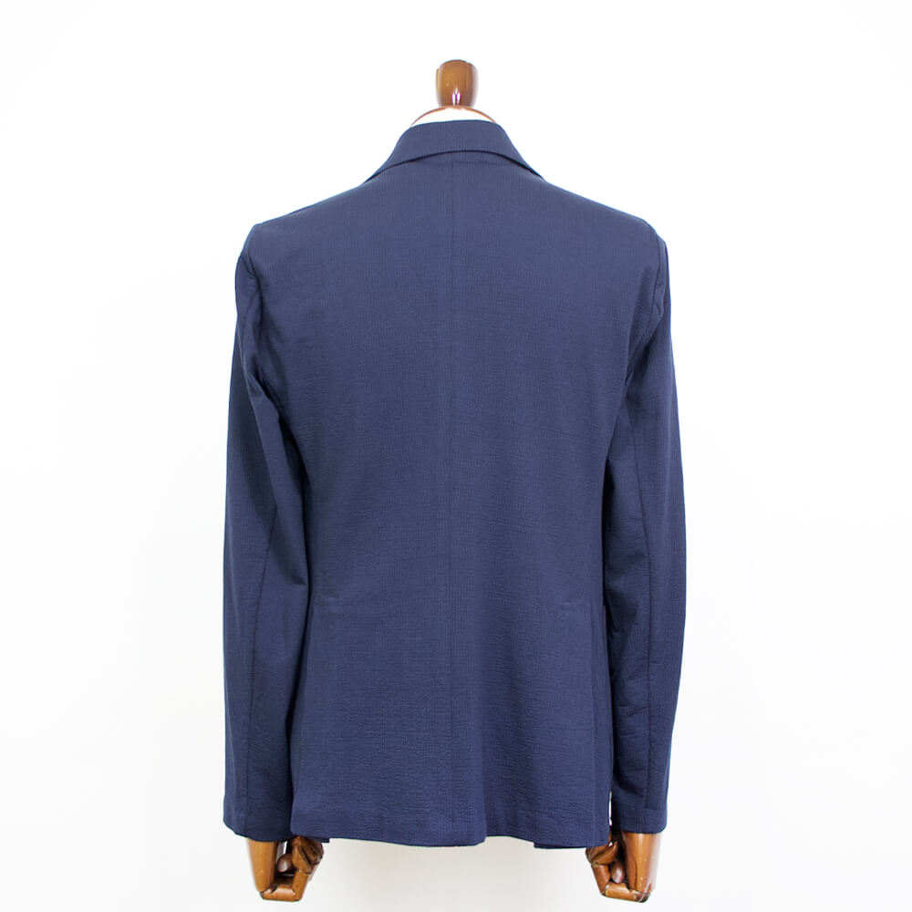 ポリエステル混のコットン素材のシアサッカー生地は伸縮性があり、タイトなシルエットながら窮屈さを感じることはありません。また裏地を設けない一枚仕立ては軽量で通気性にも優れた涼しげな着心地を実現しています。肩パッドや芯地や副資材を省いた軽やかな仕上がりはさしずめ厚手のシャツのようにも感じます。