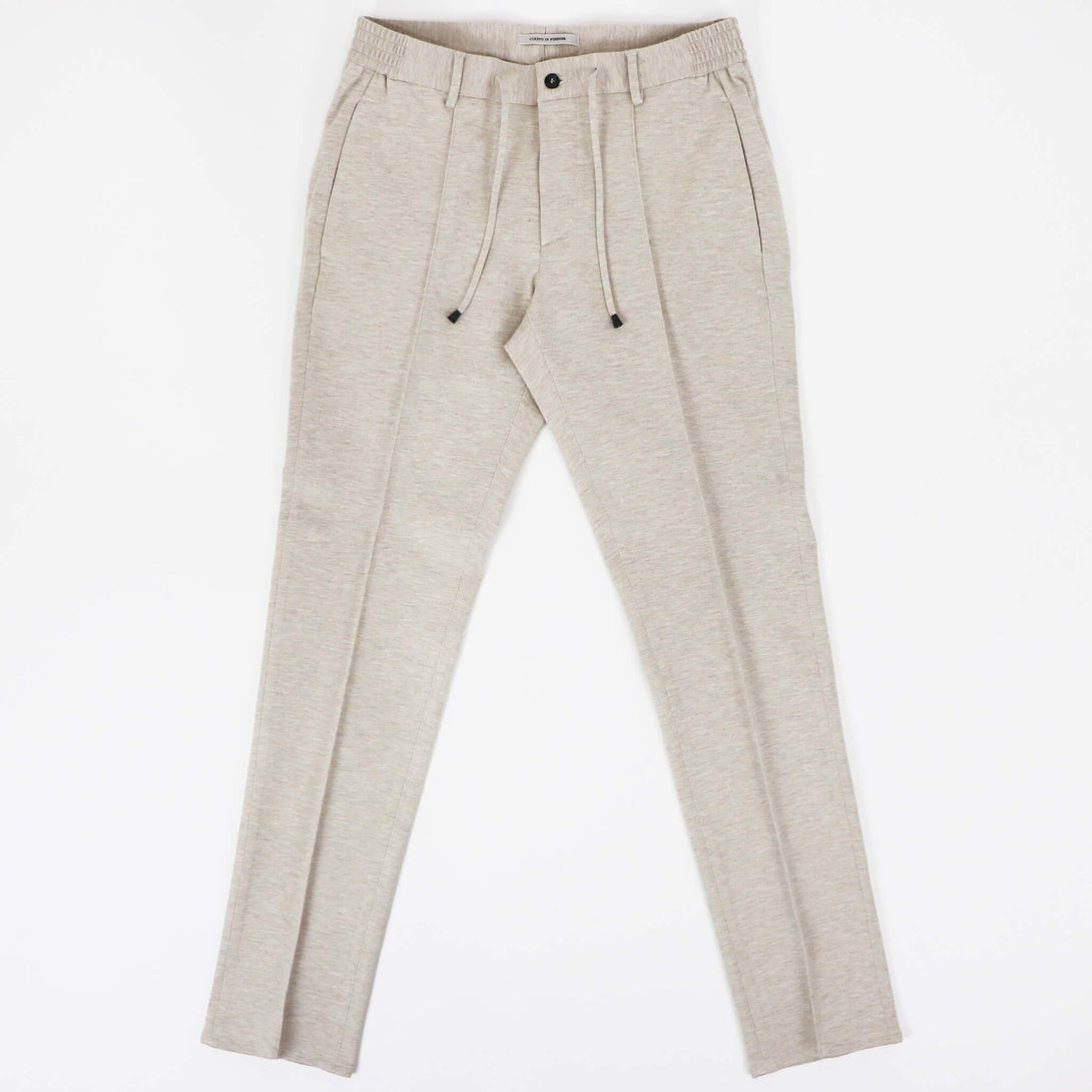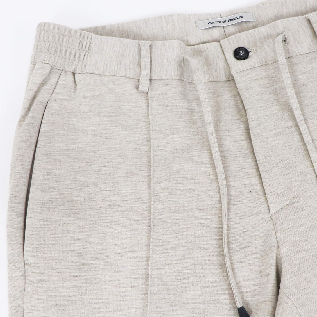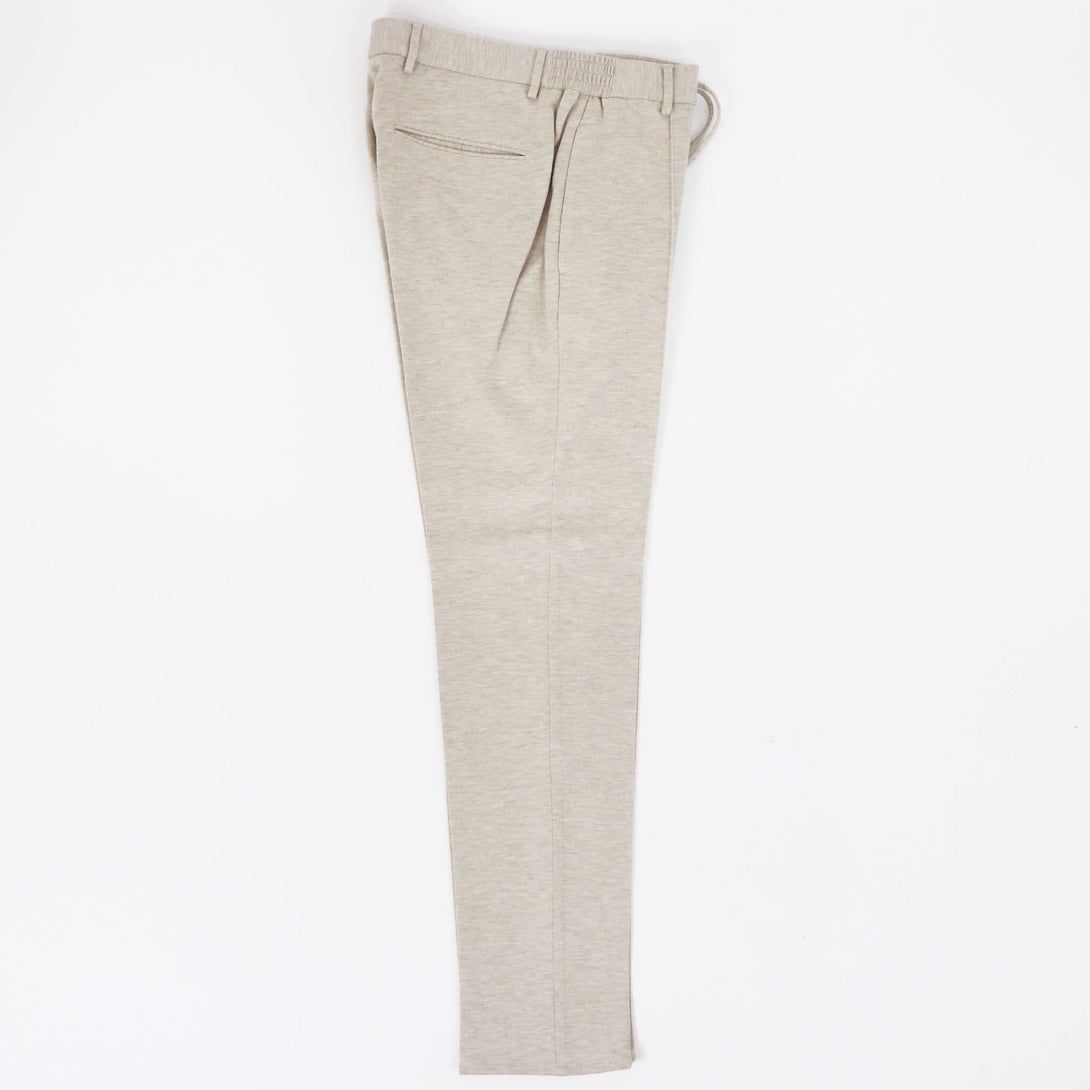 giabsarchivio(ジャブスアルキヴィオ)の人気モデル「MASACCIO / マサッチョ」生地はgiabsではお馴染みの、打ち込みがしっかりしているので適度な肉感と張り感があり、ジャージー素材特有の高い伸縮性も実現しています。これによりストレスを感じる事なく快適な穿き心地に仕上がっています。ジャージー素材によくある膝が出やすいという難点は抜群のキックバックにより解消されています。このモデルの最大の特徴はやはりフロントに入ったクリースですね。このクリースにはタタキが施されているのでアイロンをかけなくても半永久的にクリースが入ったままです。これにより縦のラインが強調され、スリムテーパードの美しいシルエットがより際立ちます。さらに脚を長く見せる効果もあり穿くだけでスタイルアップに一役かってくれます。