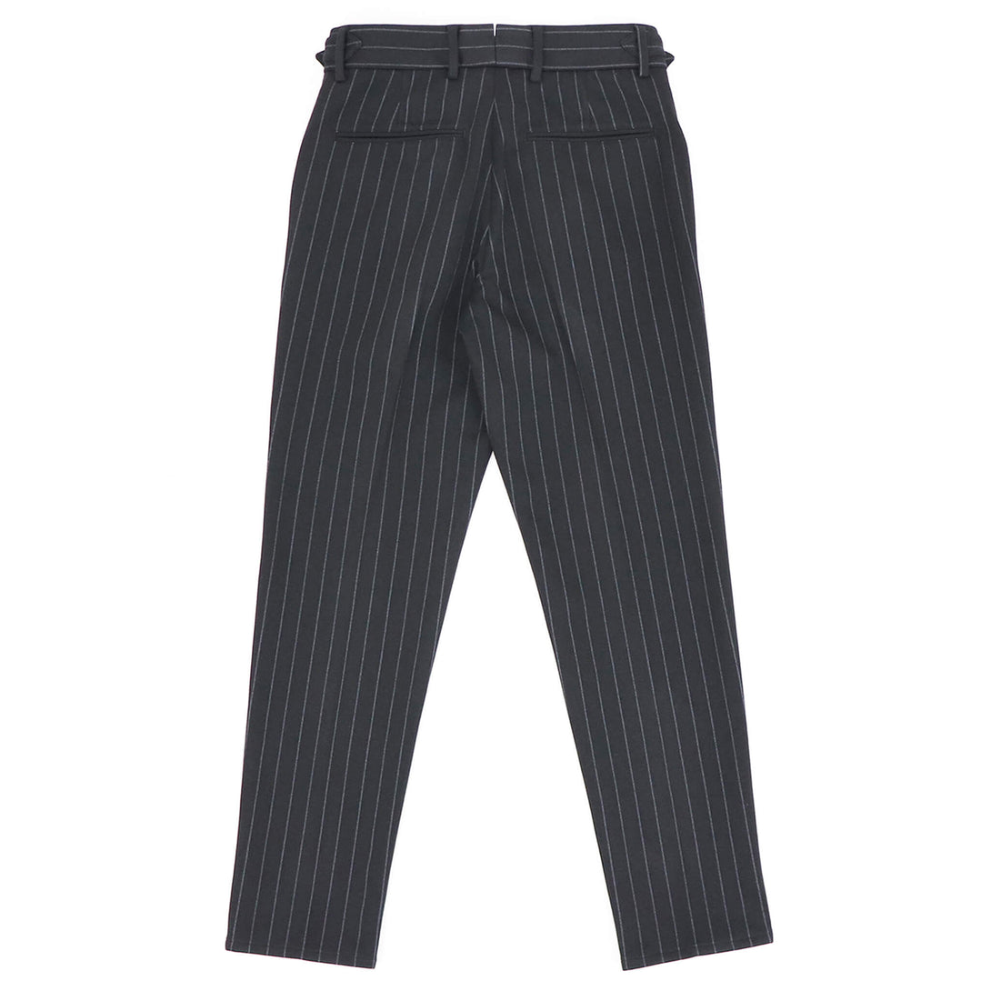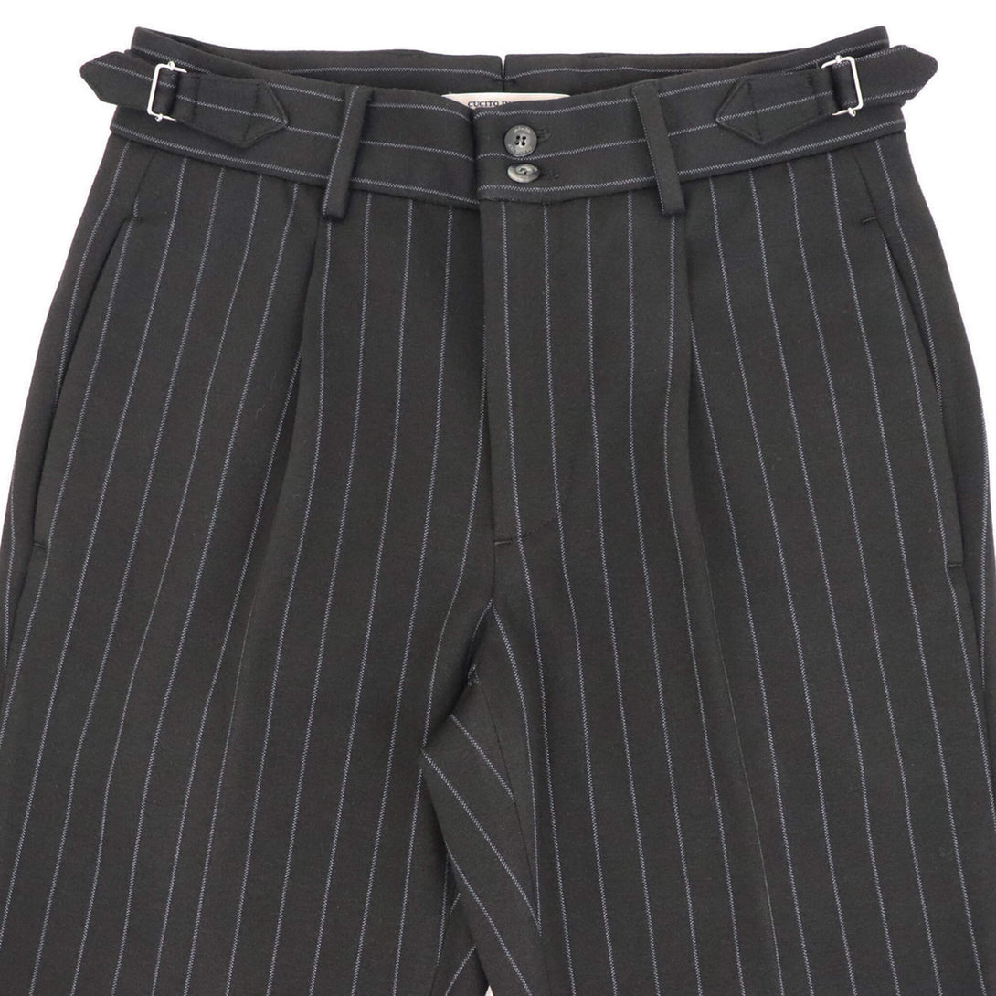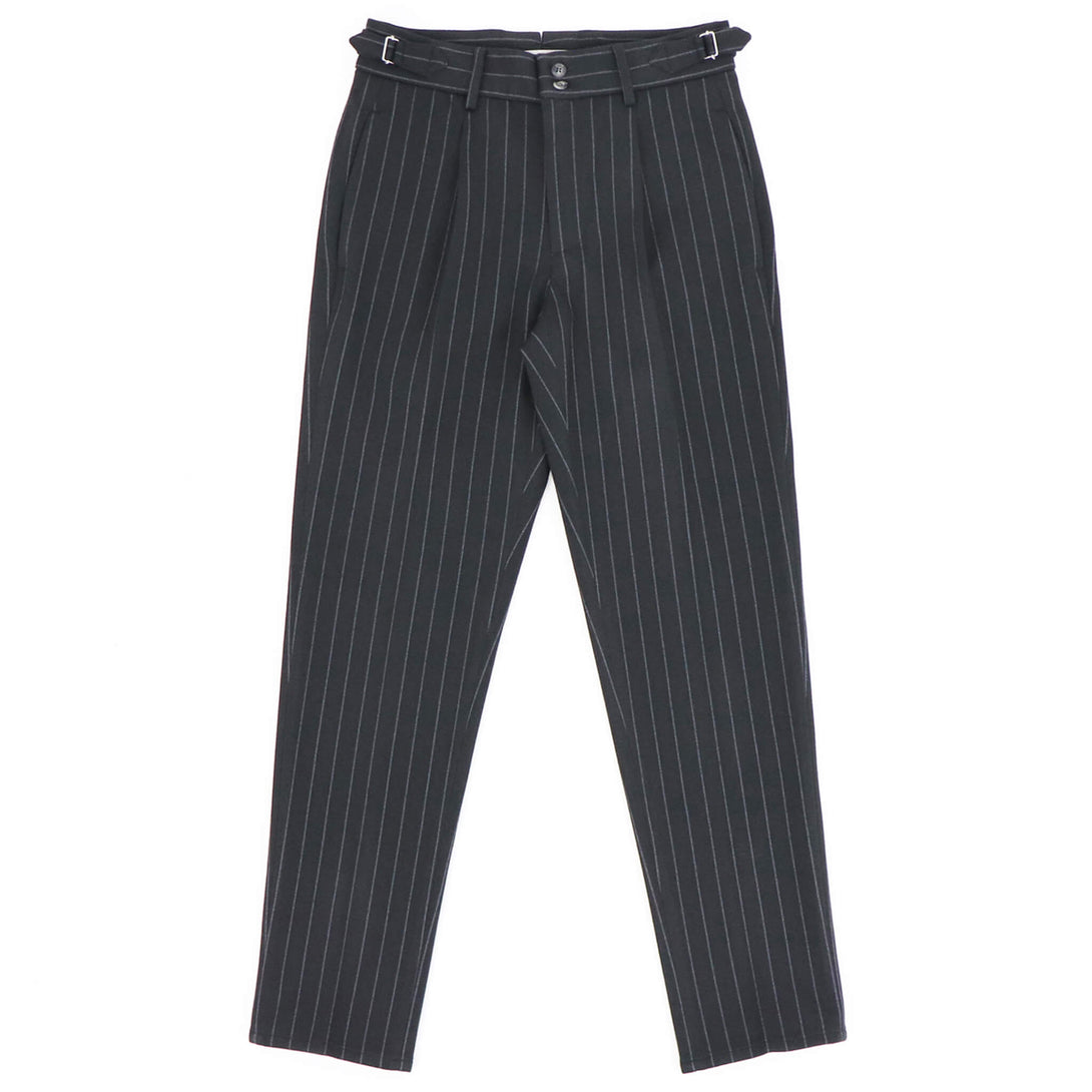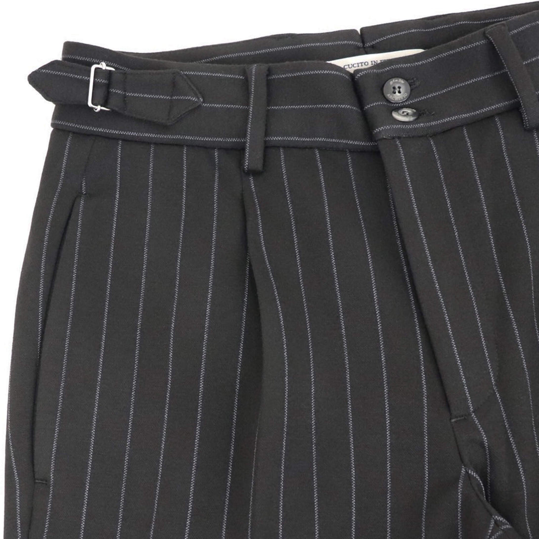 giabsの数あるモデルの中で、あまり聞き馴染みがないと思われる、VIRGILIO(ヴィルジリオ)今季は、クラシックなディテールに、機能性のあるジャージー素材を使用したモデルとなっています。ホールド感のある太めのウエスト部分に、両サイドのサイドアジャスター付き、ウエストフロント部分にはワンプリーツ、腰回りと太ももはややゆったり目のフィッティングと裾にかけてのテーパードシルエットが特徴のエレガンで美脚効果抜群のパンツとなっています。素材はgiabsと言えばのジャージー素材で、今季は特に注目のストライプ柄。スーツでは馴染みのあるチョークストライプをジャージー素材で表現。カジュアルで大人なスタイリングにキマる一本です。