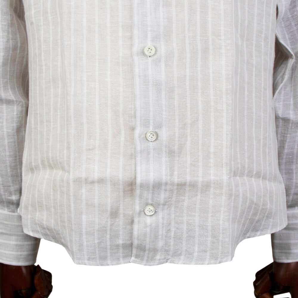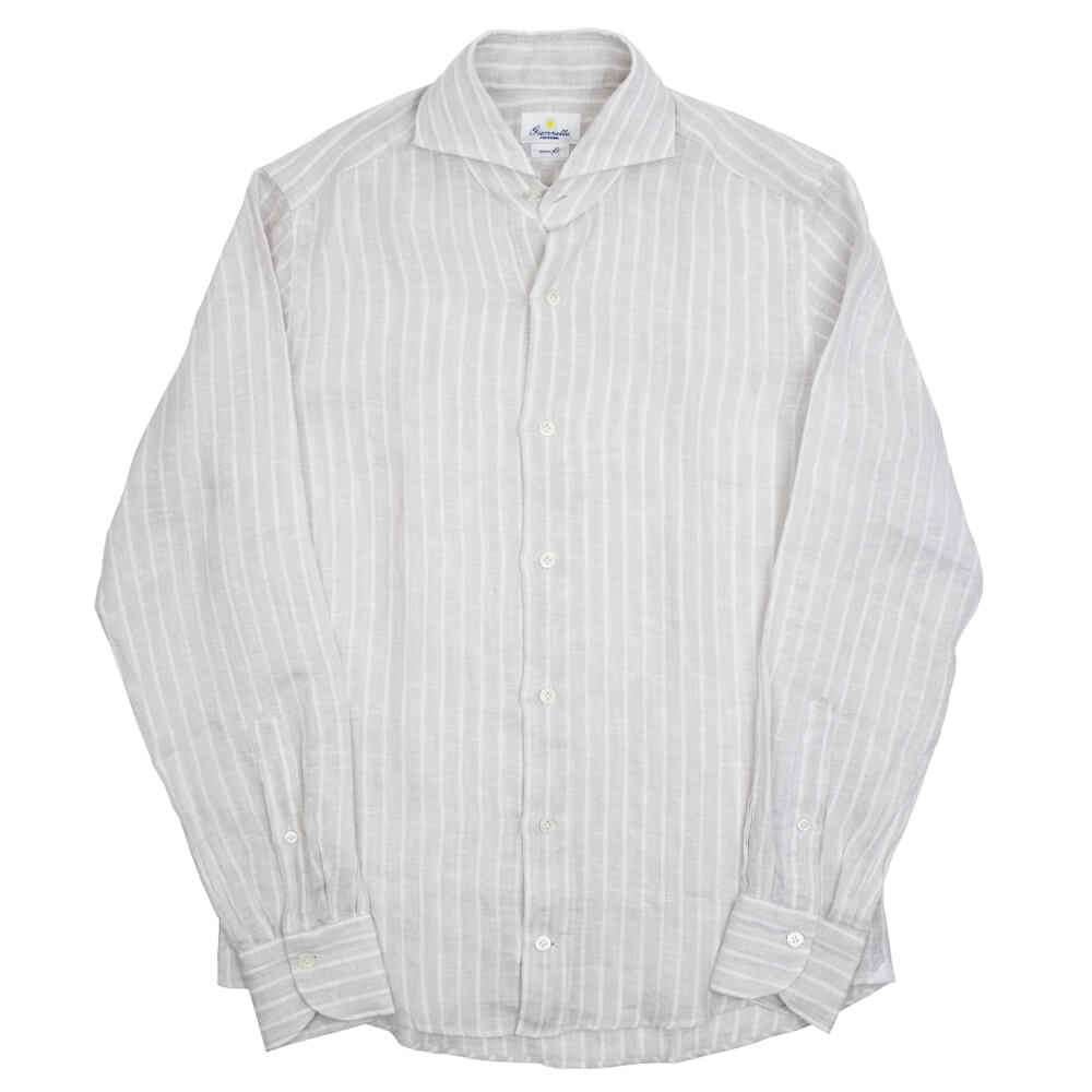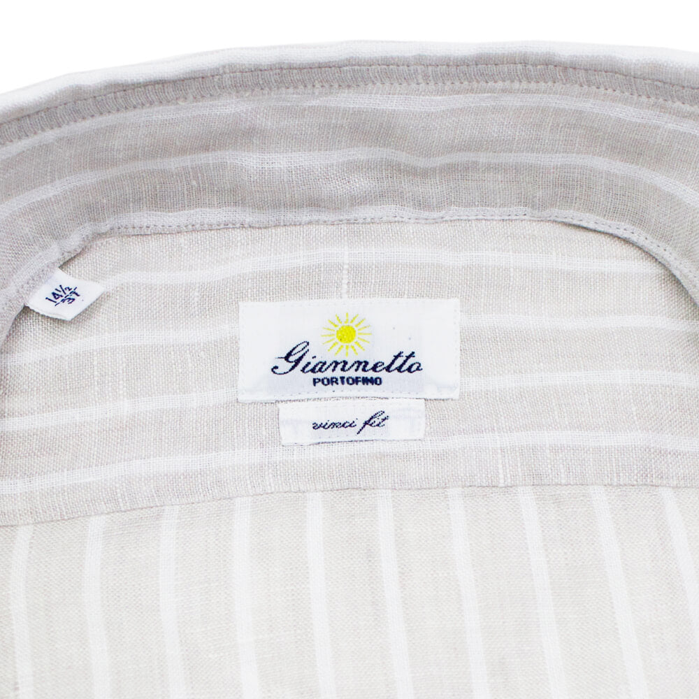 今シーズンも人気のgiannettoリネンシャツが入荷です。柔らかな雰囲気を作り上げるベージュカラーのストライプシャツ。襟型はジャケットスタイルと良く合うワイドカラースタイルで、ノータイスタイルが良く合うジャケットスタイルの為の一枚。リネン素材のストライプならではのリゾート感とブラウンカラーの持つ柔らかな印象が上手くミックスされた1枚となっています。サイズ感は、ヴィンチフィットを採用していますので、着丈を出しての着用が決まる仕上がりとなっています。
