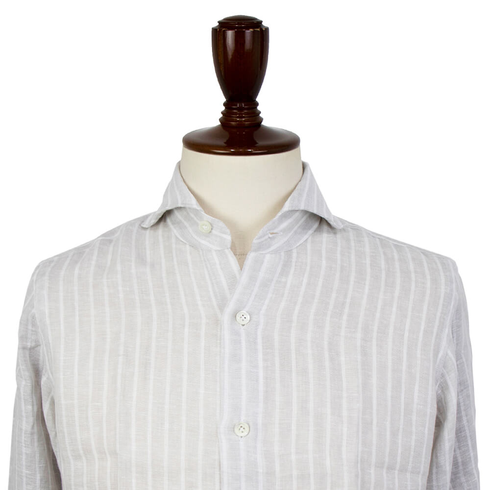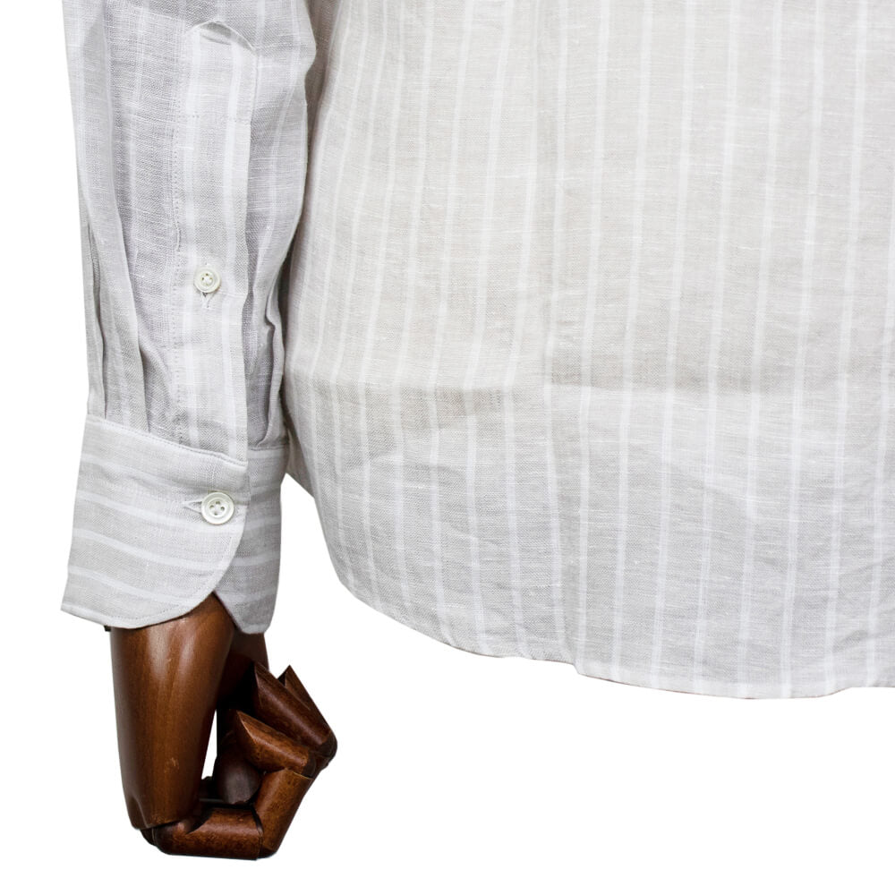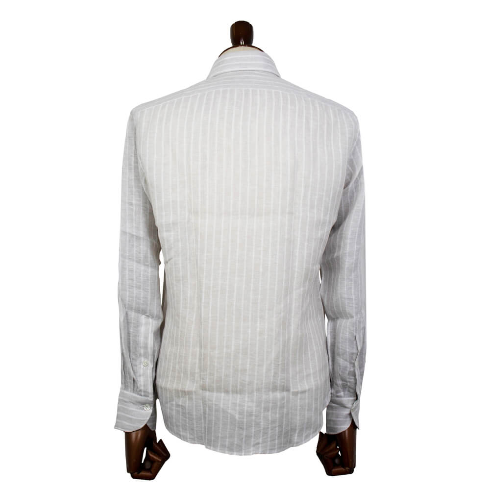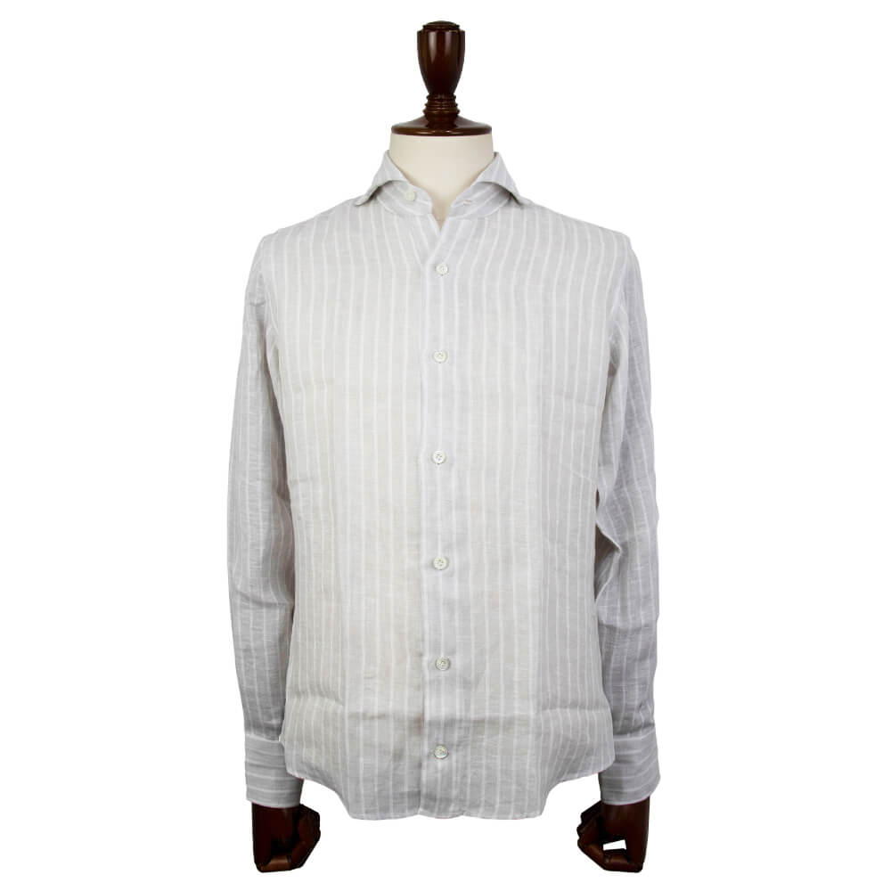 今シーズンも人気のgiannettoリネンシャツが入荷です。柔らかな雰囲気を作り上げるベージュカラーのストライプシャツ。襟型はジャケットスタイルと良く合うワイドカラースタイルで、ノータイスタイルが良く合うジャケットスタイルの為の一枚。リネン素材のストライプならではのリゾート感とブラウンカラーの持つ柔らかな印象が上手くミックスされた1枚となっています。サイズ感は、ヴィンチフィットを採用していますので、着丈を出しての着用が決まる仕上がりとなっています。
